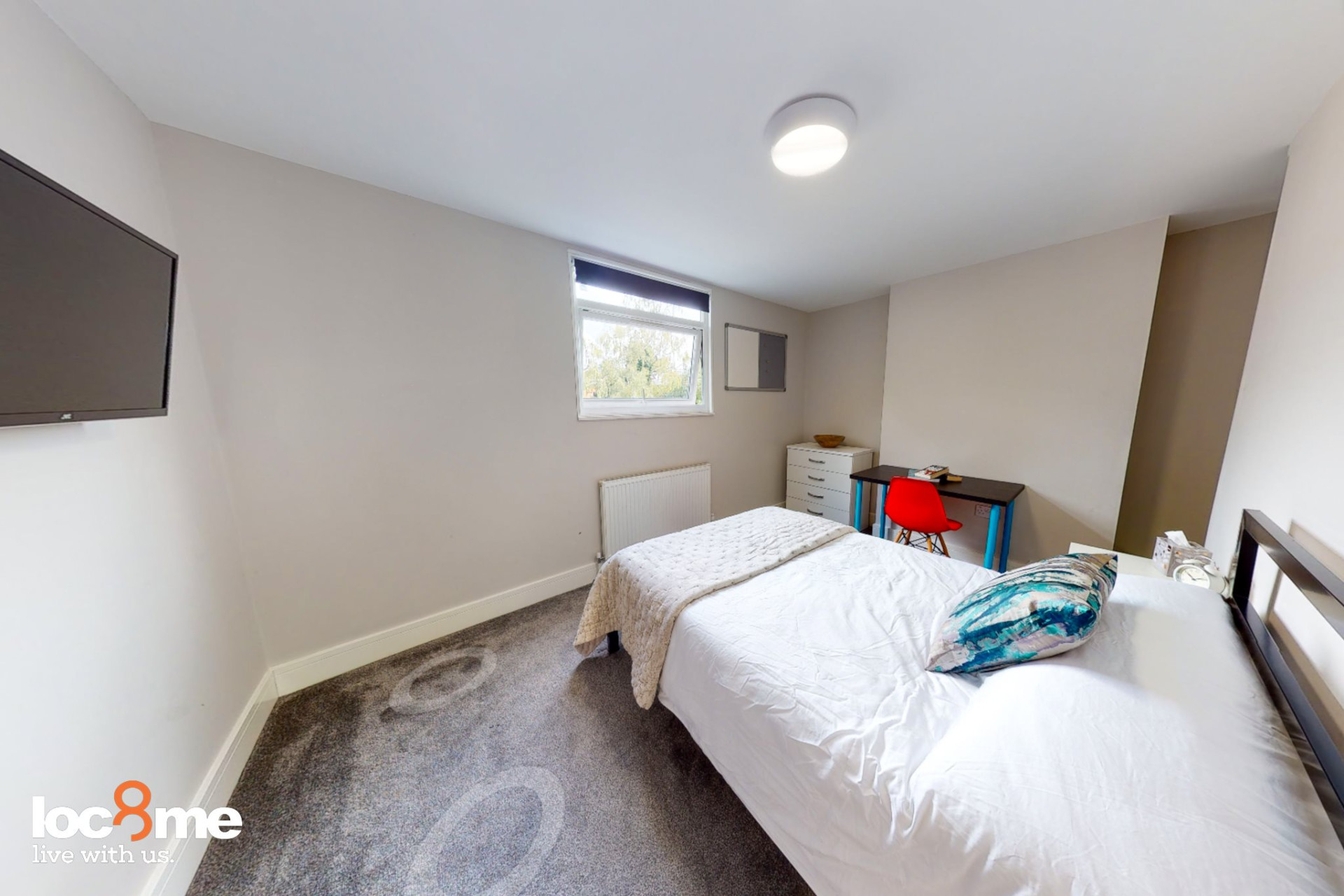 - Bedroom furniture: bed, desk, desk chair, wardrobe, and drawers