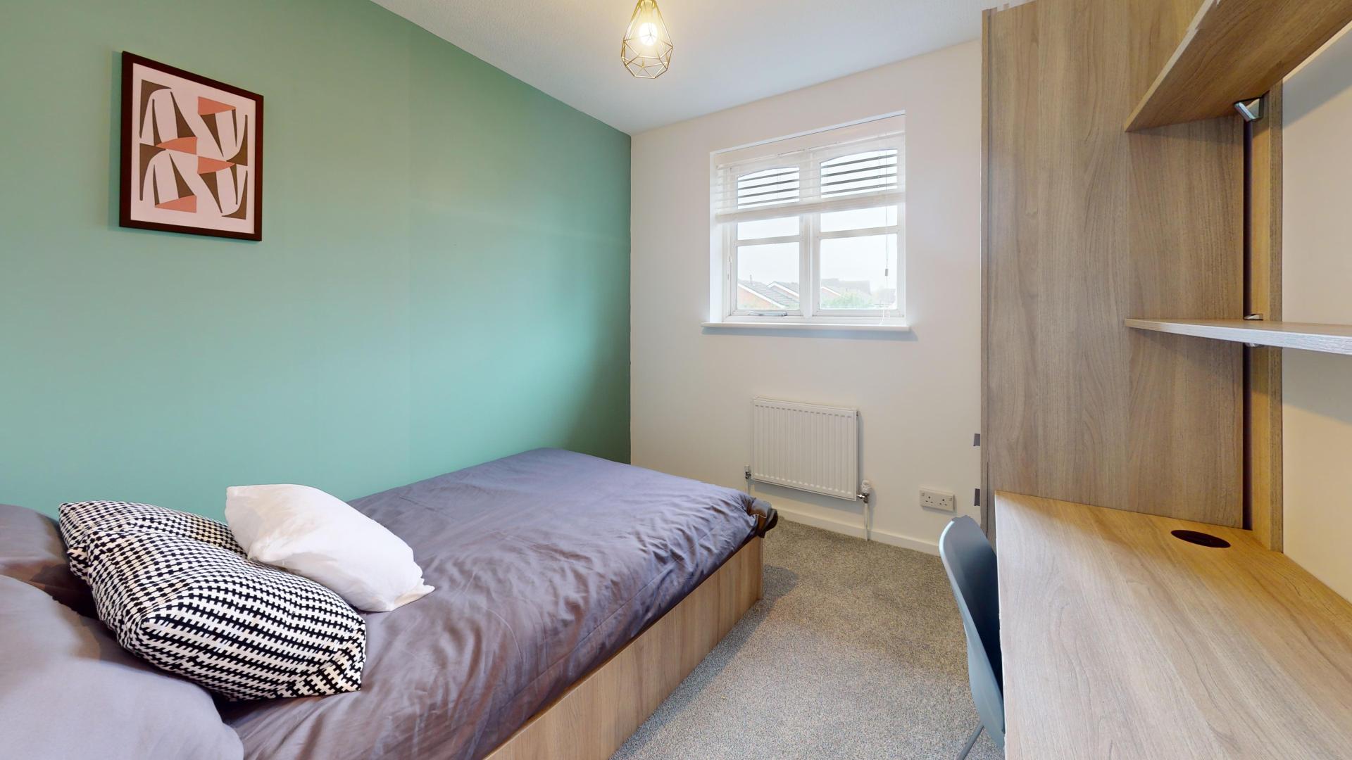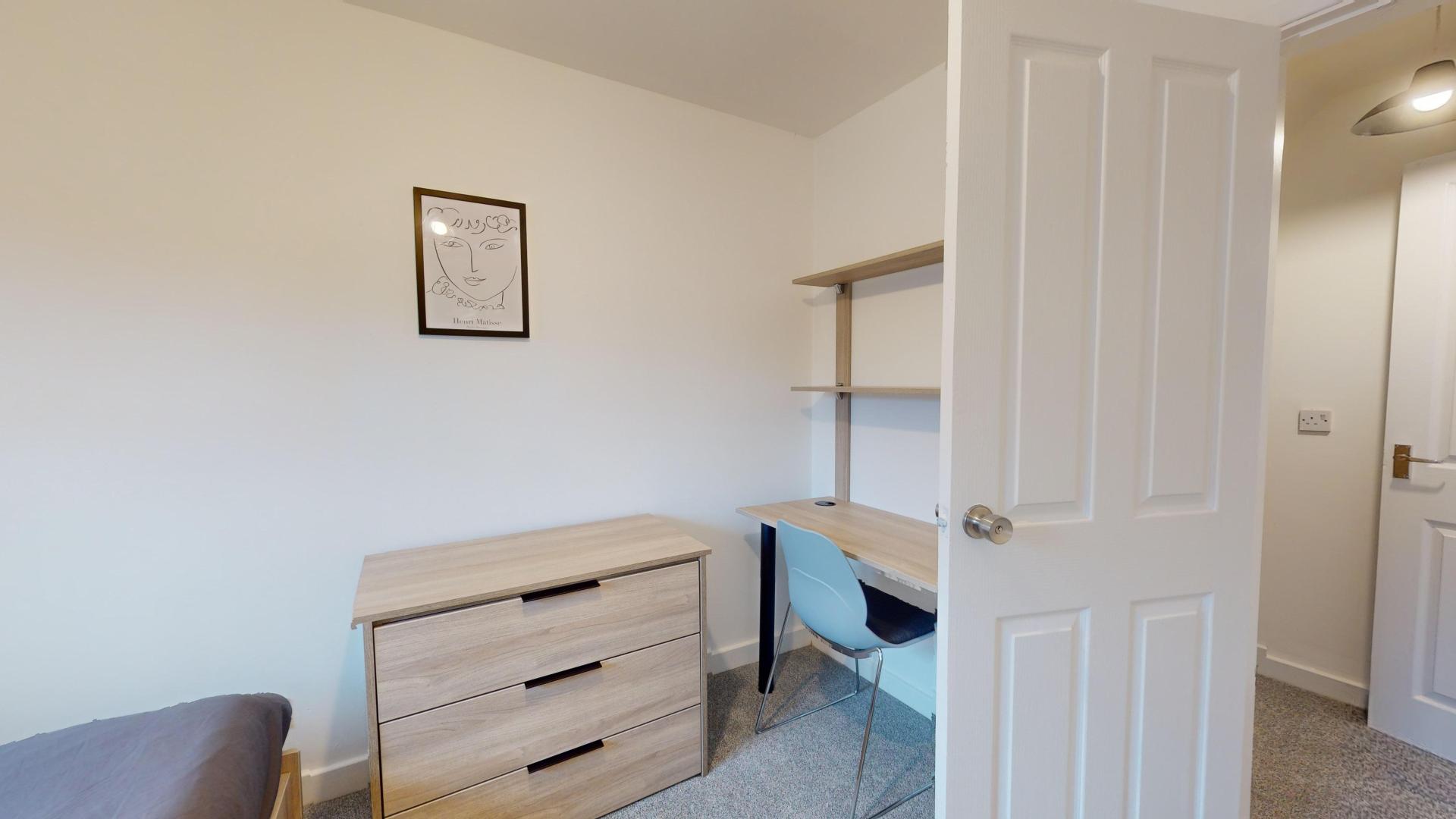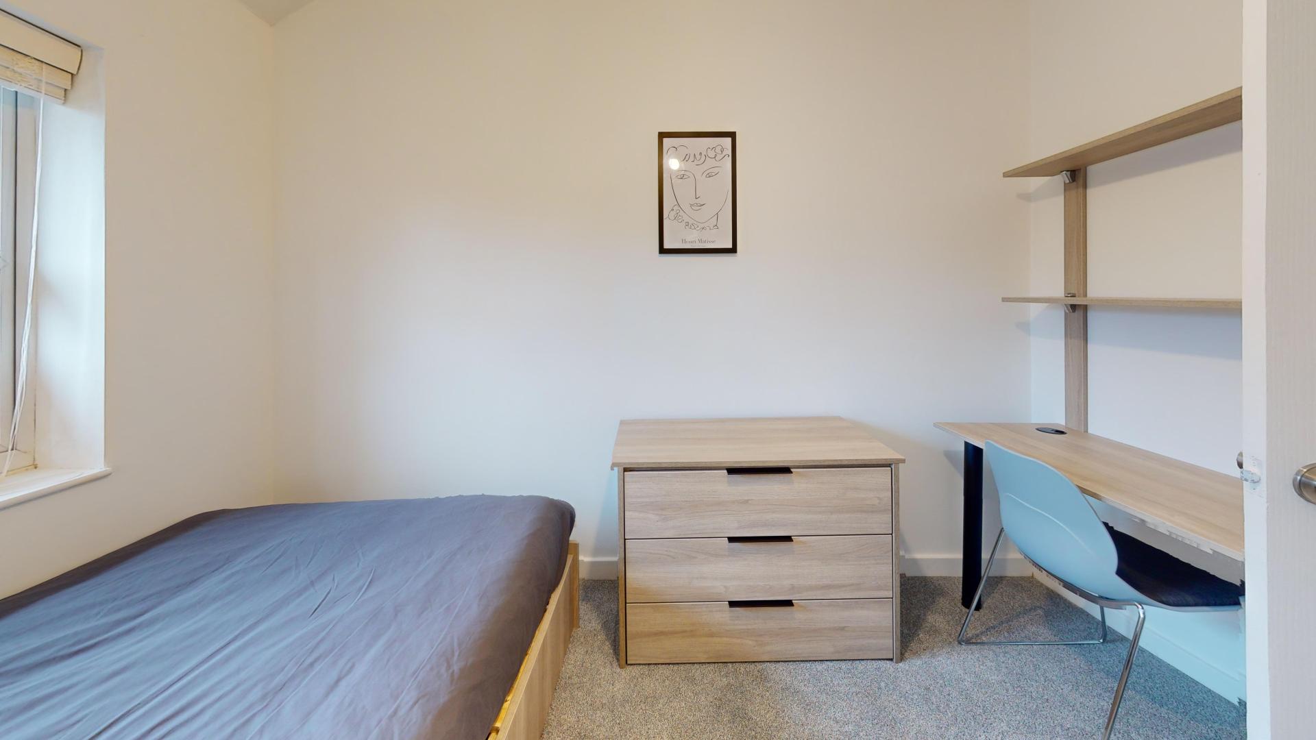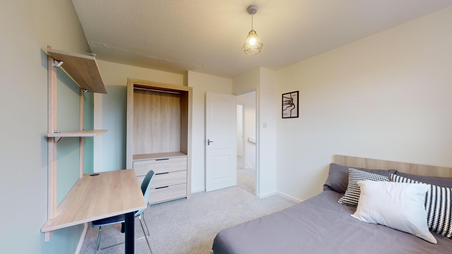 - Bedroom furniture: bed, desk, desk chair, wardrobe, and drawers