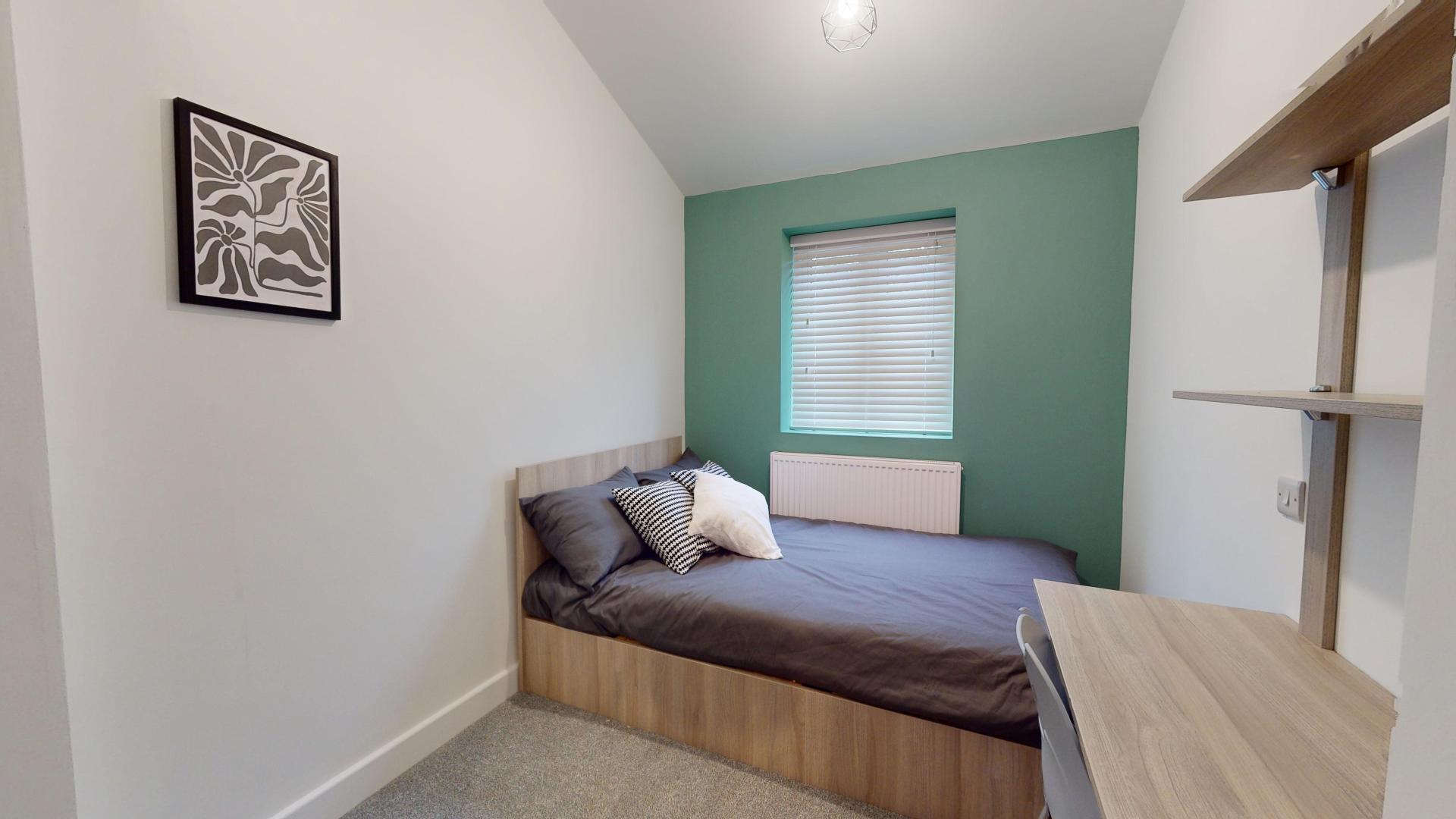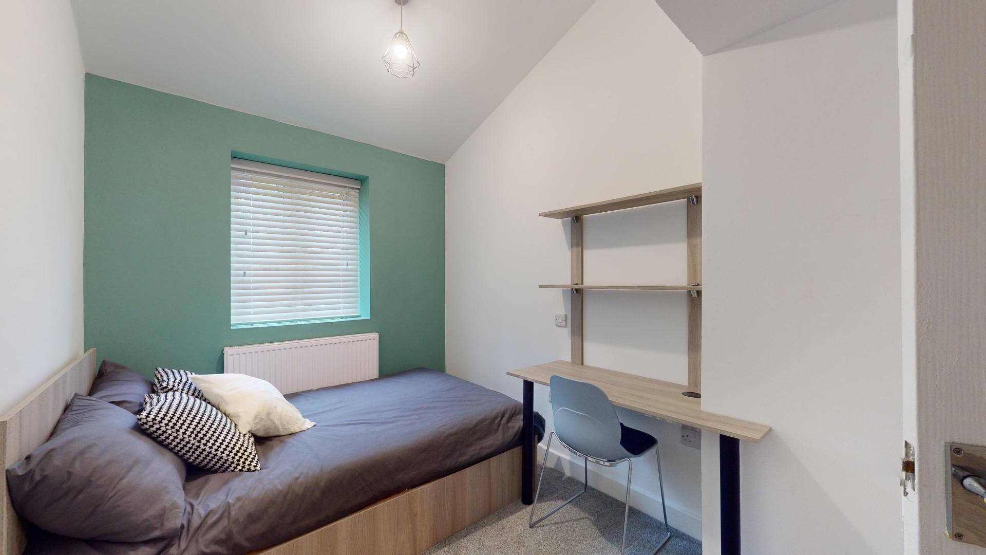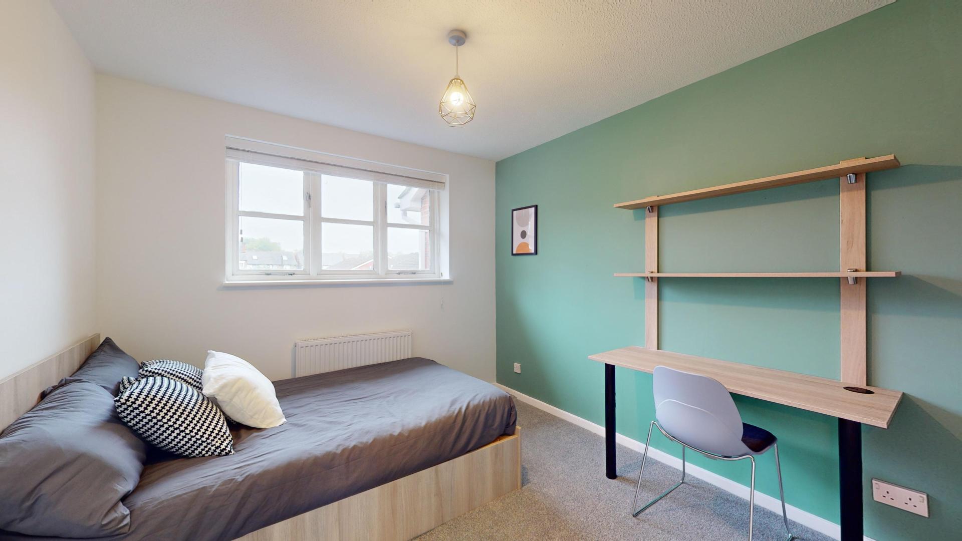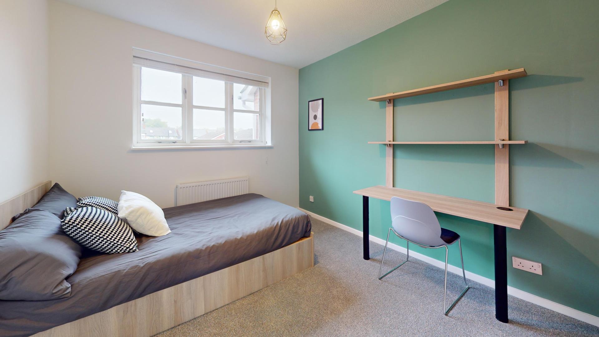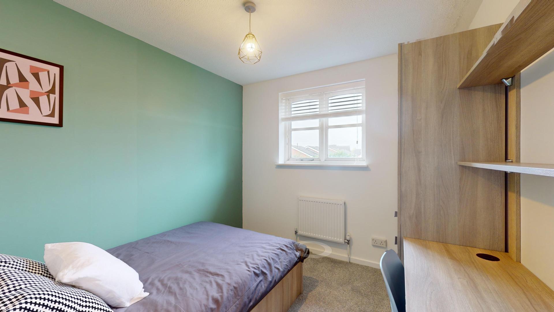 - Bedroom furniture: bed, desk, desk chair, wardrobe, and drawers