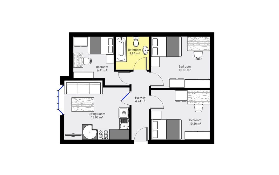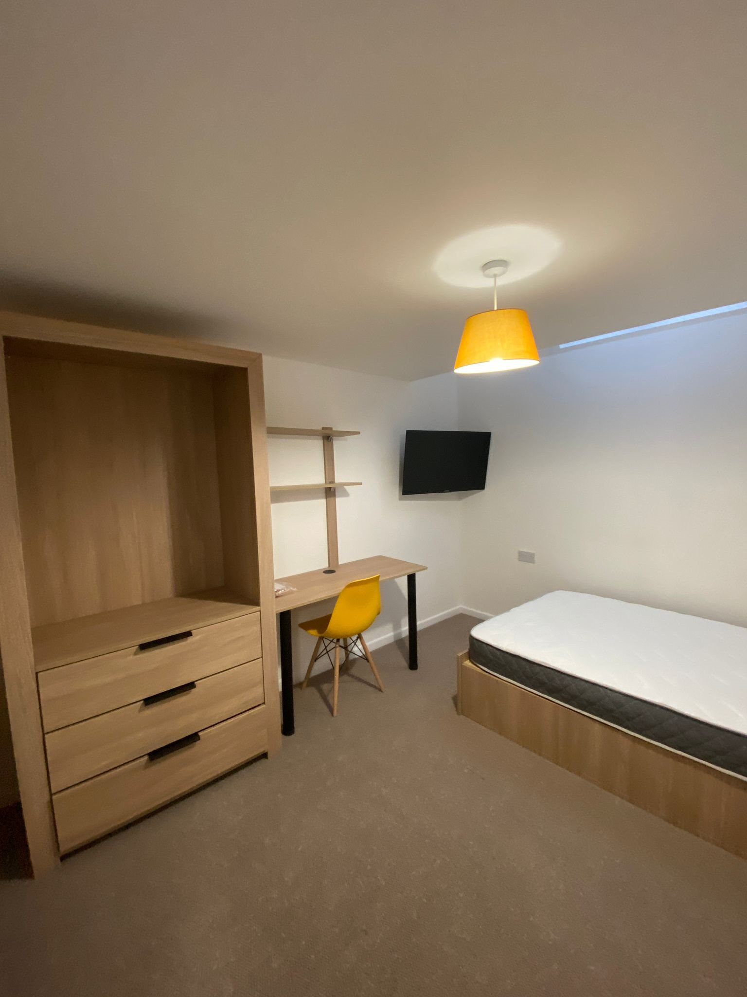 - Bedroom furniture: bed, desk, desk chair, wardrobe, and drawers