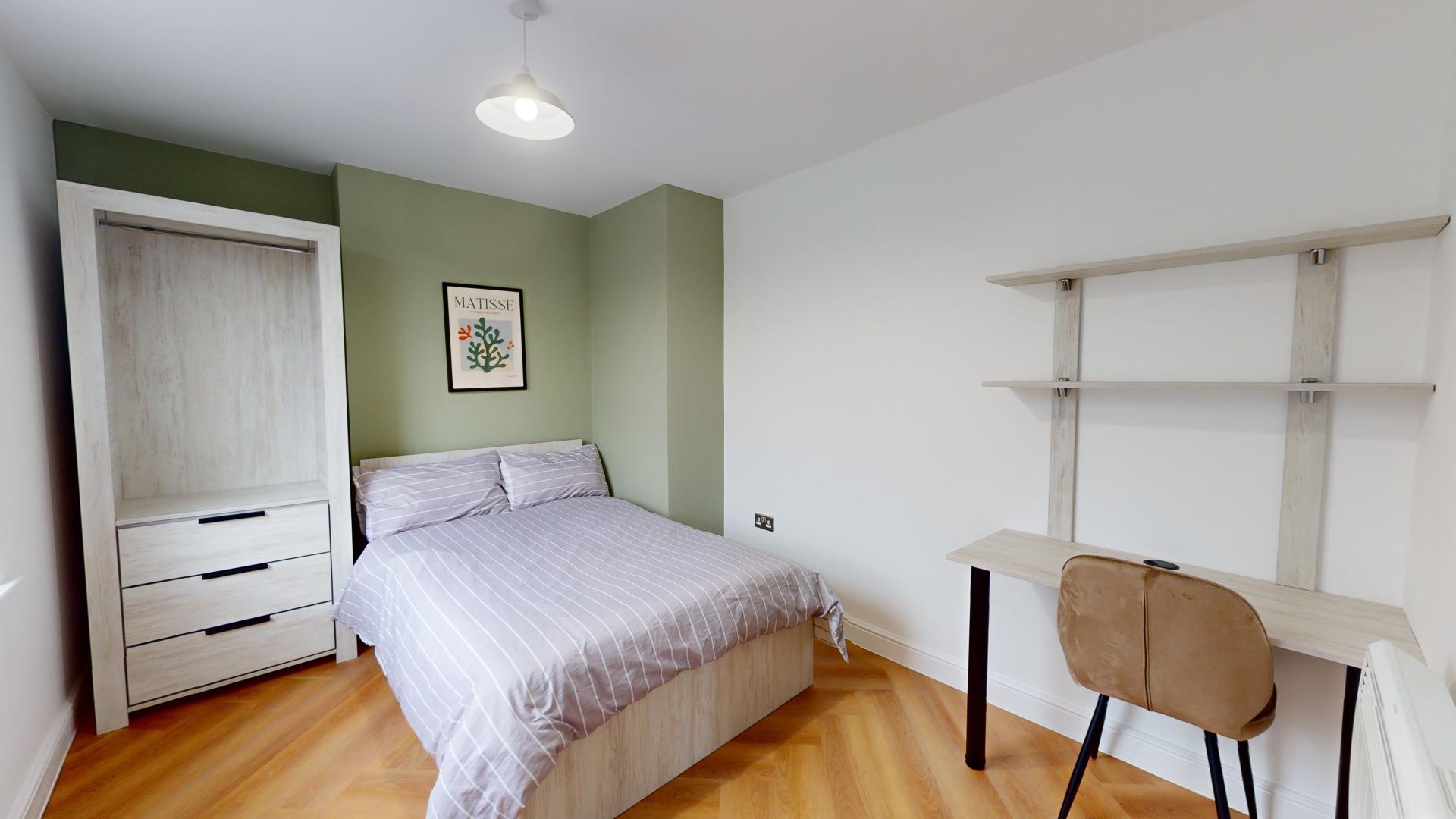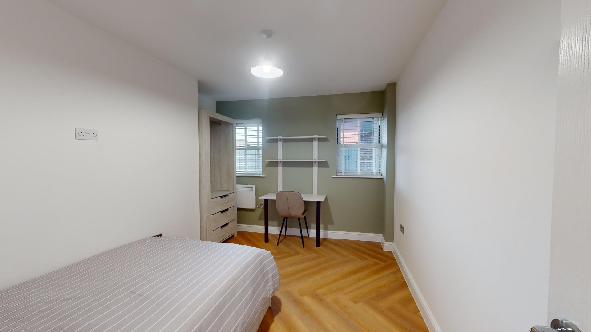 - Bedroom furniture: bed, desk, desk chair, wardrobe, and drawers