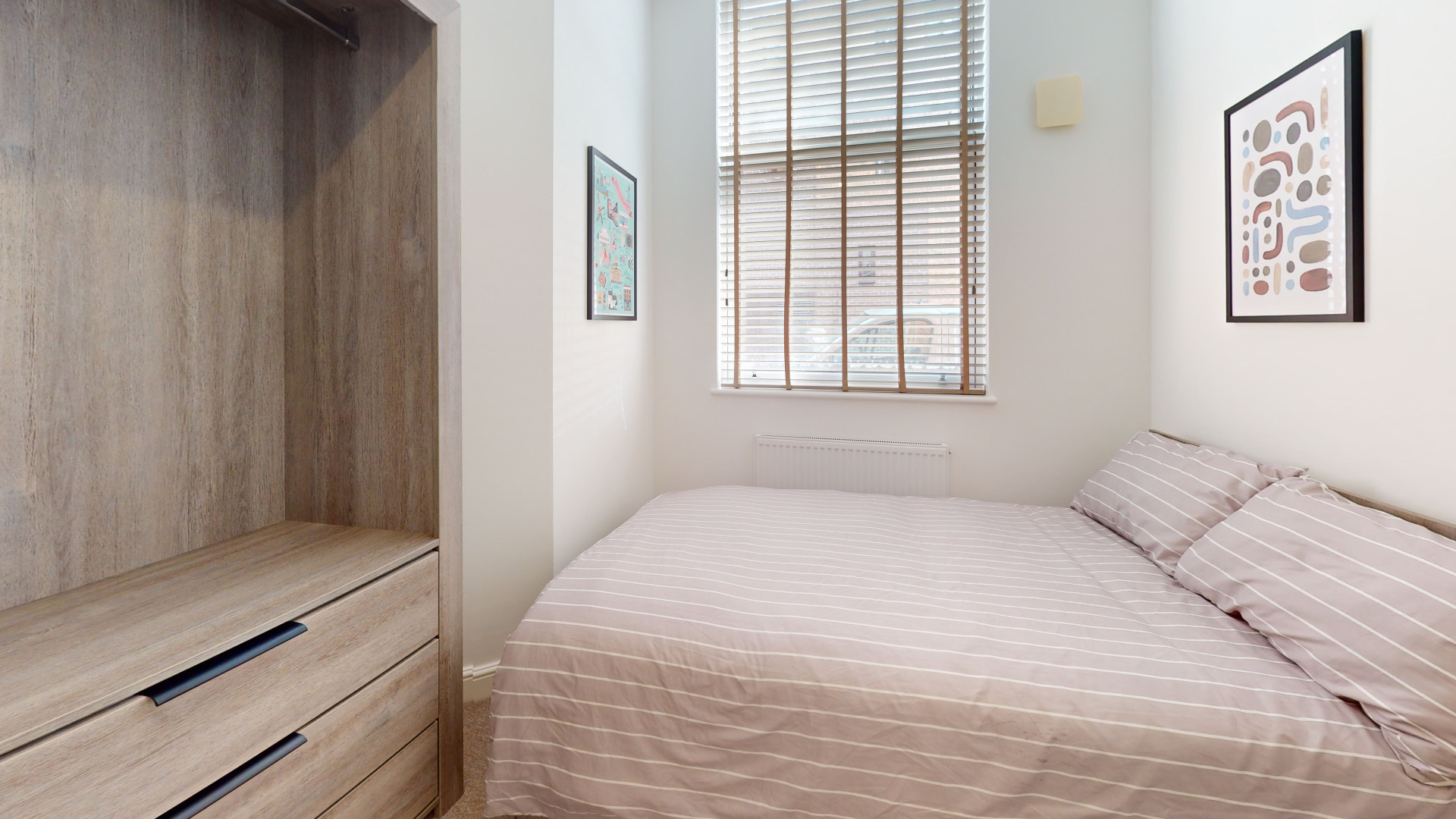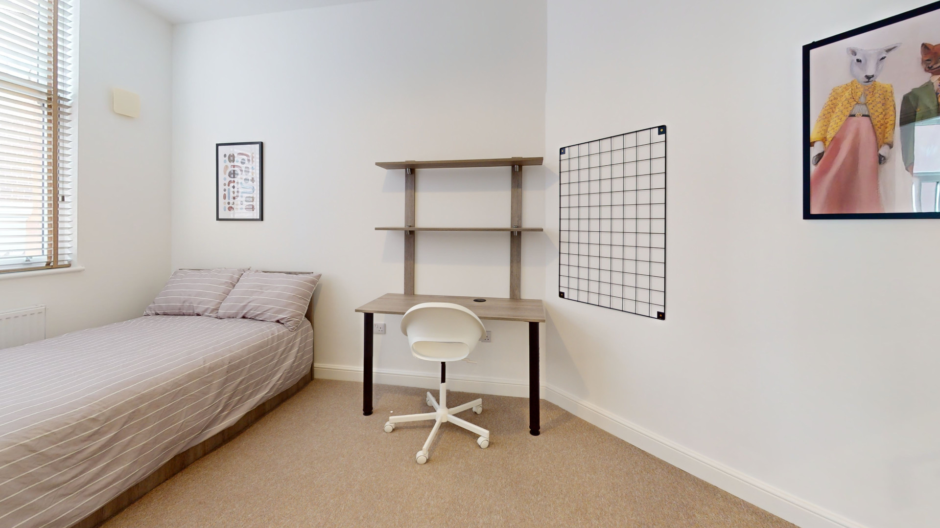 - Bedroom furniture: bed, desk, desk chair, wardrobe, and drawers