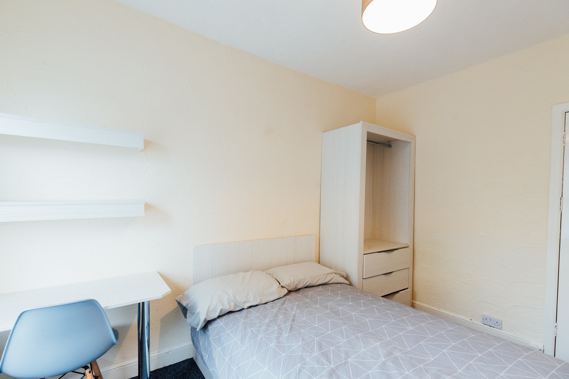 - Bedroom furniture: bed, desk, desk chair, wardrobe, and drawers