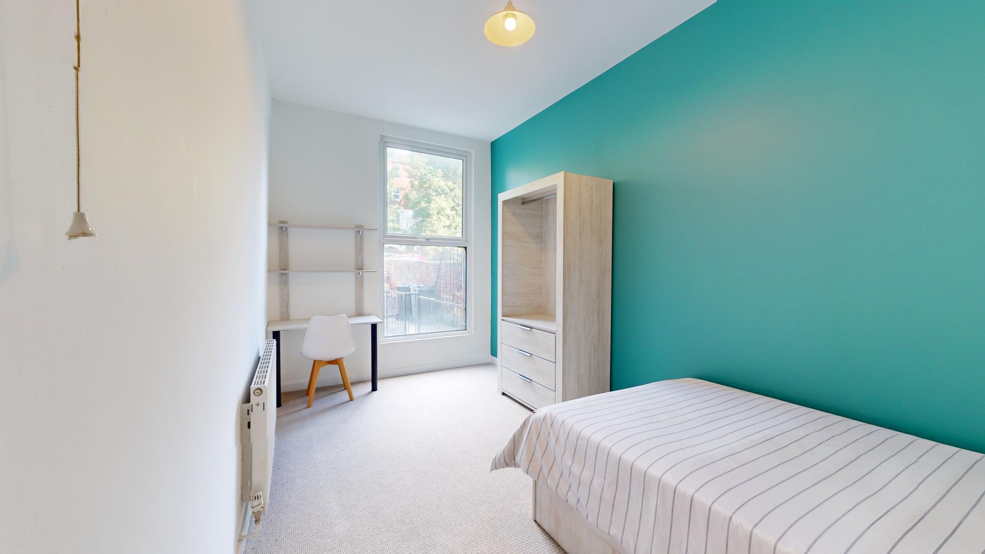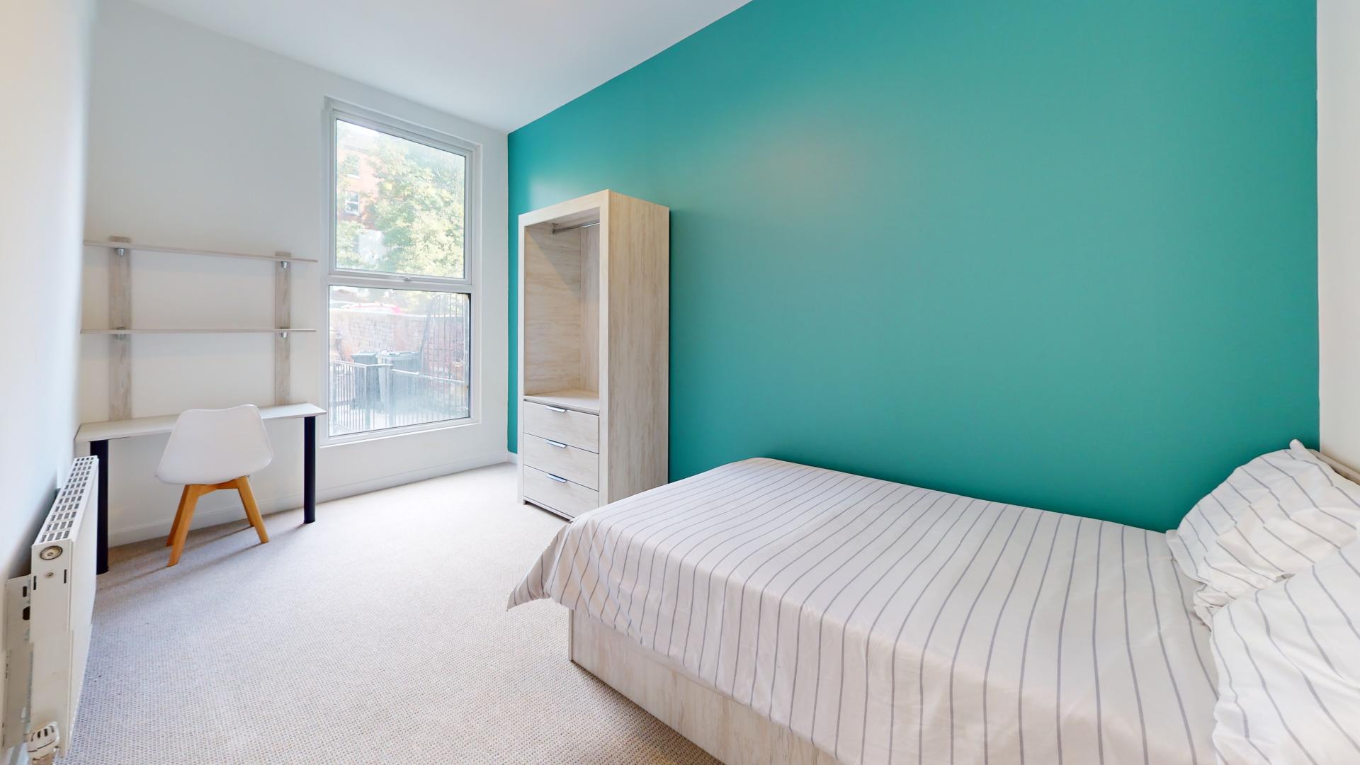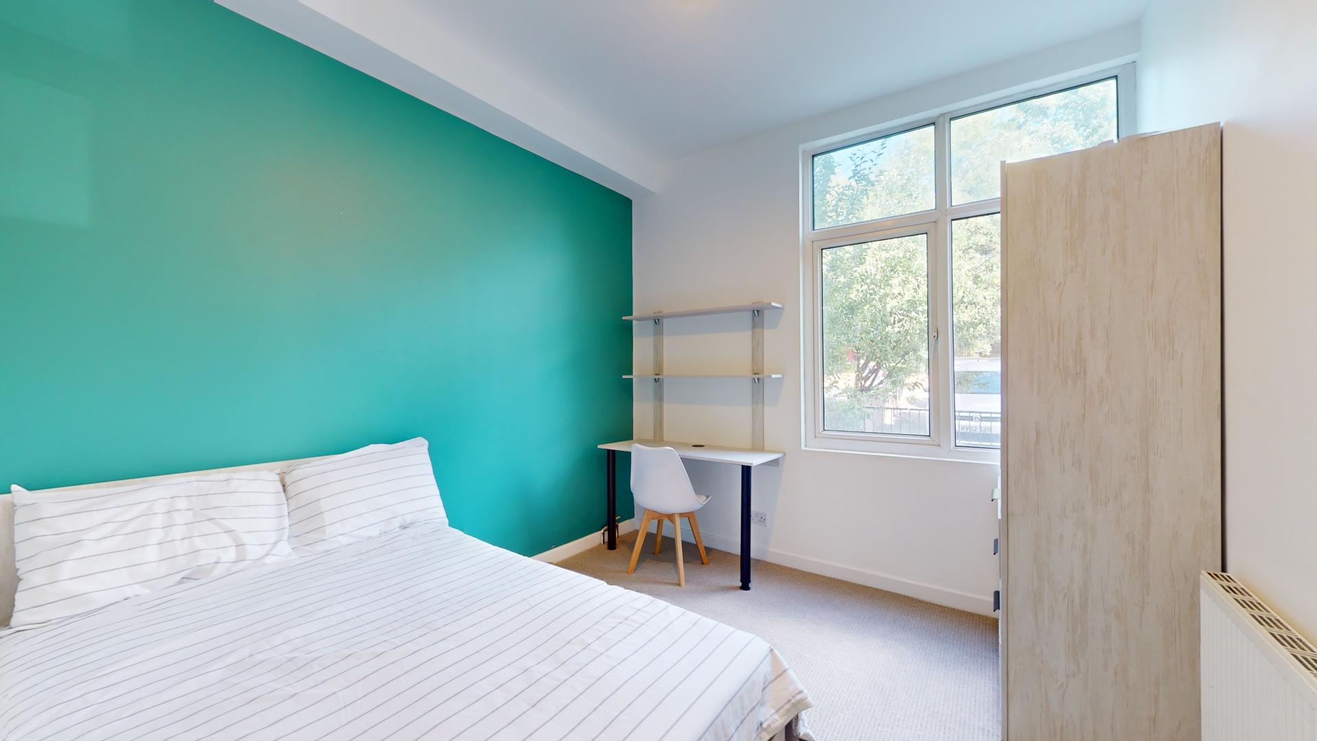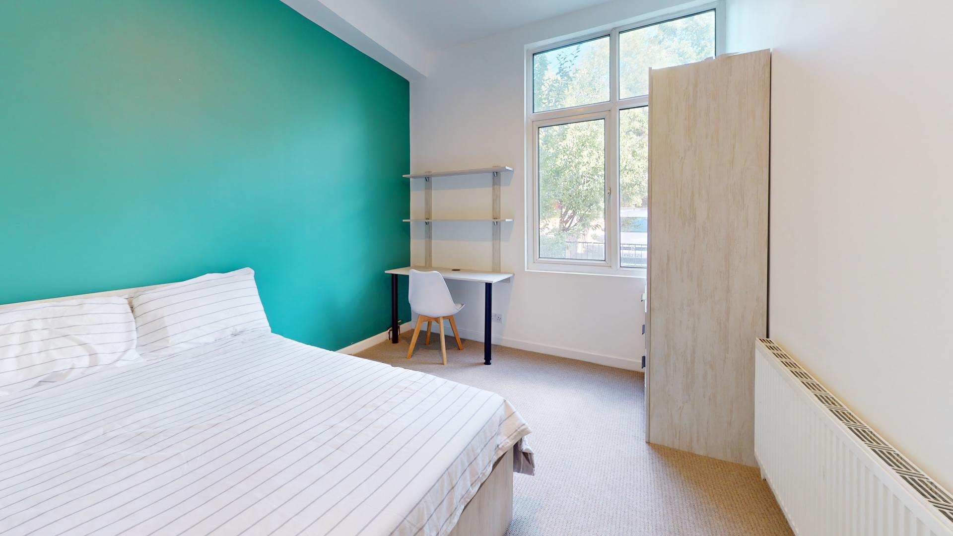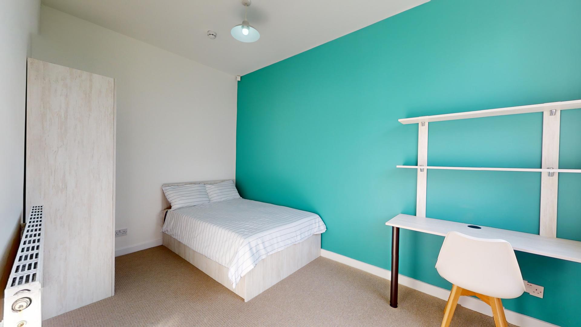 - Bedroom furniture: bed, desk, desk chair, wardrobe, and drawers