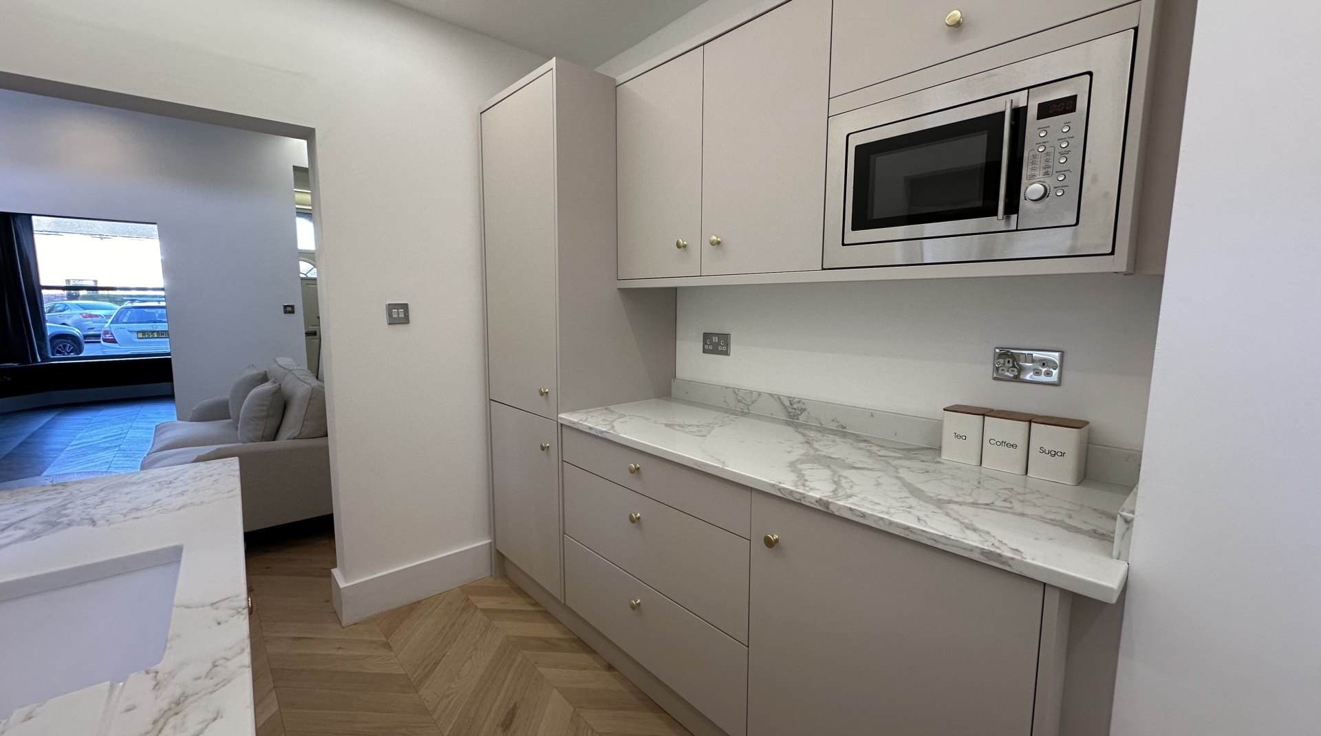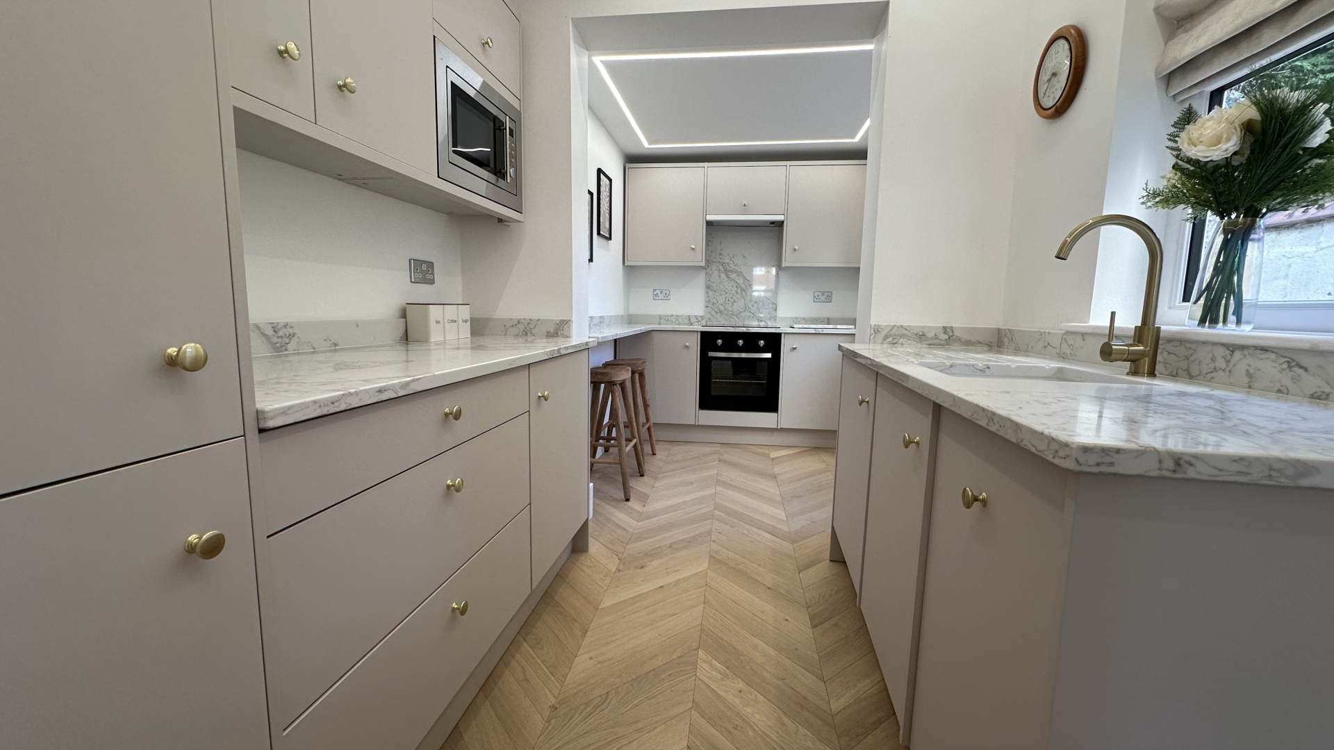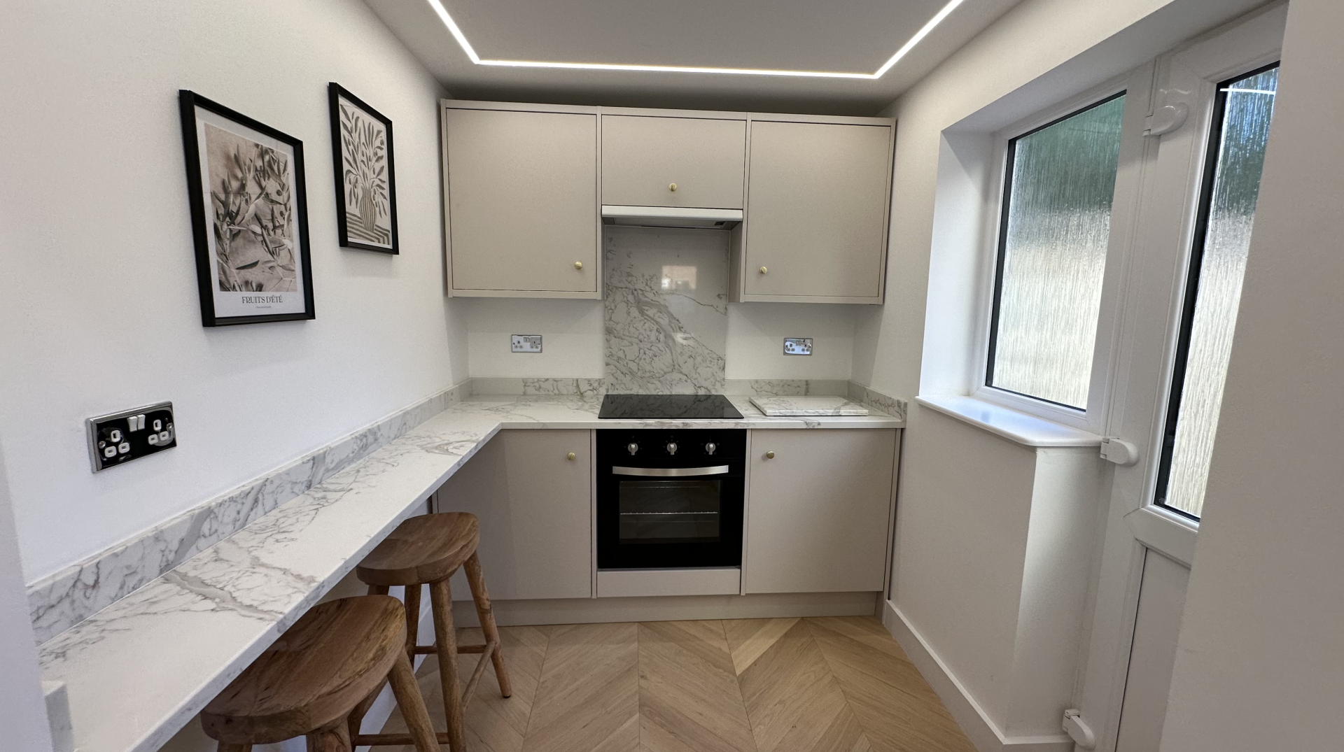 Modern Kitchen – marble-effect counters, integrated appliances, and breakfast bar