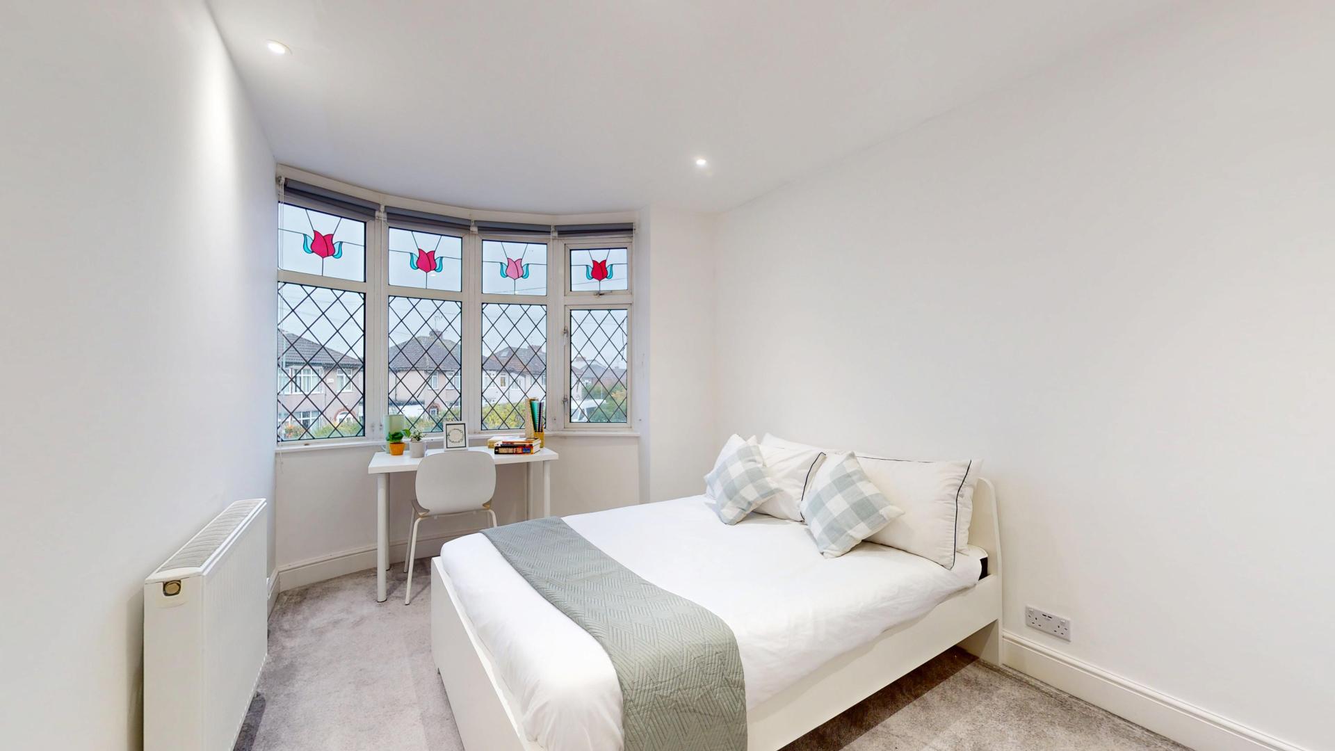 - Bedroom furniture: bed, desk, desk chair, wardrobe, and drawers