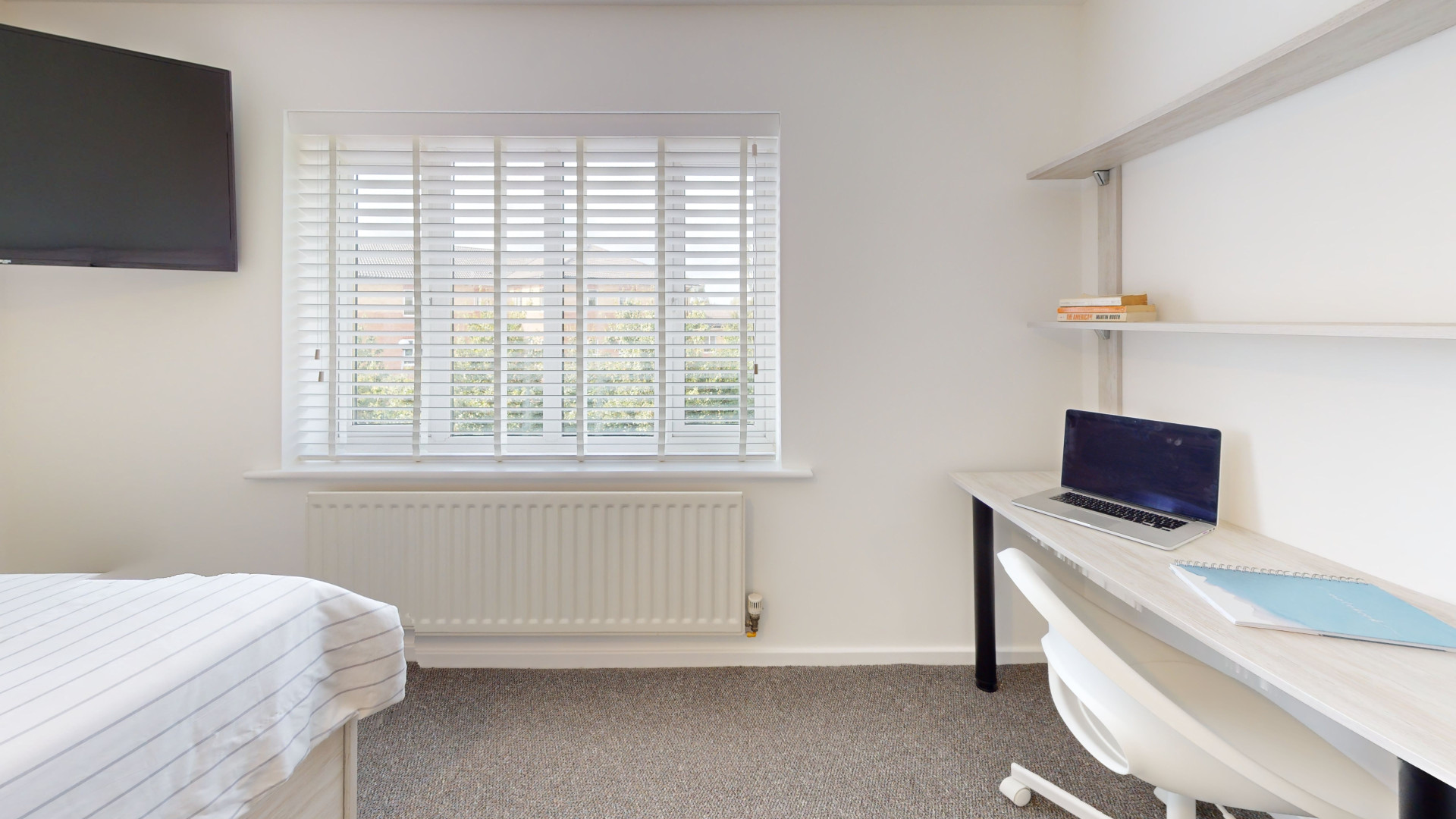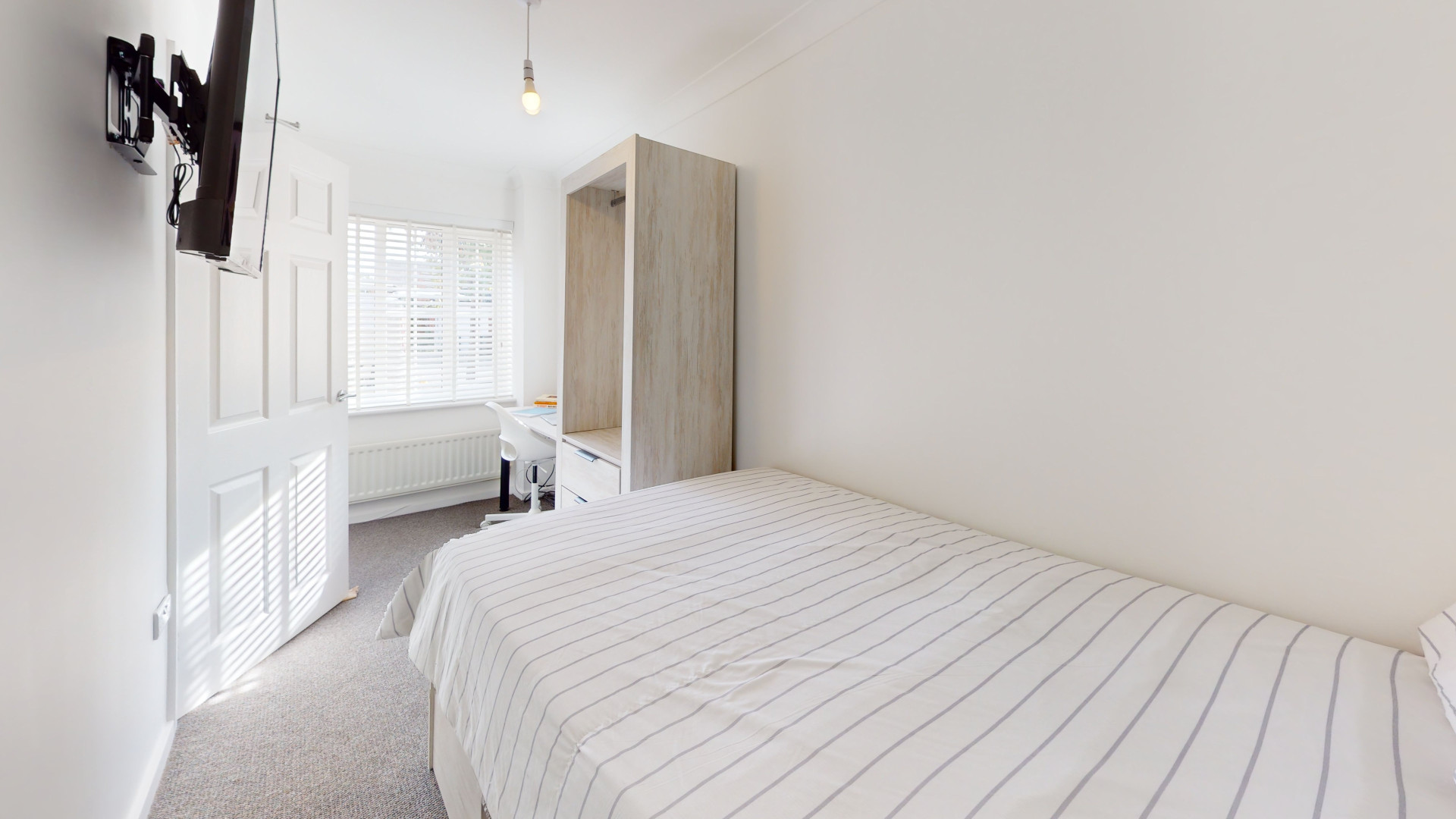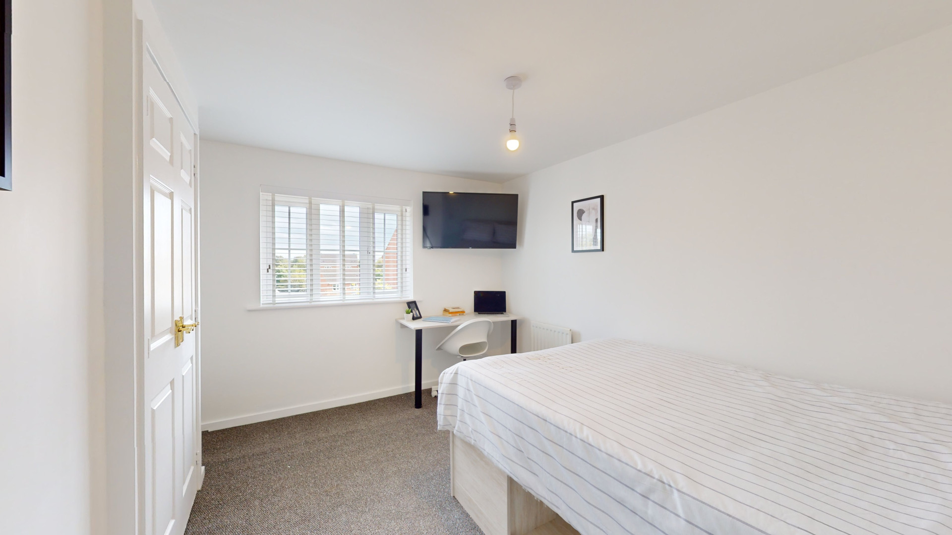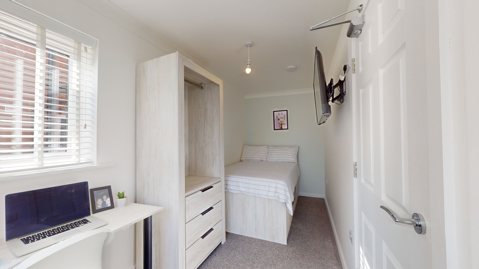 - Bedroom furniture: bed, desk, desk chair, wardrobe, and drawers
