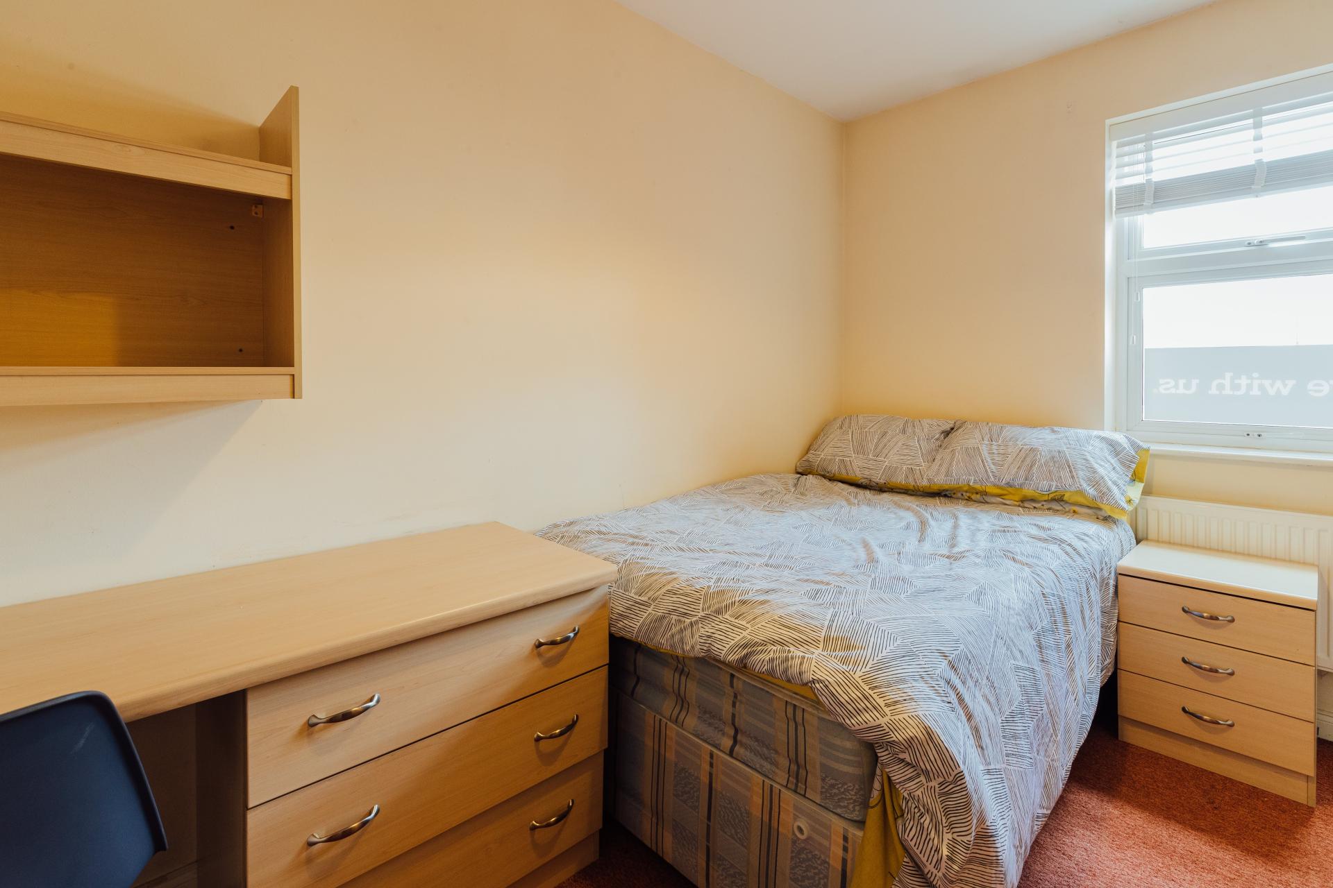 - Bedroom furniture: bed, desk, desk chair, wardrobe, and drawers