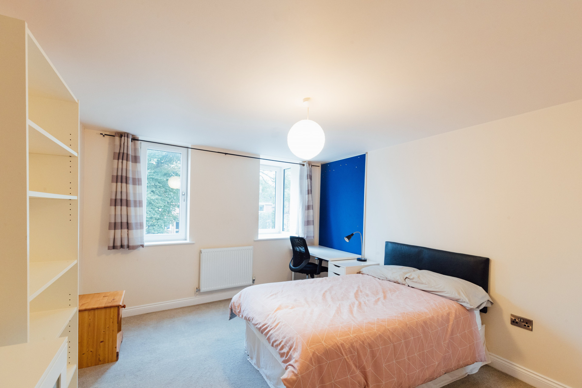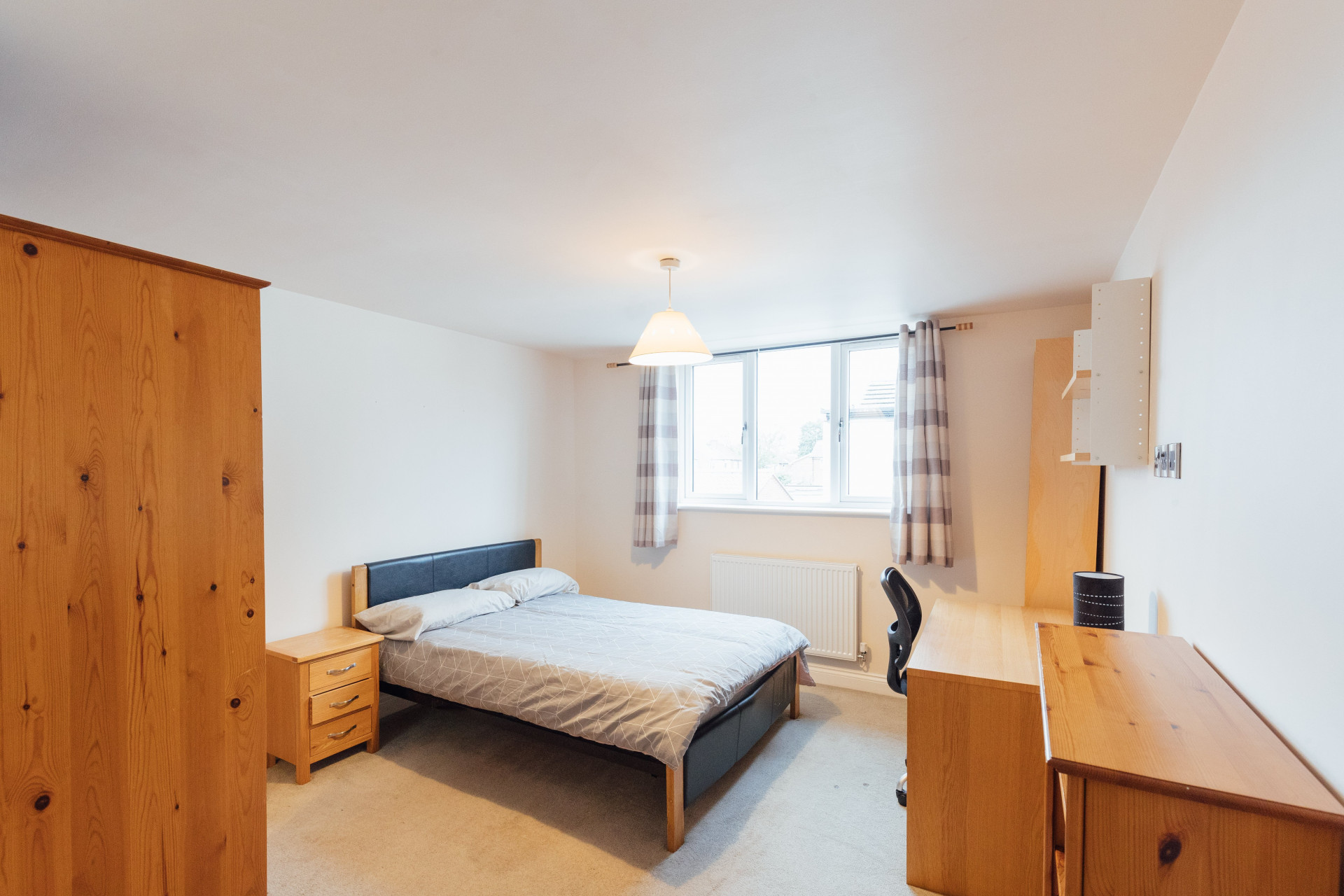 - Bedroom furniture: bed, desk, desk chair, wardrobe, and drawers