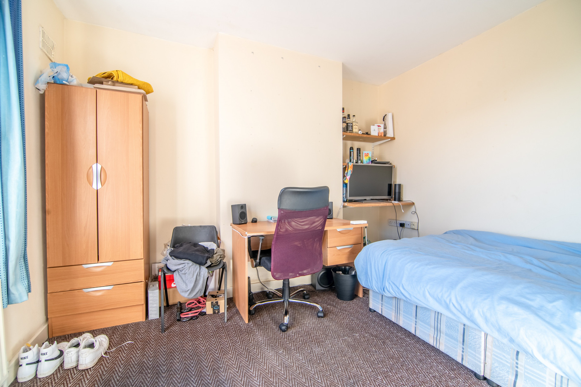- Bedroom furniture: bed, desk, desk chair, wardrobe, and drawers