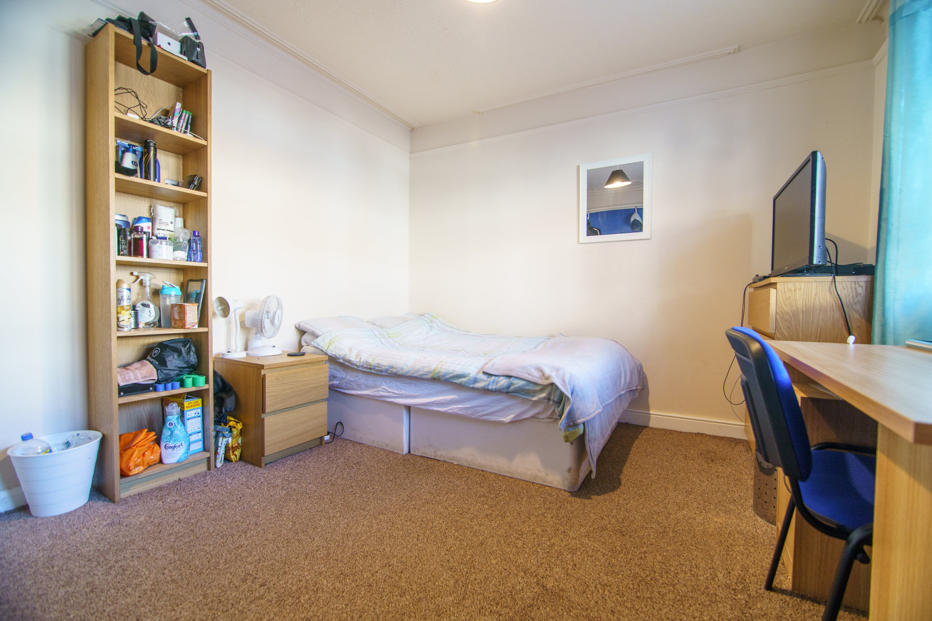 - Bedroom furniture: bed, desk, desk chair, wardrobe, and drawers