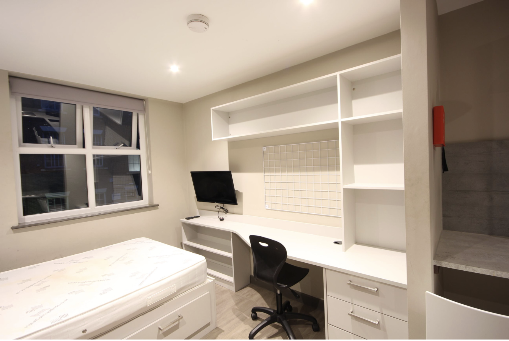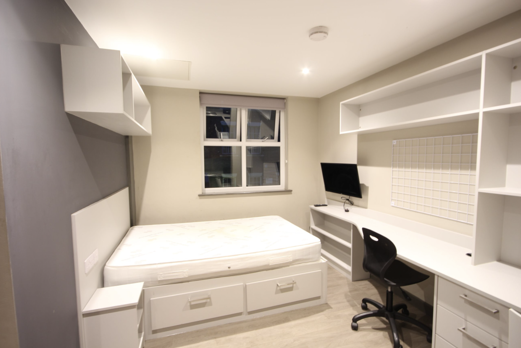This stylish studio is situated in a block of flats, all managed by Loc8me, with the communal spaces being regularly maintained. This property is an ideal environment for students looking to study in a quiet and central location. The studios have been designed with maximising living and workspace in mind, making it the perfect choice for those wishing to be in a central location, with large rooms, without sacrificing their budget. The room is equipped with a desk, chair, kitchen, TV, and a double bed with storage!