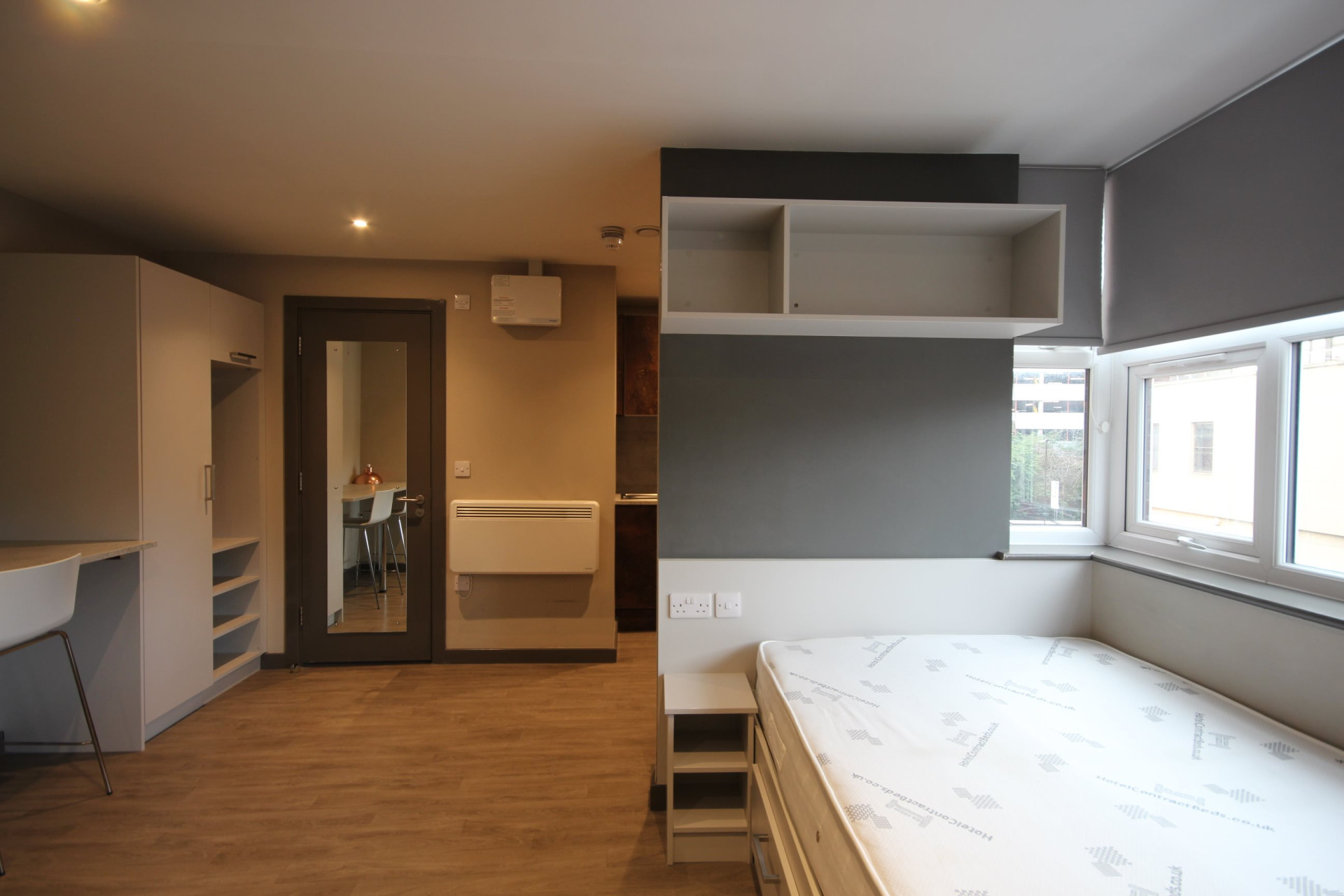 This stylish studio is situated in a block of flats, all managed by Loc8me, with the communal spaces being regularly maintained. This property is an ideal environment for students looking to study in a quiet and central location. The studios have been designed with maximising living and workspace in mind, making it the perfect choice for those wishing to be in a central location, with large rooms, without sacrificing their budget. The room is equipped with a desk, chair, kitchen, TV, and a double bed with storage!