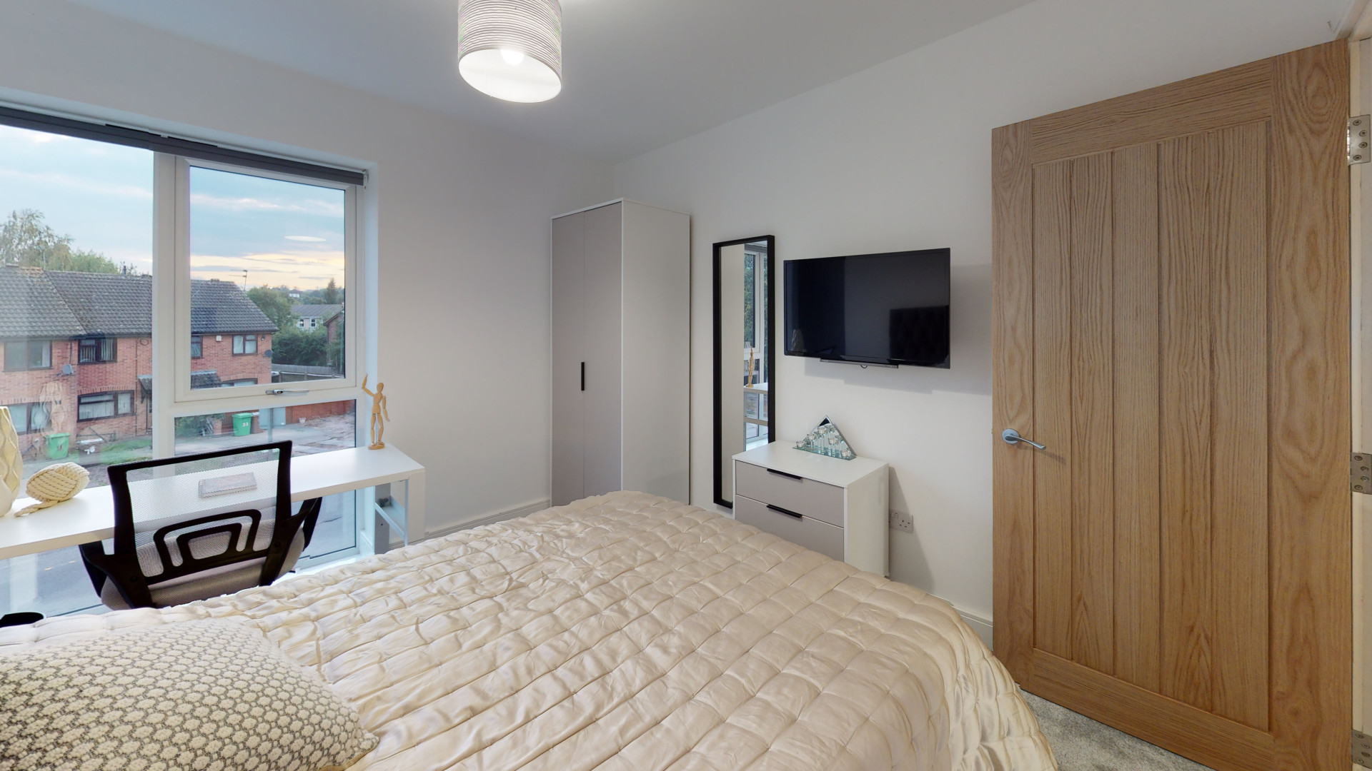 - Bedroom furniture: bed, desk, desk chair, wardrobe, and drawers