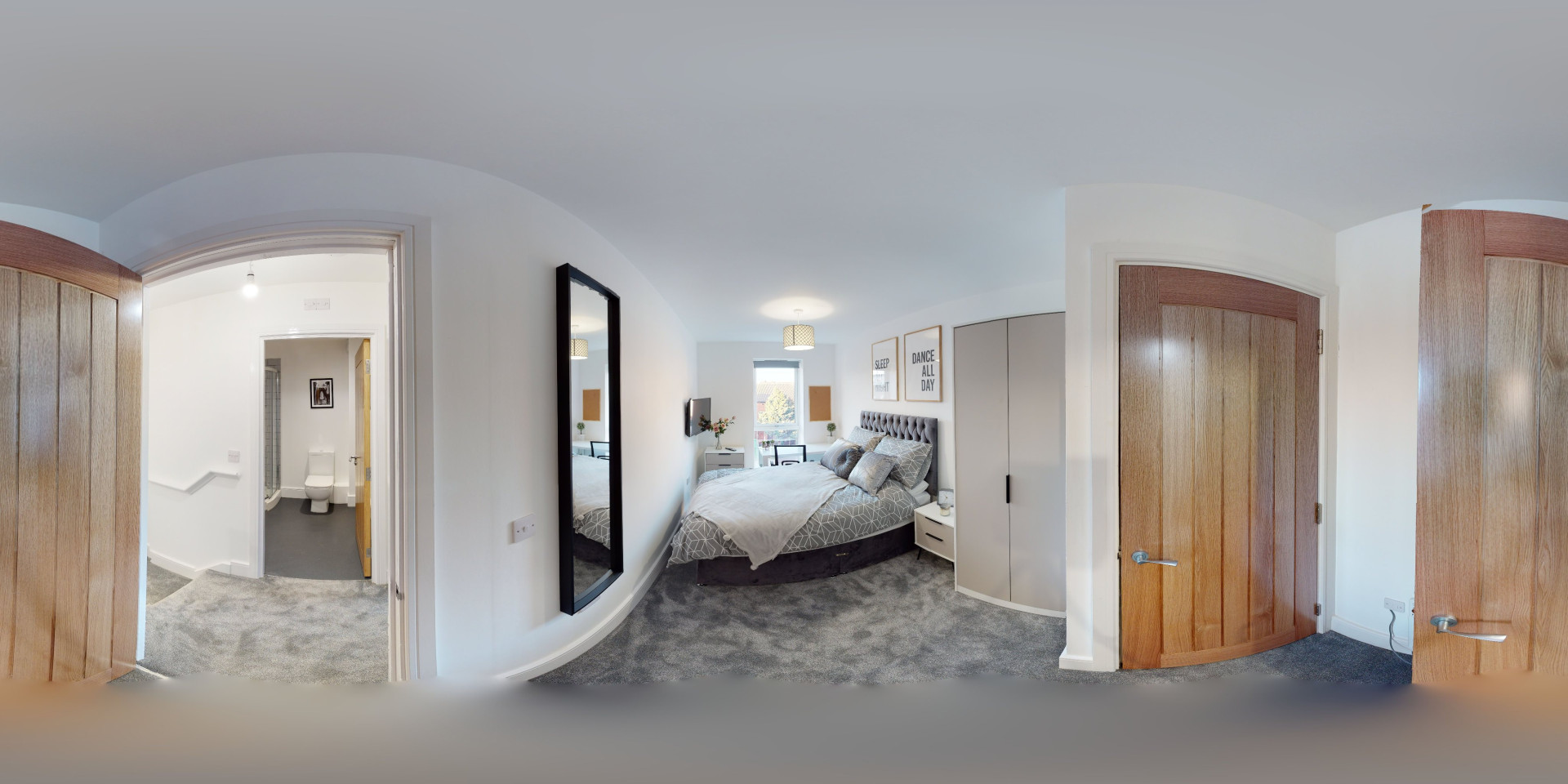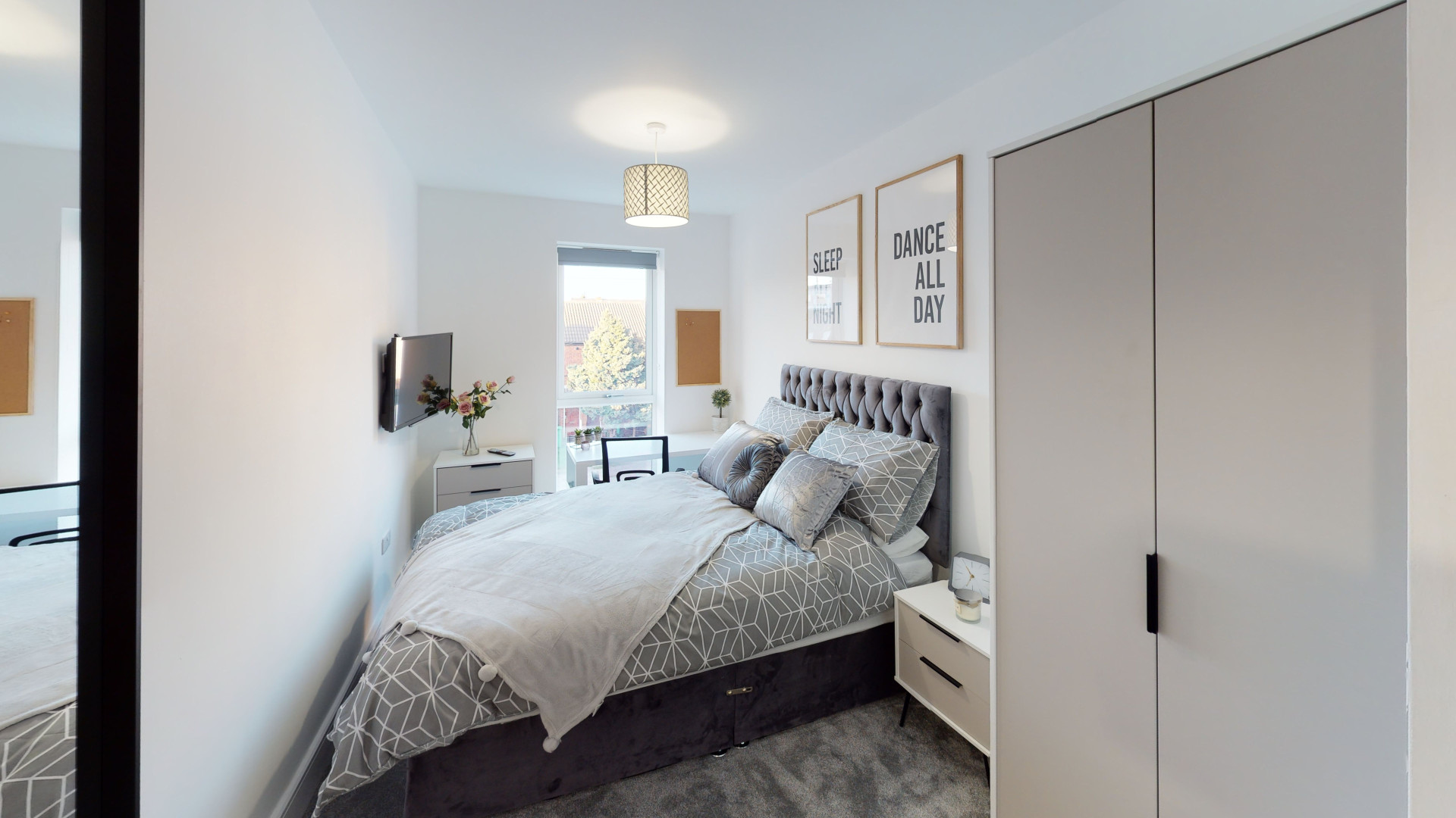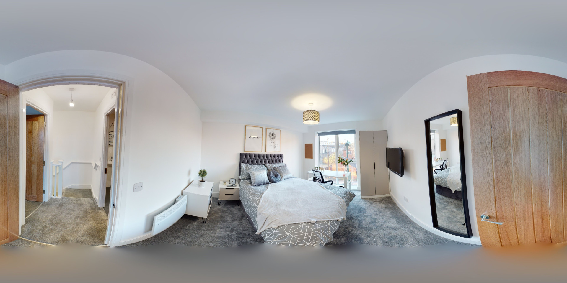 - Bedroom furniture: bed, desk, desk chair, wardrobe, and drawers