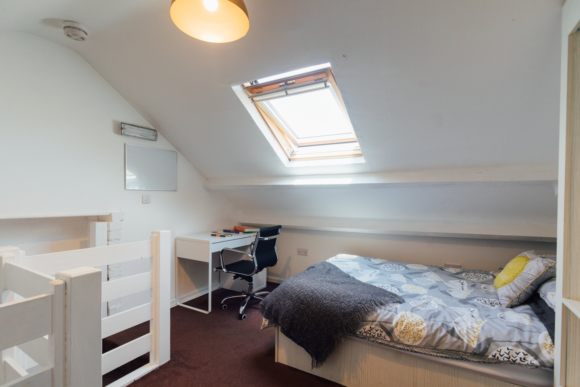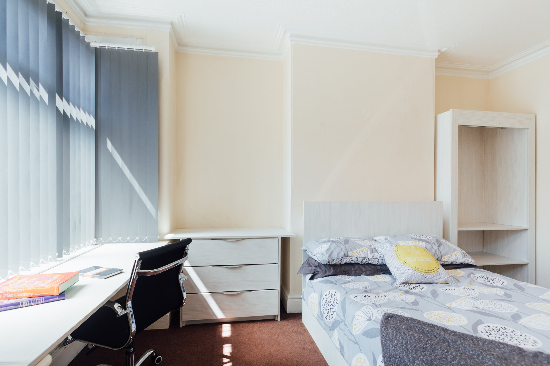 - Bedroom furniture: bed, desk, desk chair, wardrobe, and drawers