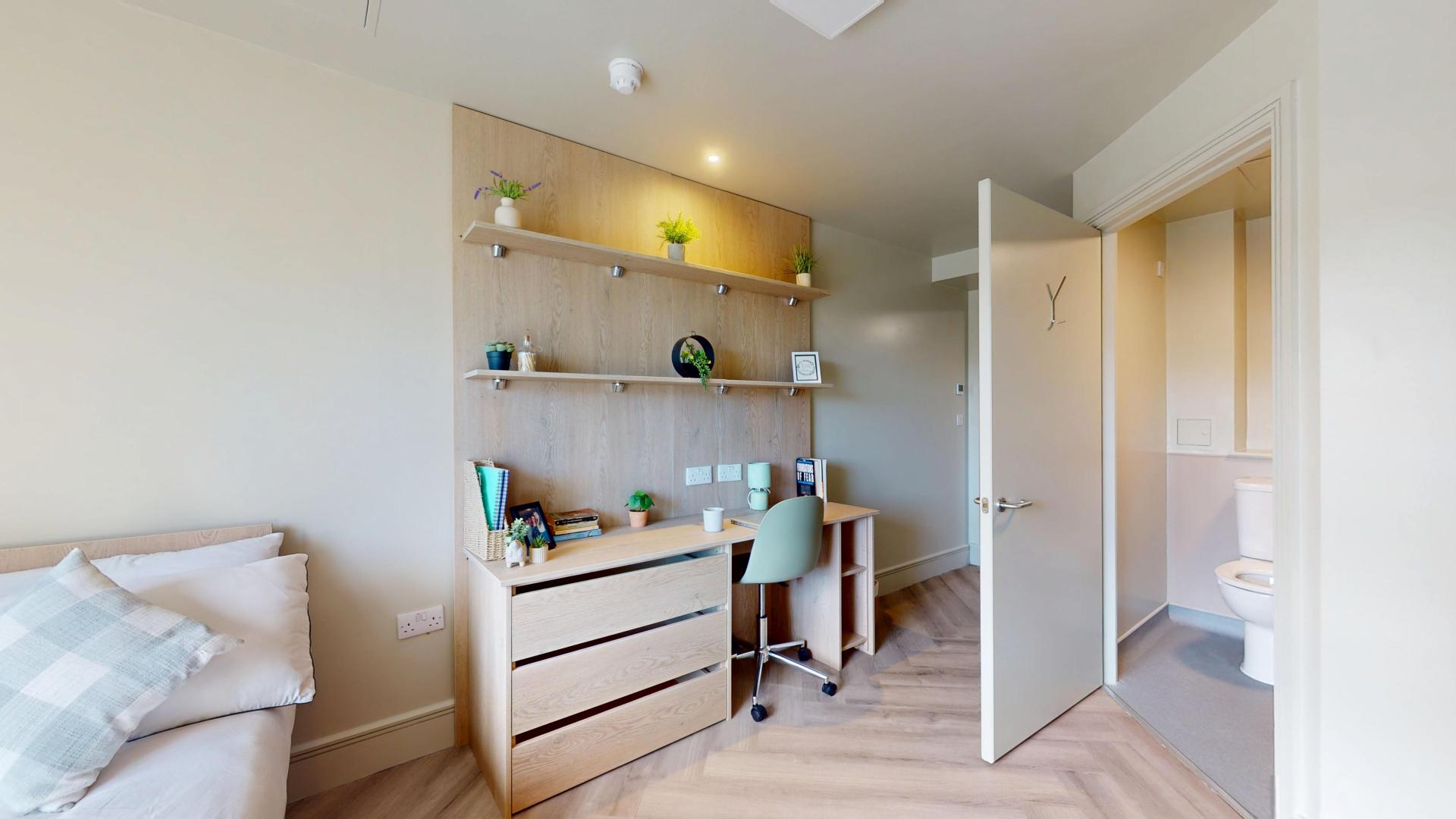 - Bedroom furniture: bed, desk, desk chair, wardrobe, and drawers
