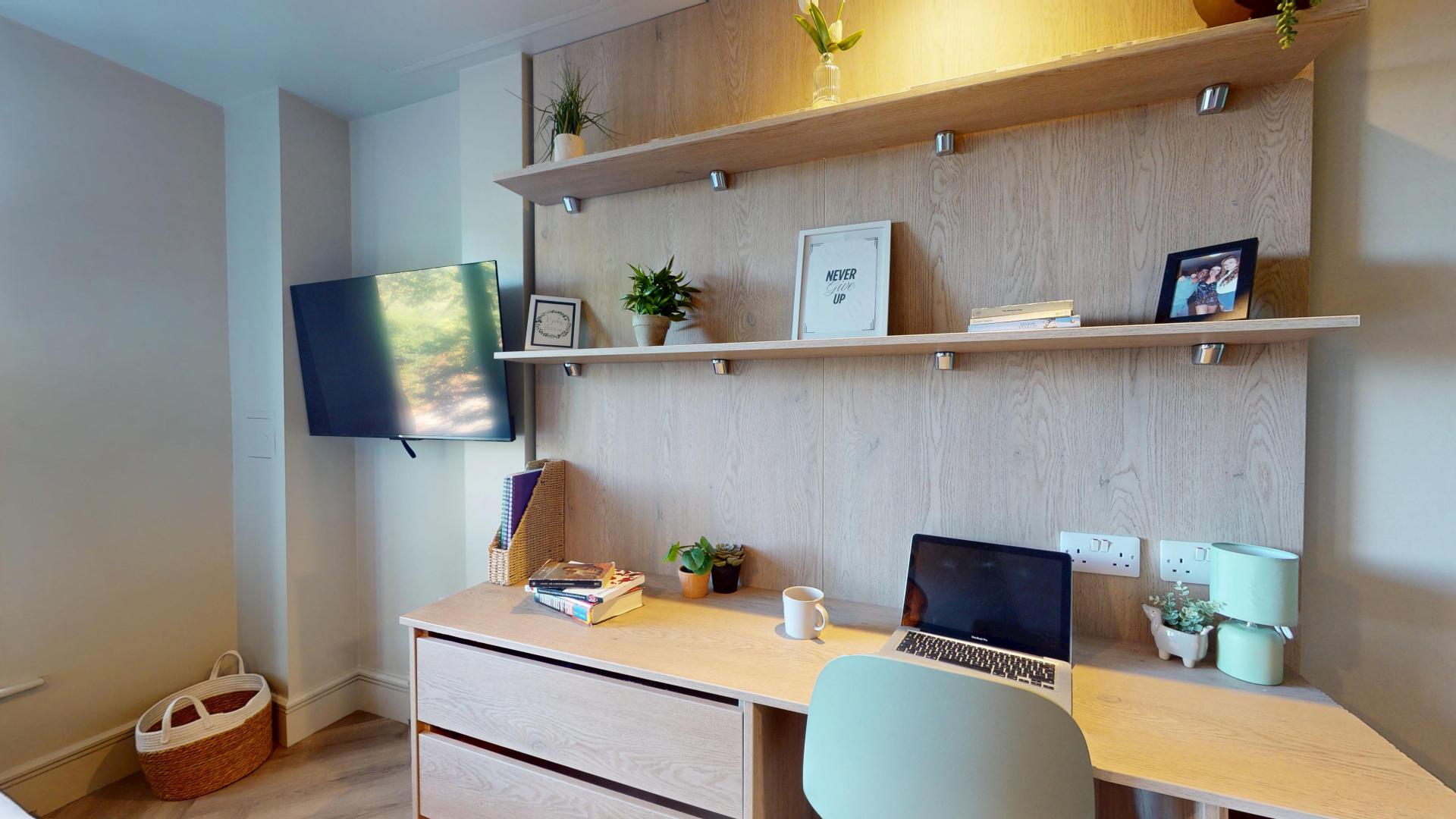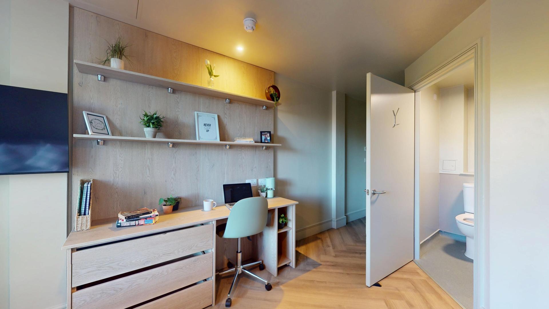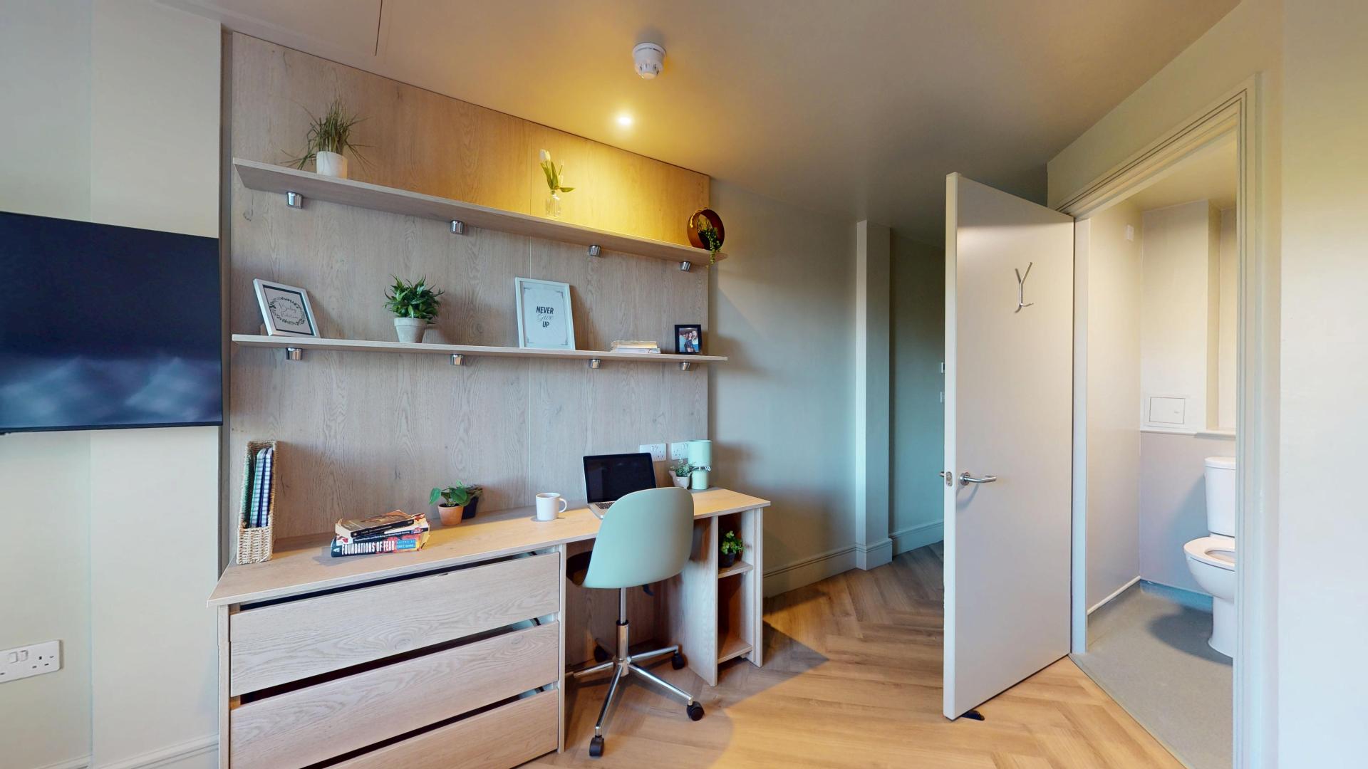 - Bedroom furniture: bed, desk, desk chair, wardrobe, and drawers