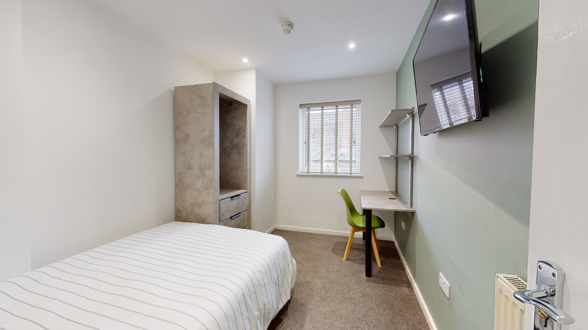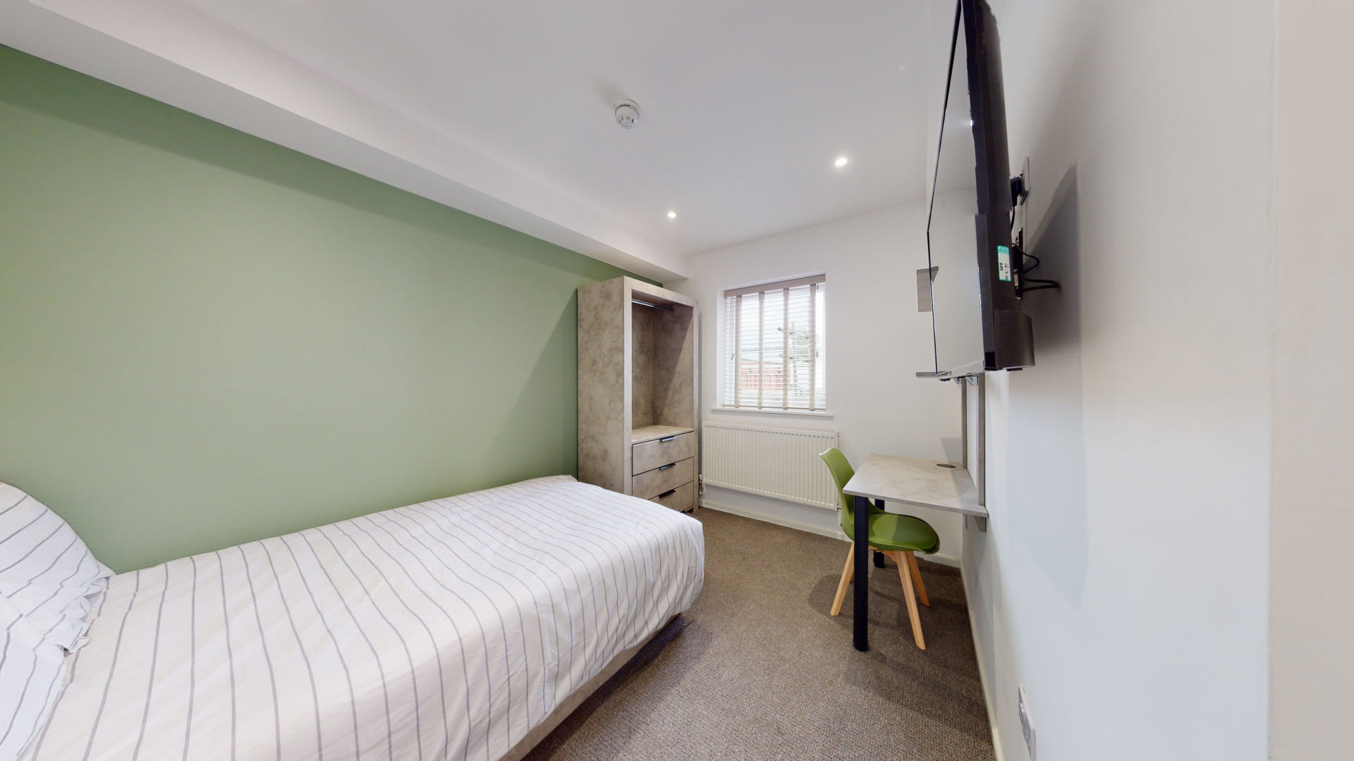 - Bedroom furniture: bed, desk, desk chair, wardrobe, and drawers