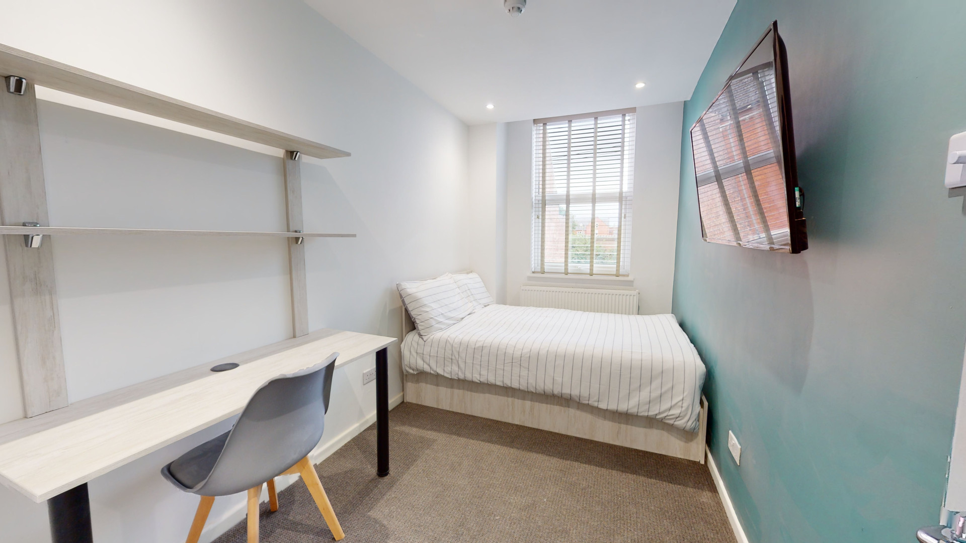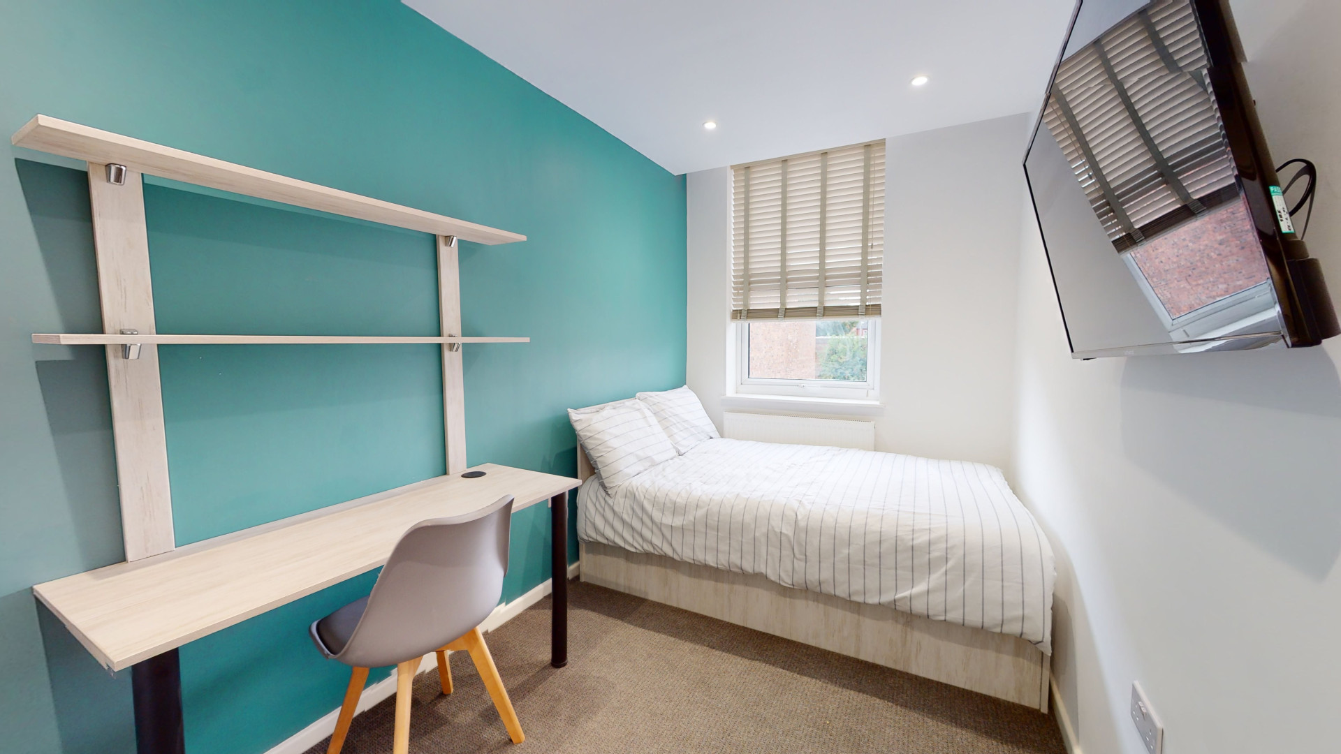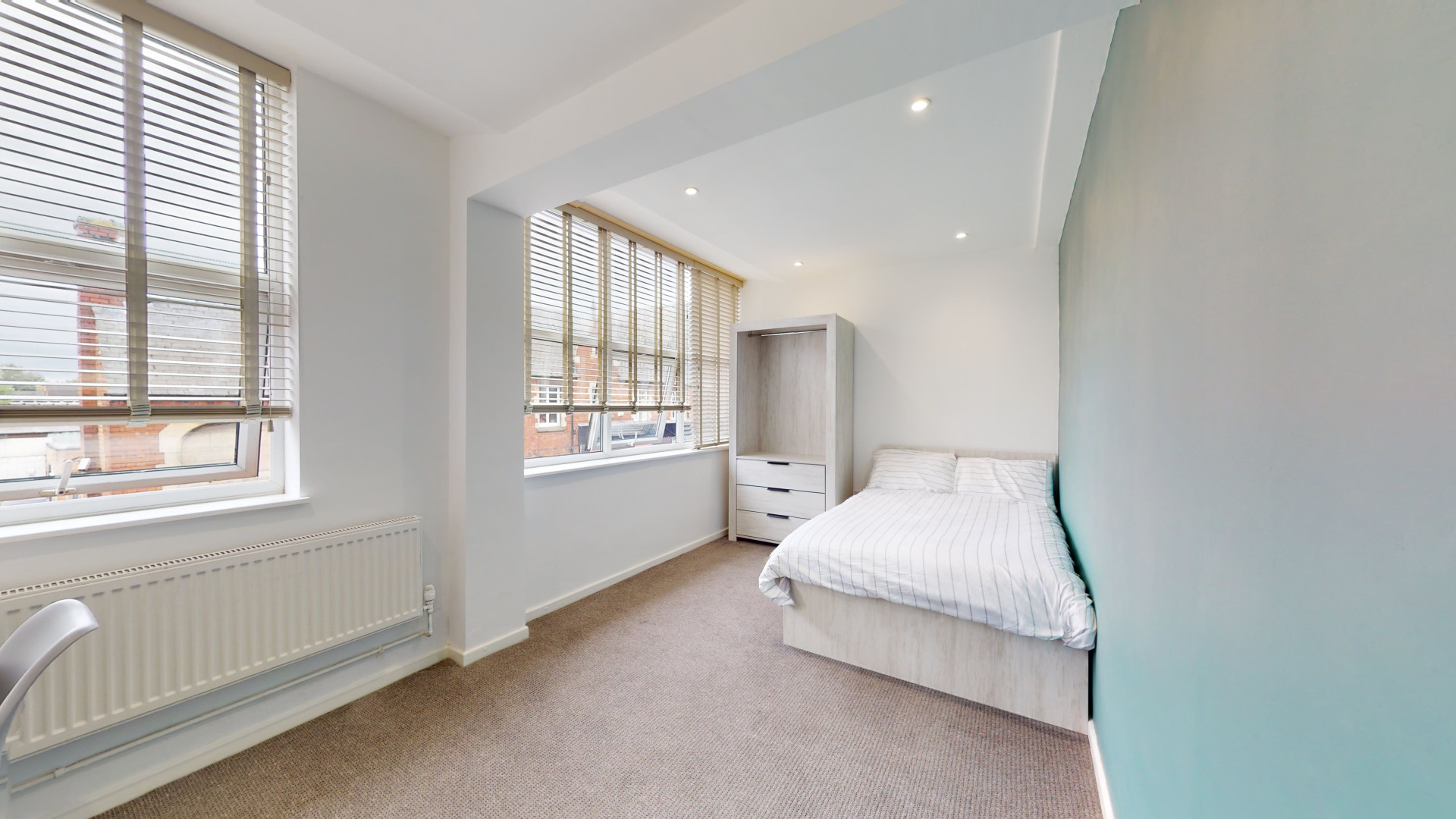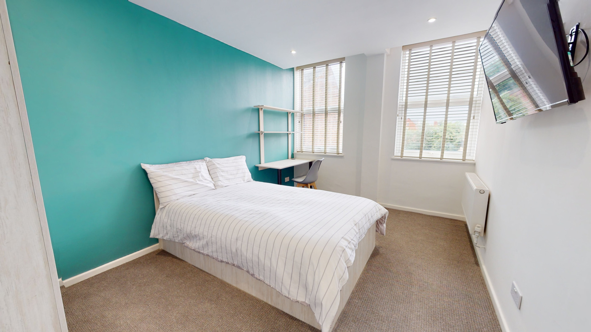 - Bedroom furniture: bed, desk, desk chair, wardrobe, and drawers