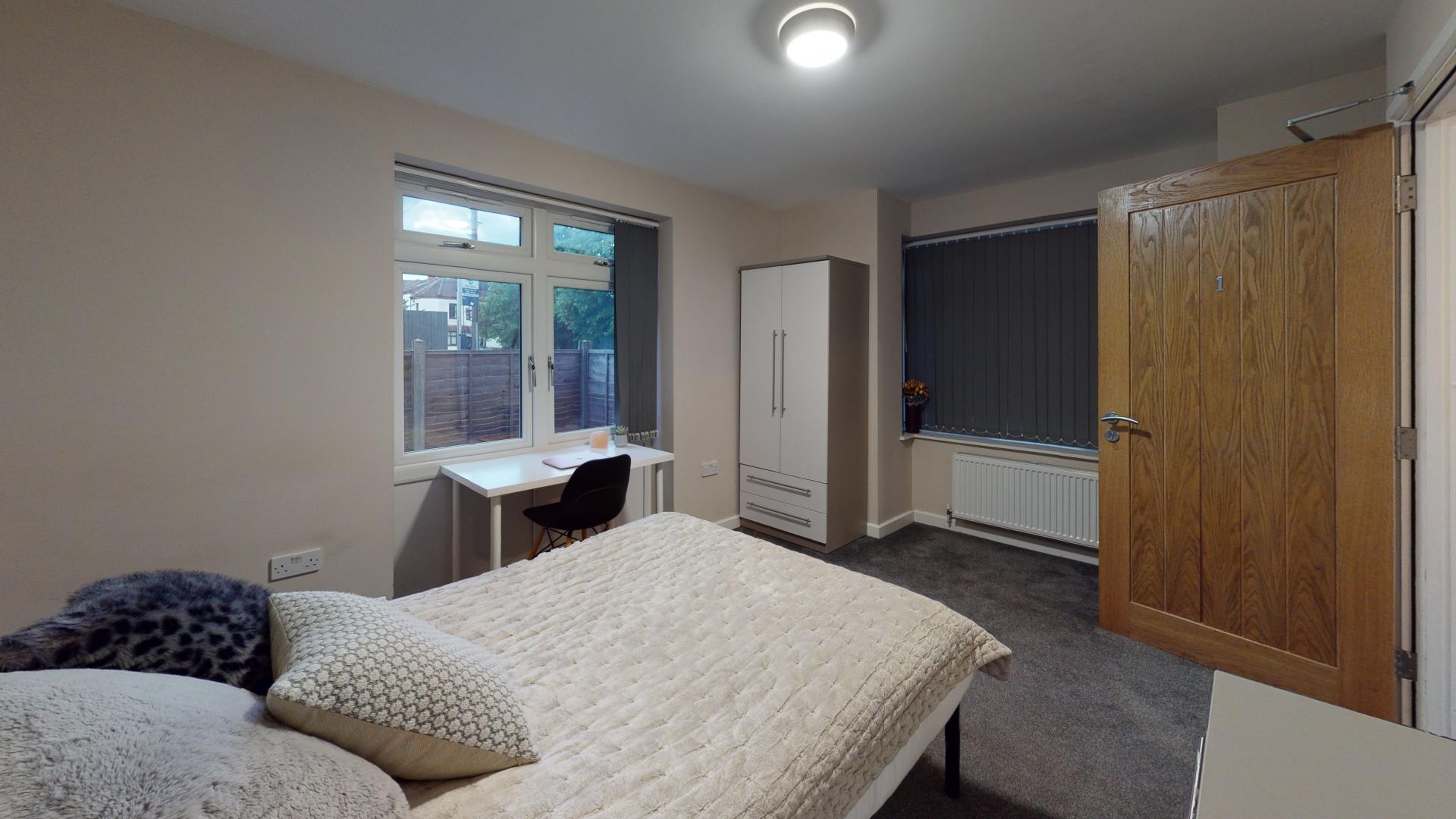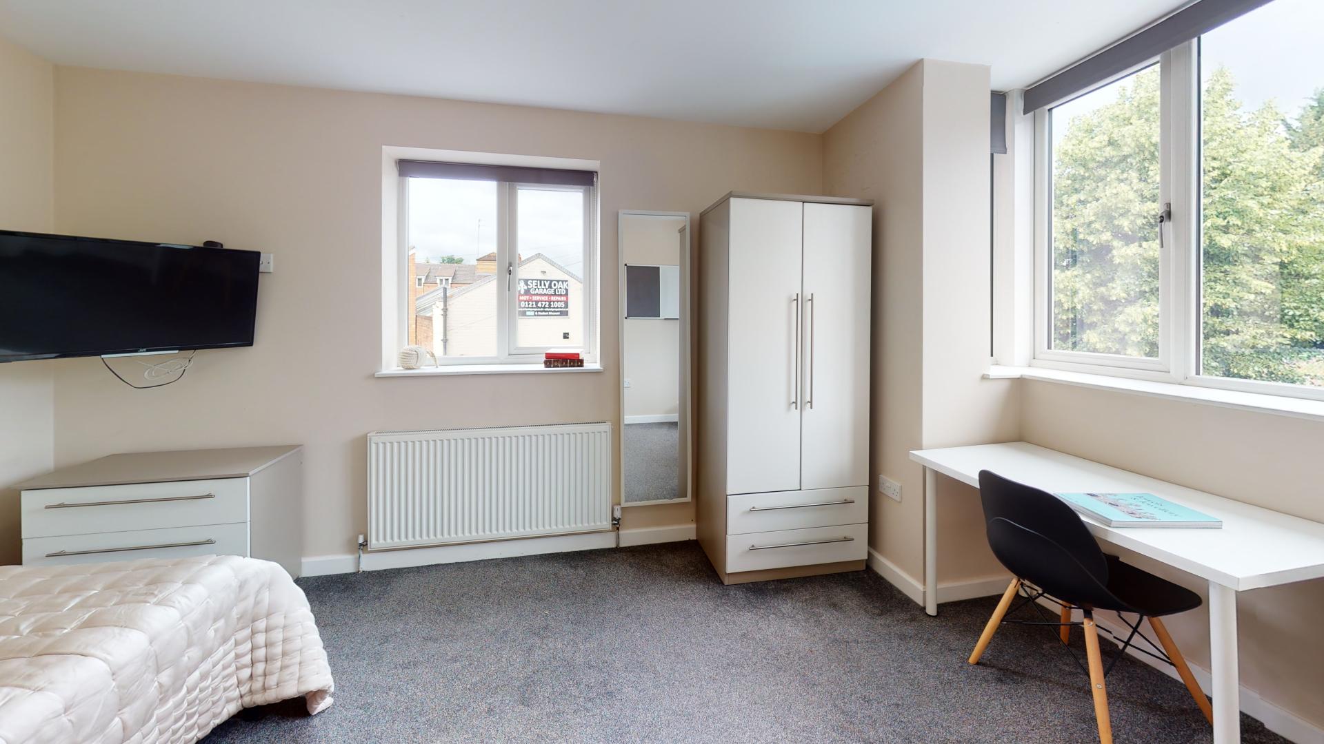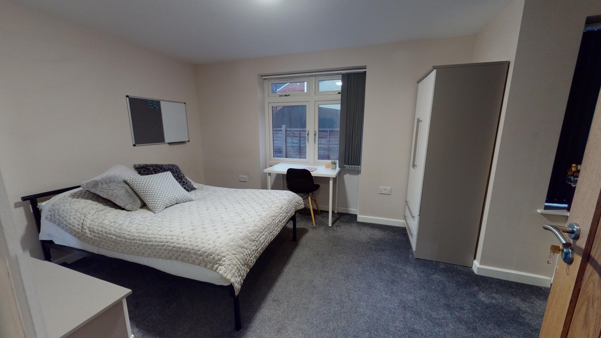 - Bedroom furniture: bed, desk, desk chair, wardrobe, and drawers