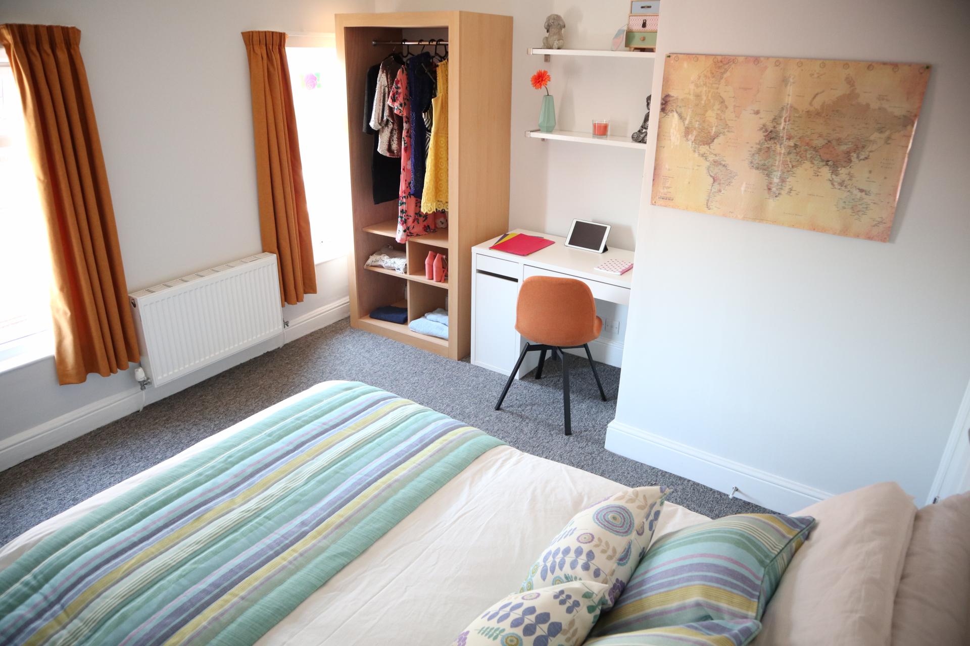 - Bedroom furniture: bed, desk, desk chair, wardrobe, and drawers