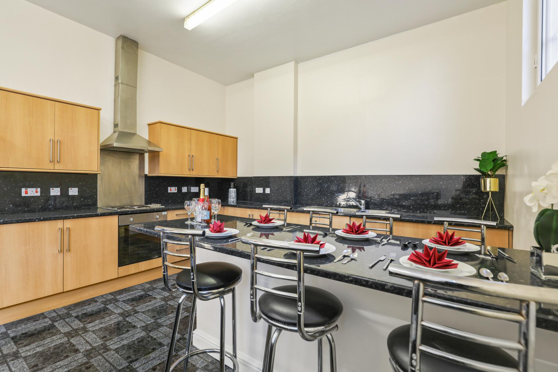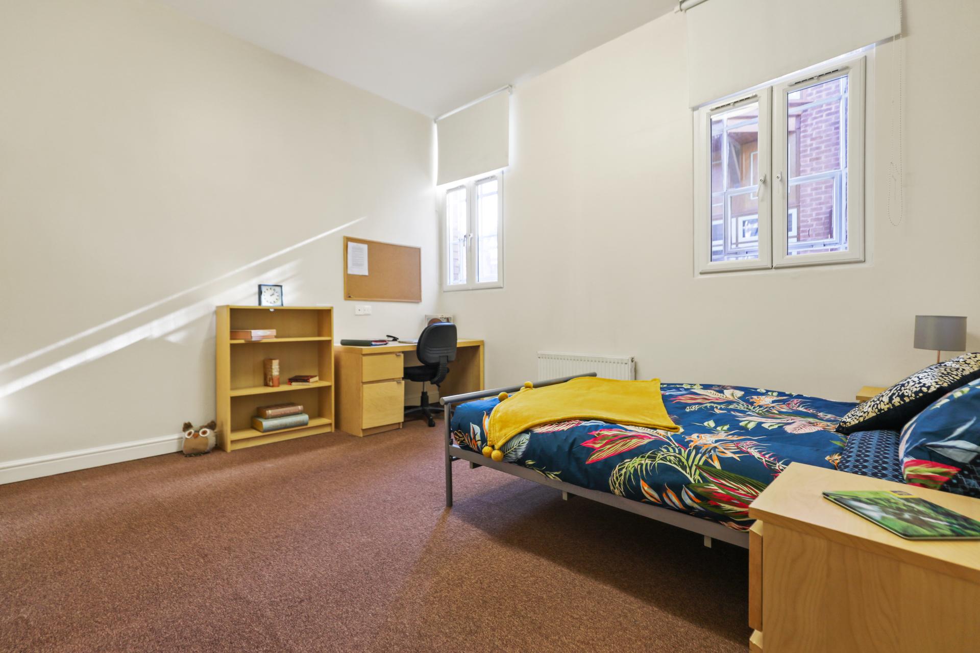 The open-plan living area is designed for easy socialising, whether you’re relaxing with housemates, studying together or enjoying a film night. The modern, well-equipped kitchen includes multiple fridges/freezers, ample cooking space and a dishwasher, making shared cooking simple and keeping the flat running smoothly.
