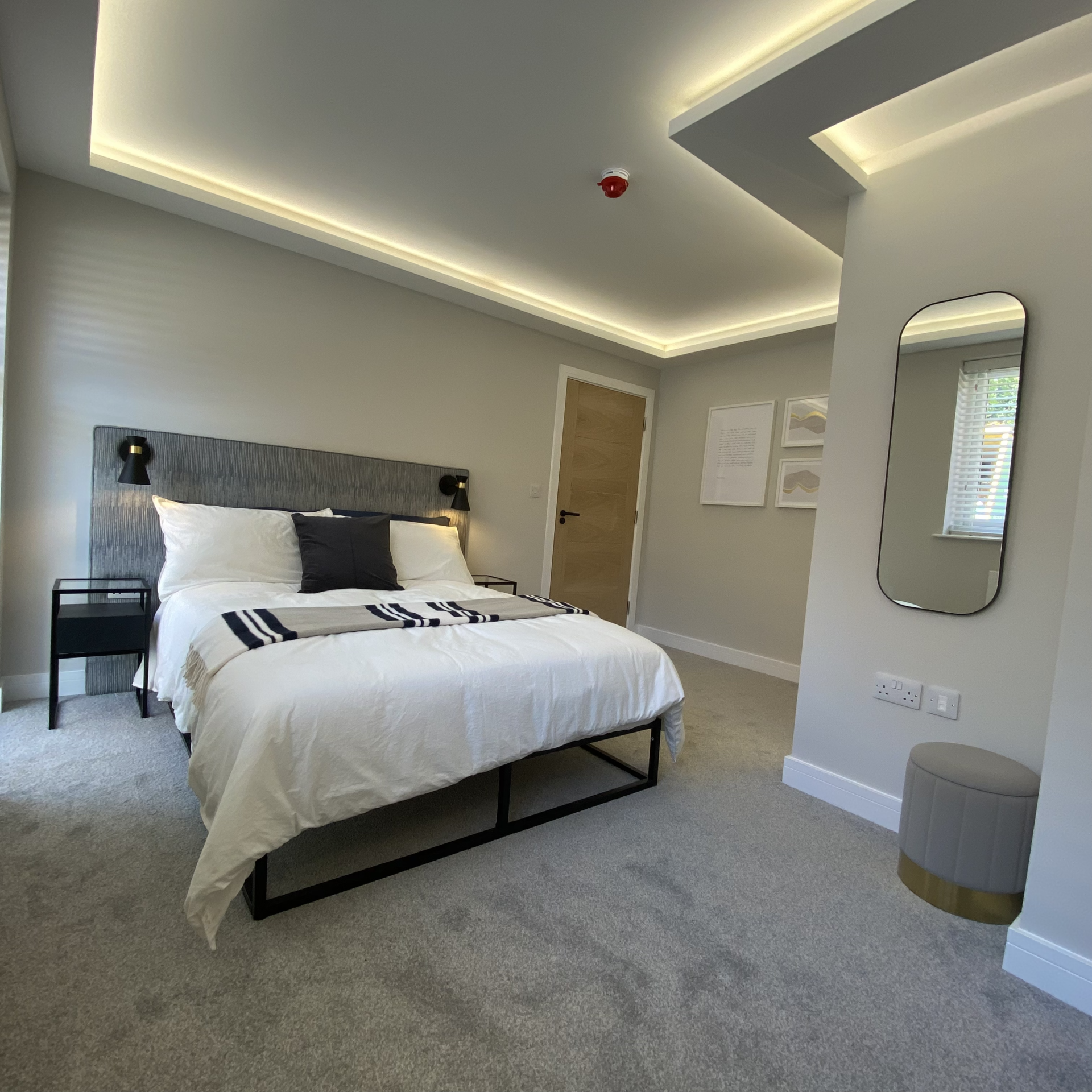 The apartment features a bright open-plan living space with contemporary furnishings, a fully fitted kitchen with modern appliances, and a spacious double bedroom designed for both study and relaxation. The sleek bathroom is finished to a high standard, adding to the property’s fresh, modern feel.
