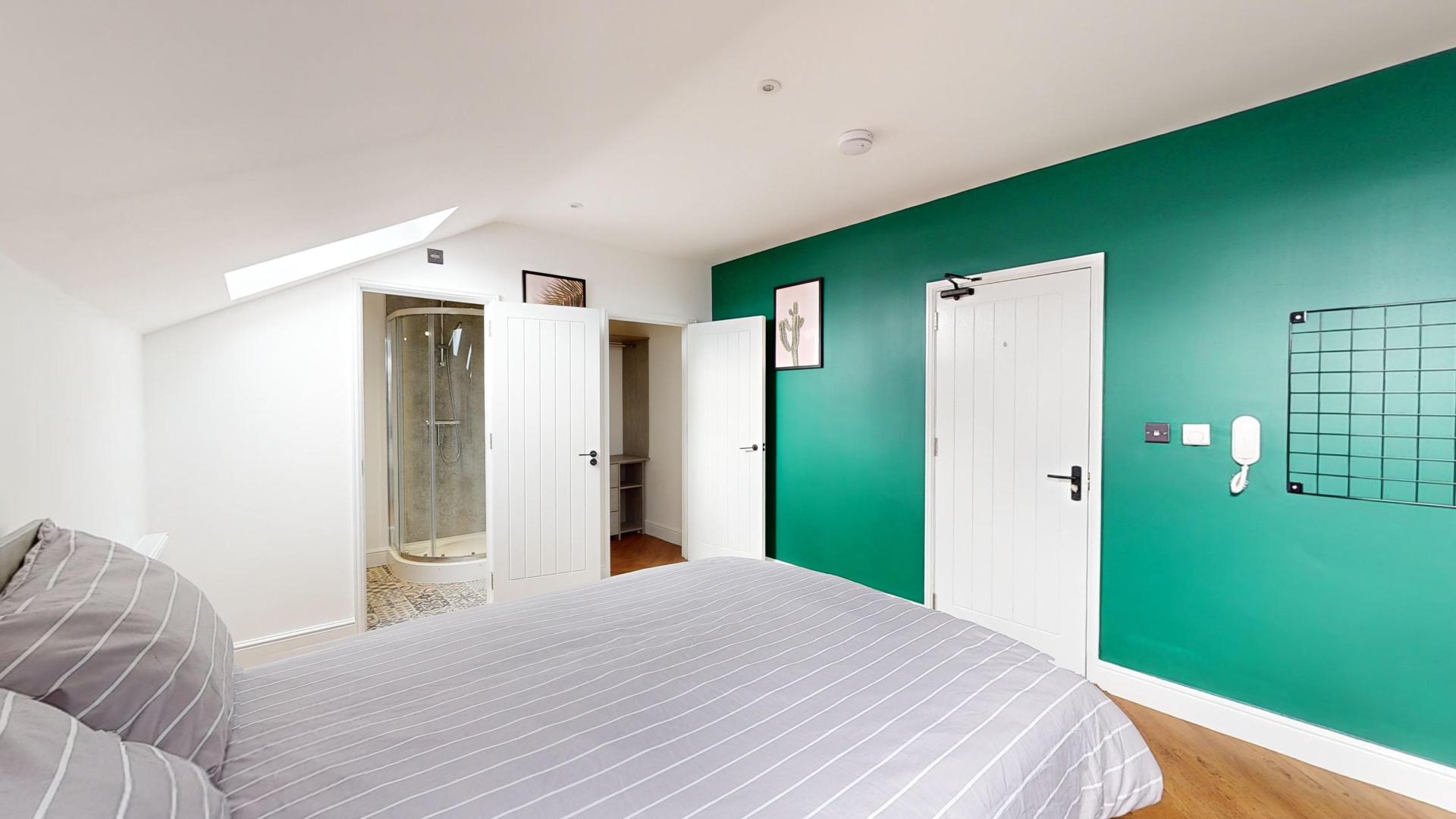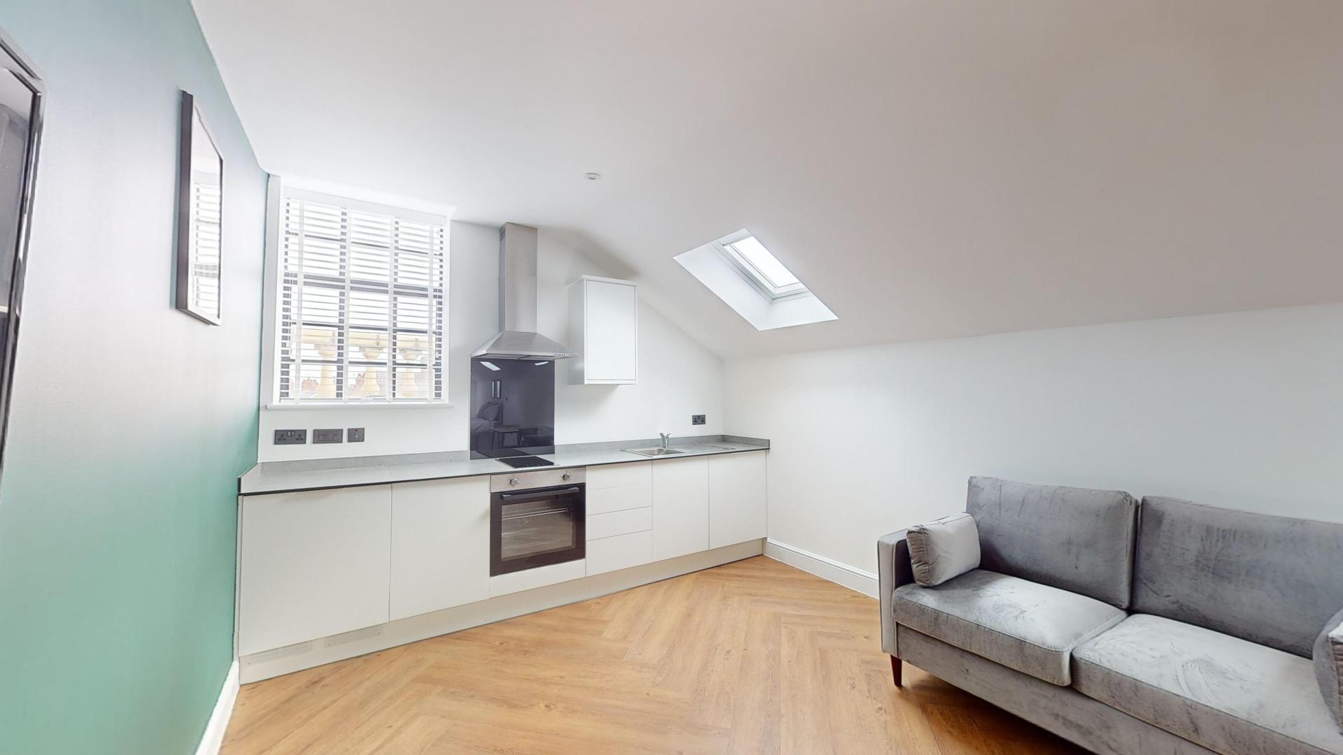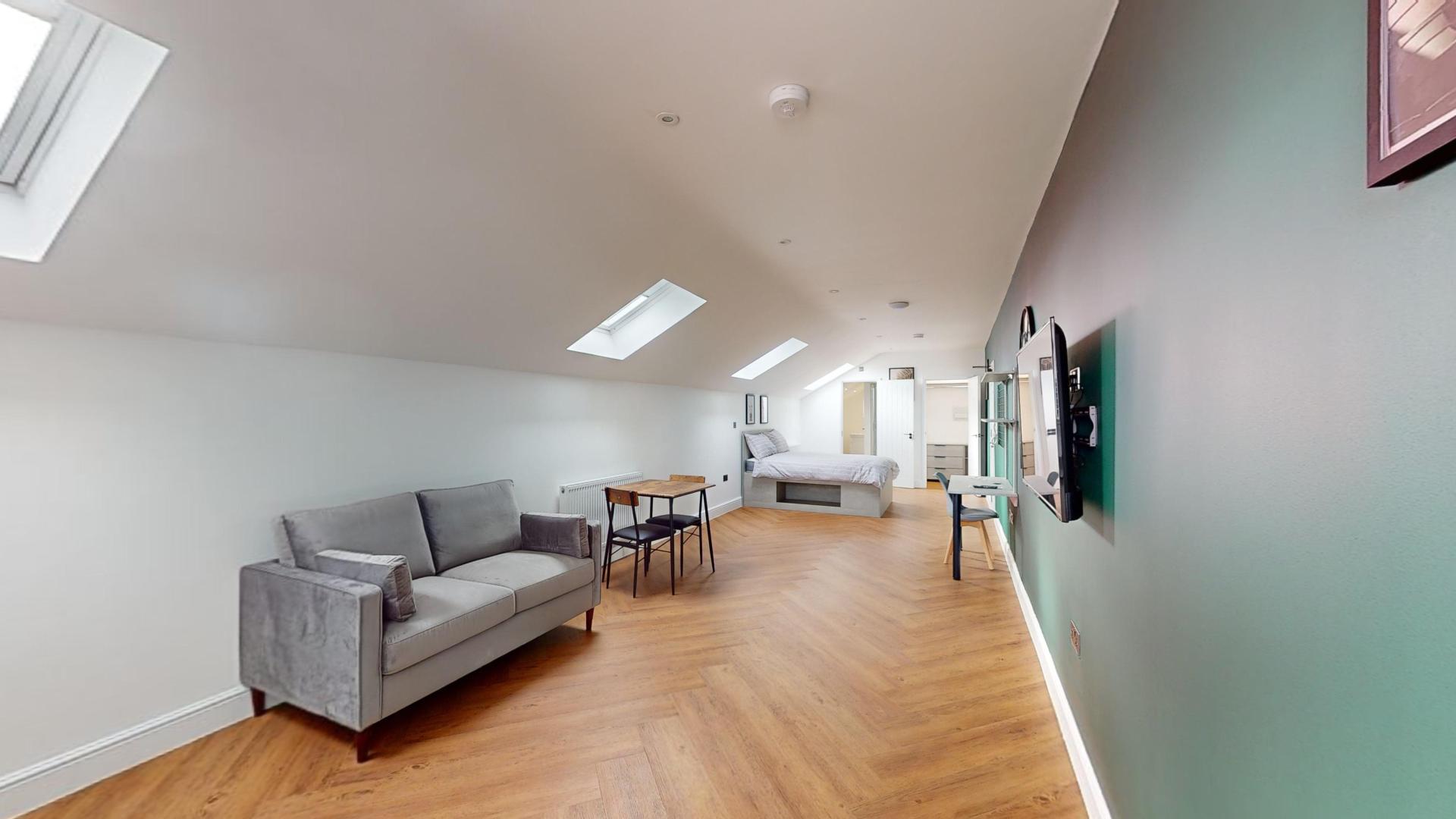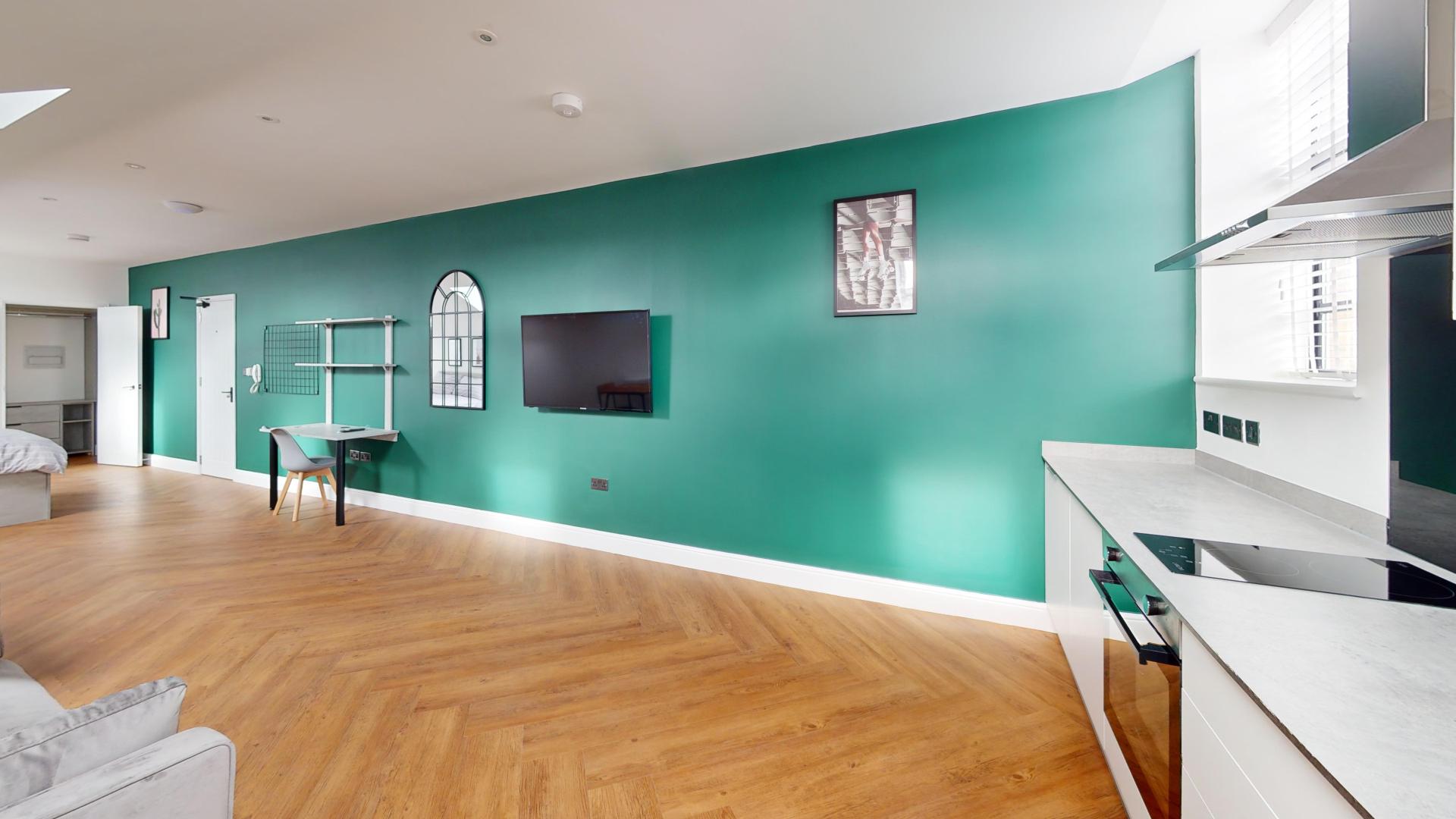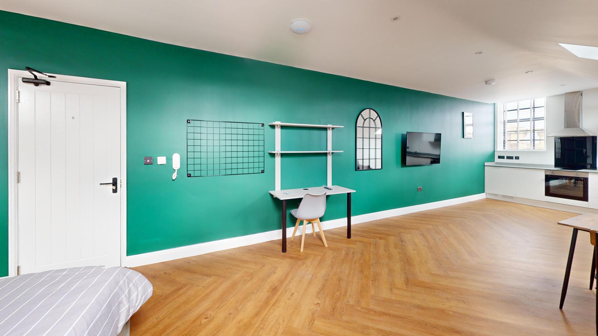 The building combines modern interiors with timeless character, providing a unique and appealing living environment for students. The studio features modern, fitted furniture designed to optimize space while maintaining aesthetic appeal. The open-plan living and kitchen area is perfect for both productivity and relaxation.