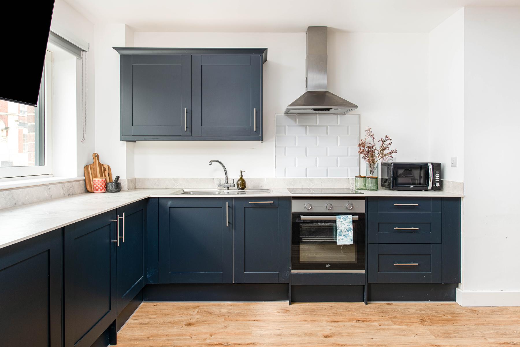 Fully equipped kitchenette with integrated fridge/freezer, hob, oven, and microwave