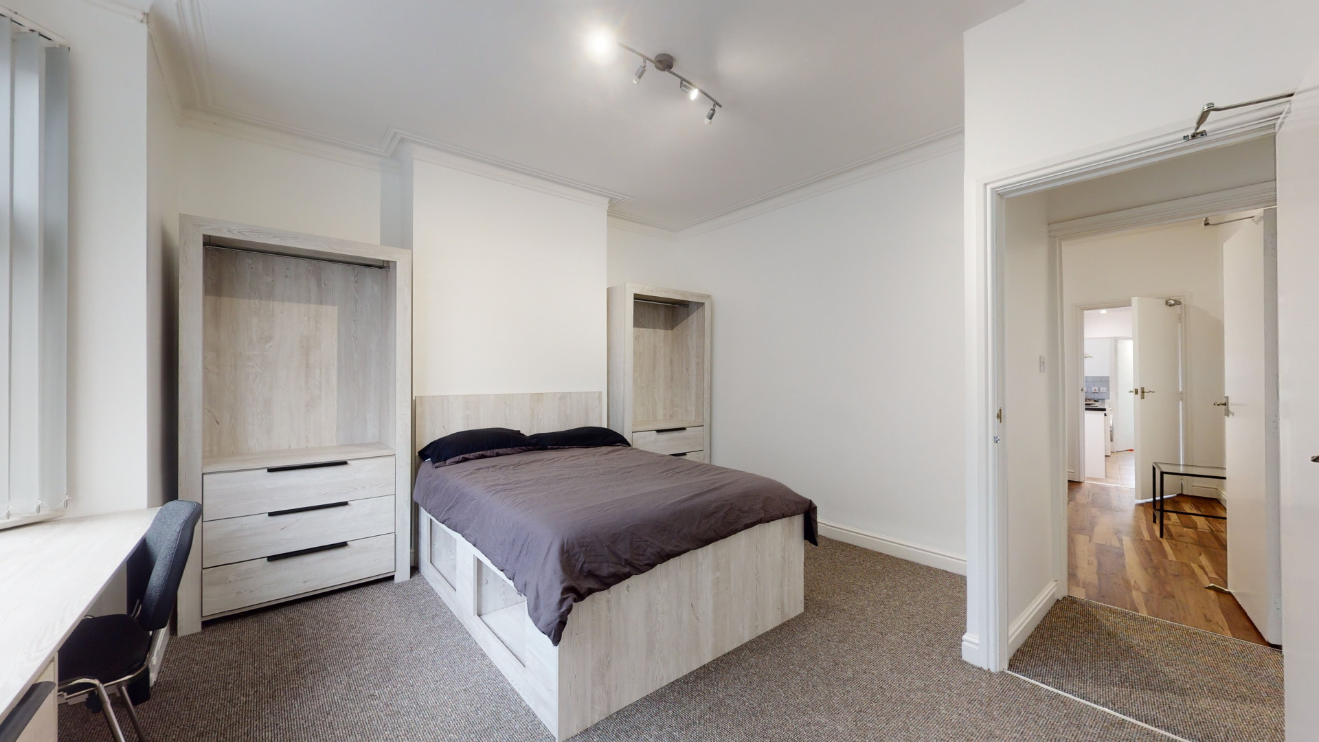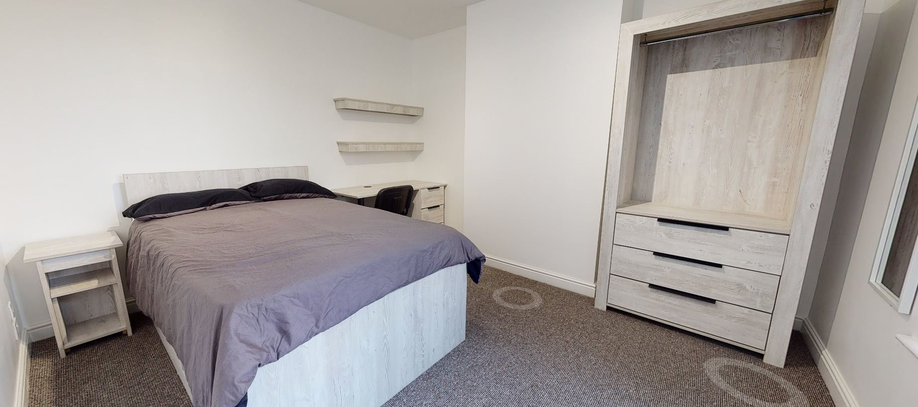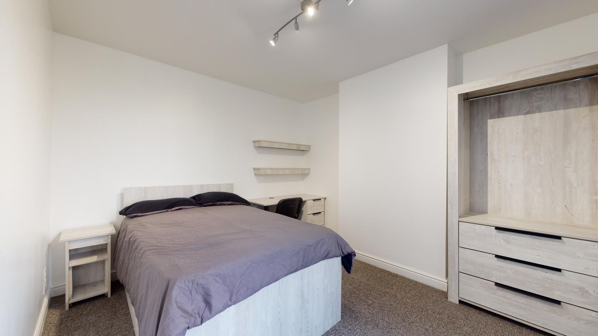 - Bedroom furniture: bed, desk, desk chair, wardrobe, and drawers