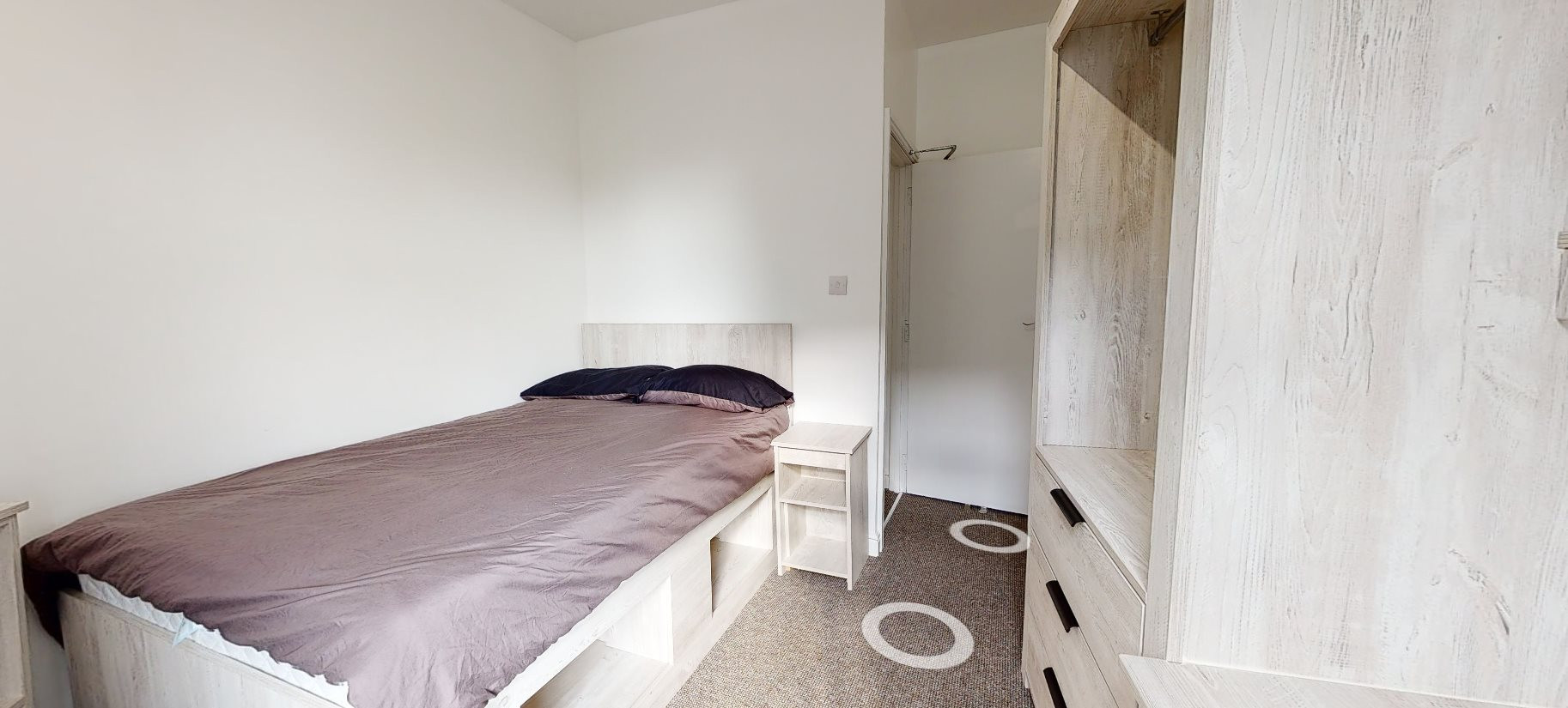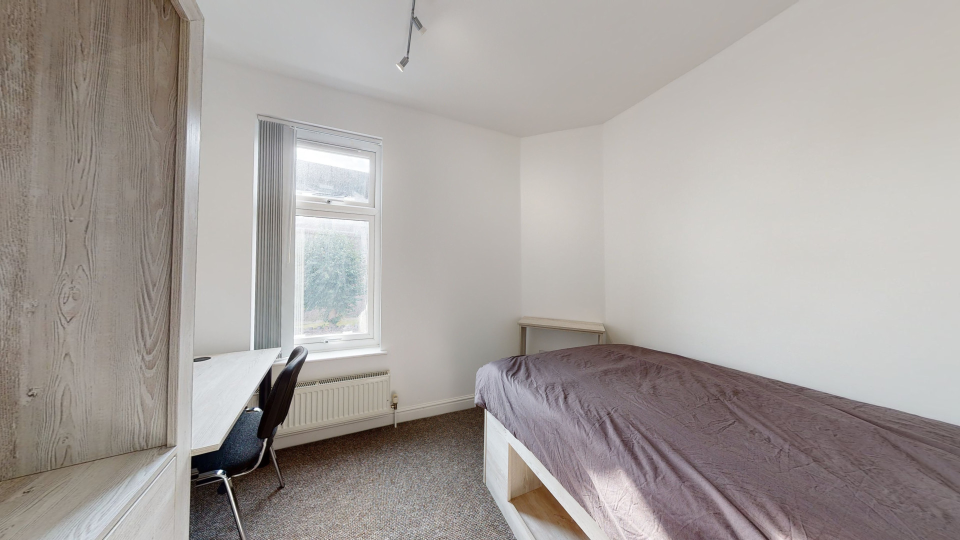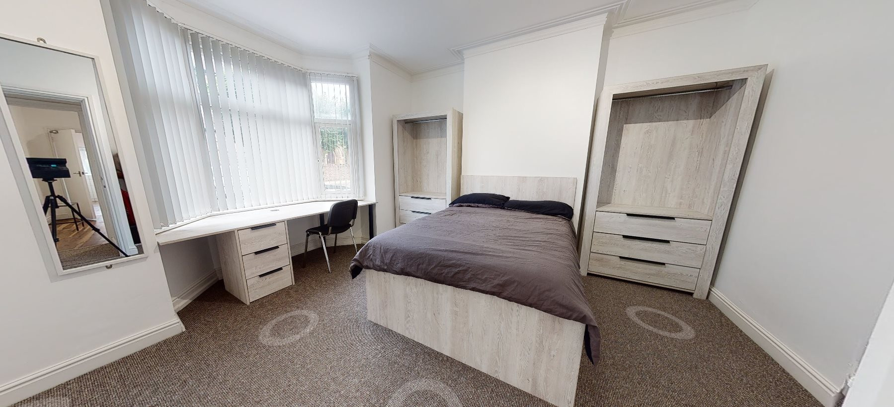 - Bedroom furniture: bed, desk, desk chair, wardrobe, and drawers