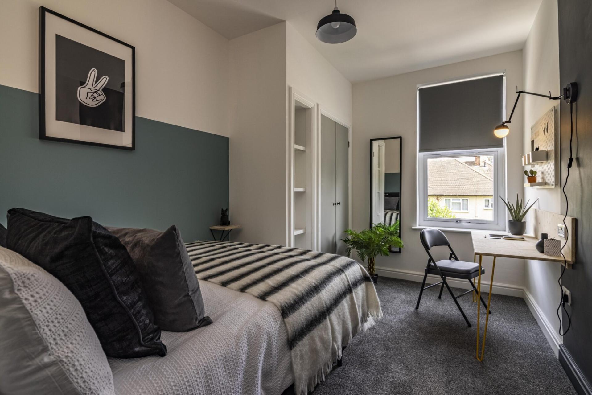 - Bedroom furniture: bed, desk, desk chair, wardrobe, and drawers