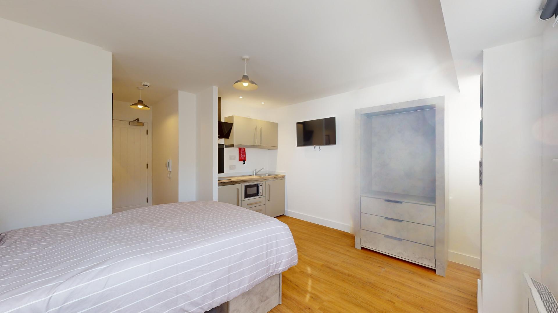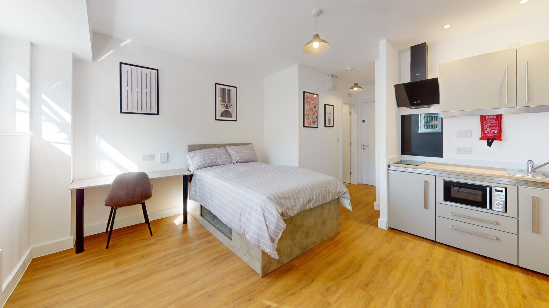 The studio offers a fully self-contained living space complete with an ensuite bathroom and a fully equipped kitchen, ensuring students have everything they need at their fingertips. Its prime location in the town centre places Tesco right next door, making grocery runs quick and hassle-free. Residents can also maintain an active lifestyle with the convenience of an onsite gym, while secure bike storage facilities provide peace of mind by protecting bicycles from potential theft or damage.