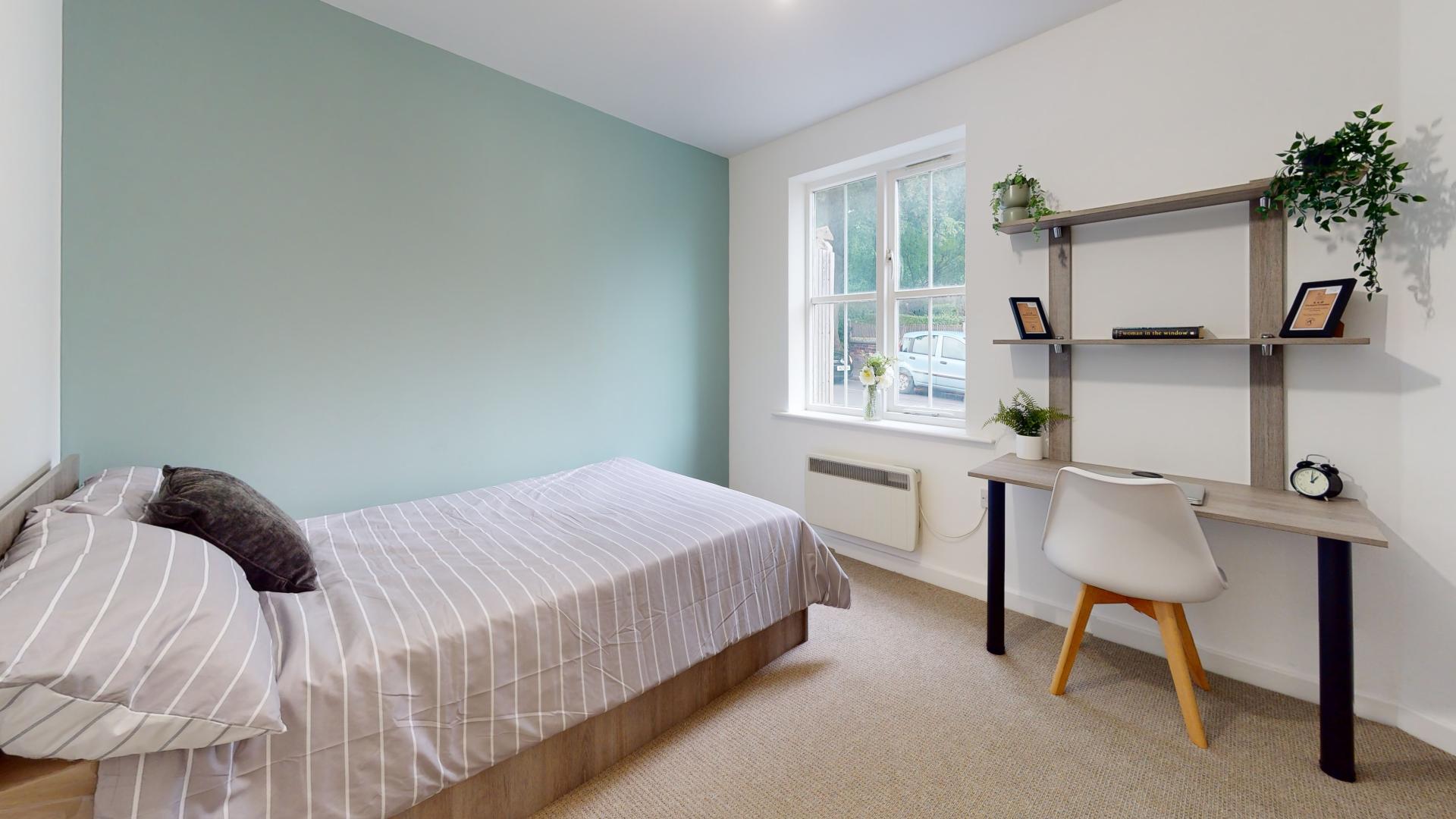 - Bedroom furniture: bed, desk, desk chair, wardrobe, and drawers
