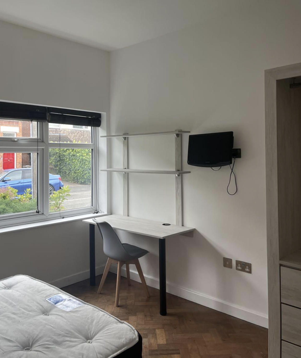 - Bedroom furniture: bed, desk, desk chair, wardrobe, and drawers