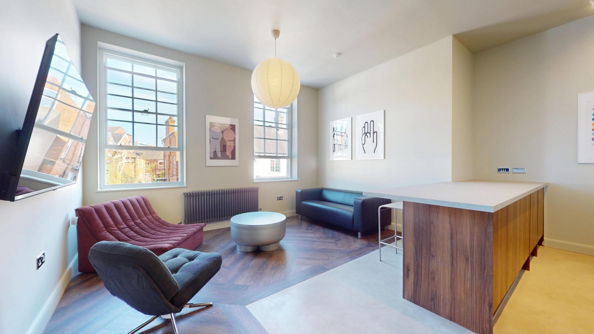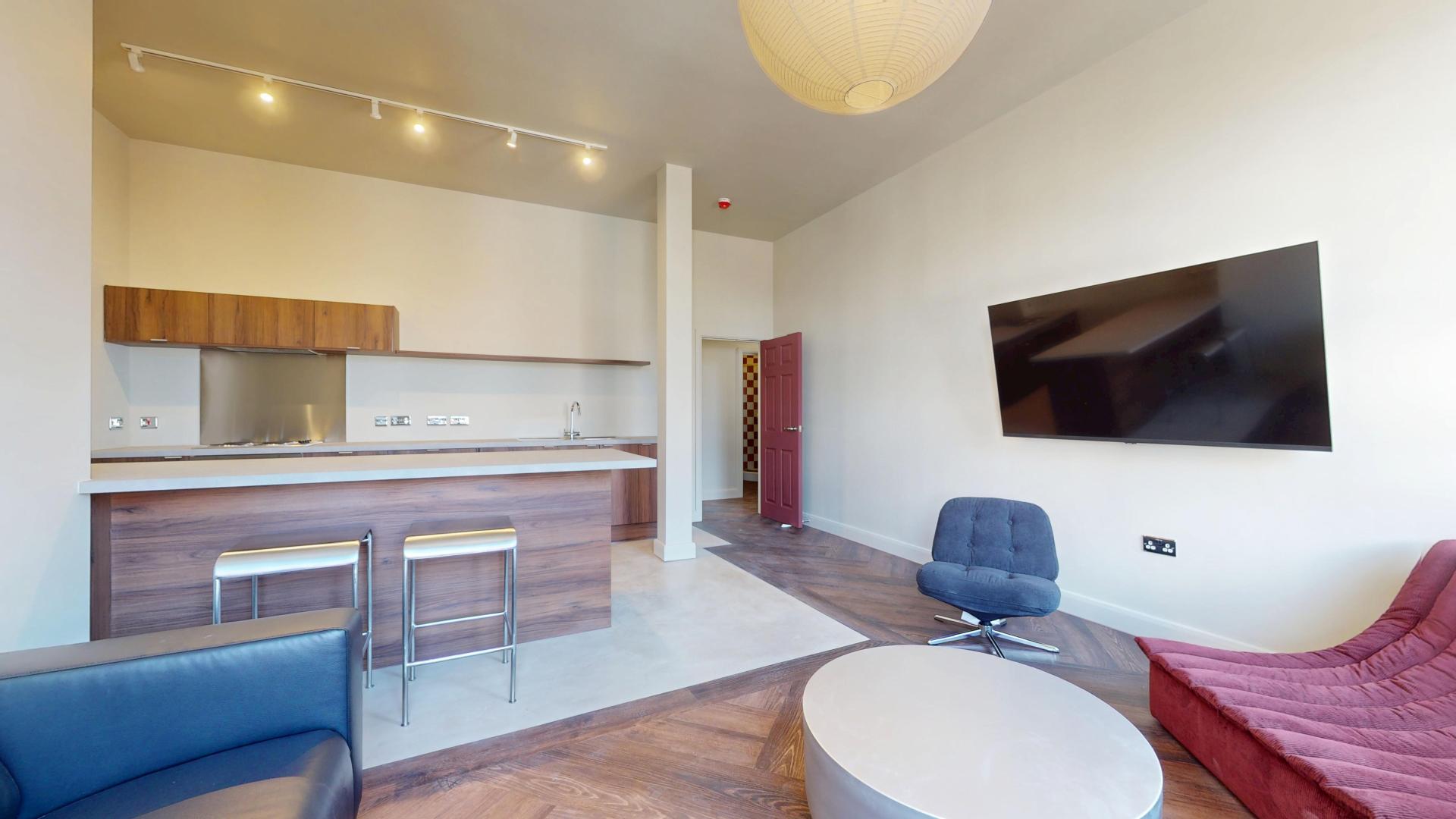 The apartment features a large open-plan lounge and kitchen, designed as the perfect communal area for cooking, socialising, and relaxing. It's the ideal setting for group meals, movie nights, or simply unwinding after a busy day.