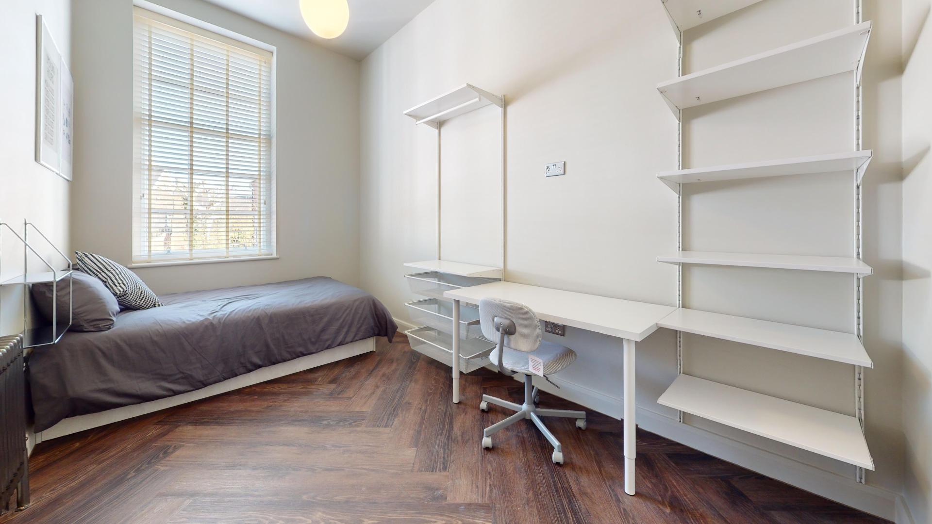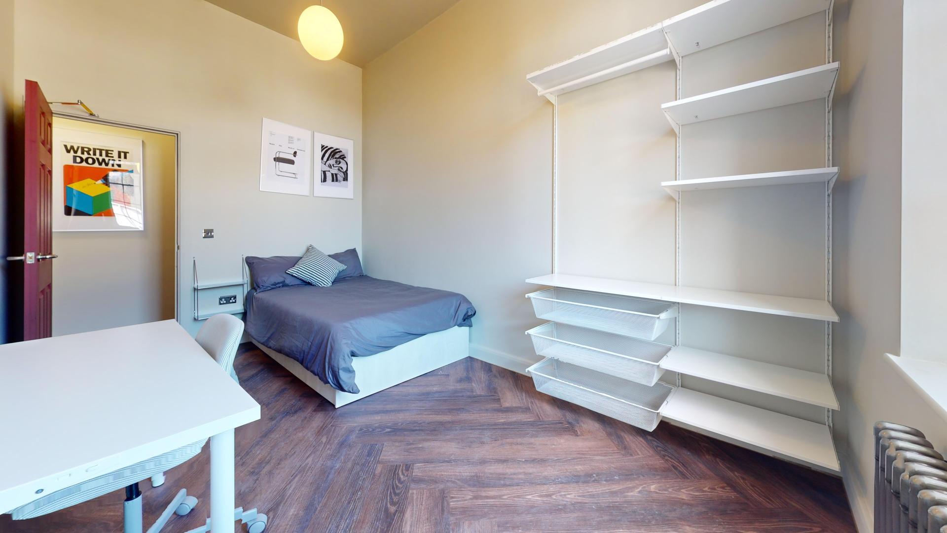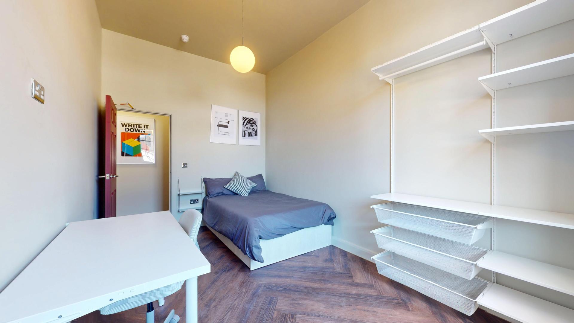 - Bedroom furniture: bed, desk, desk chair, wardrobe, and drawers