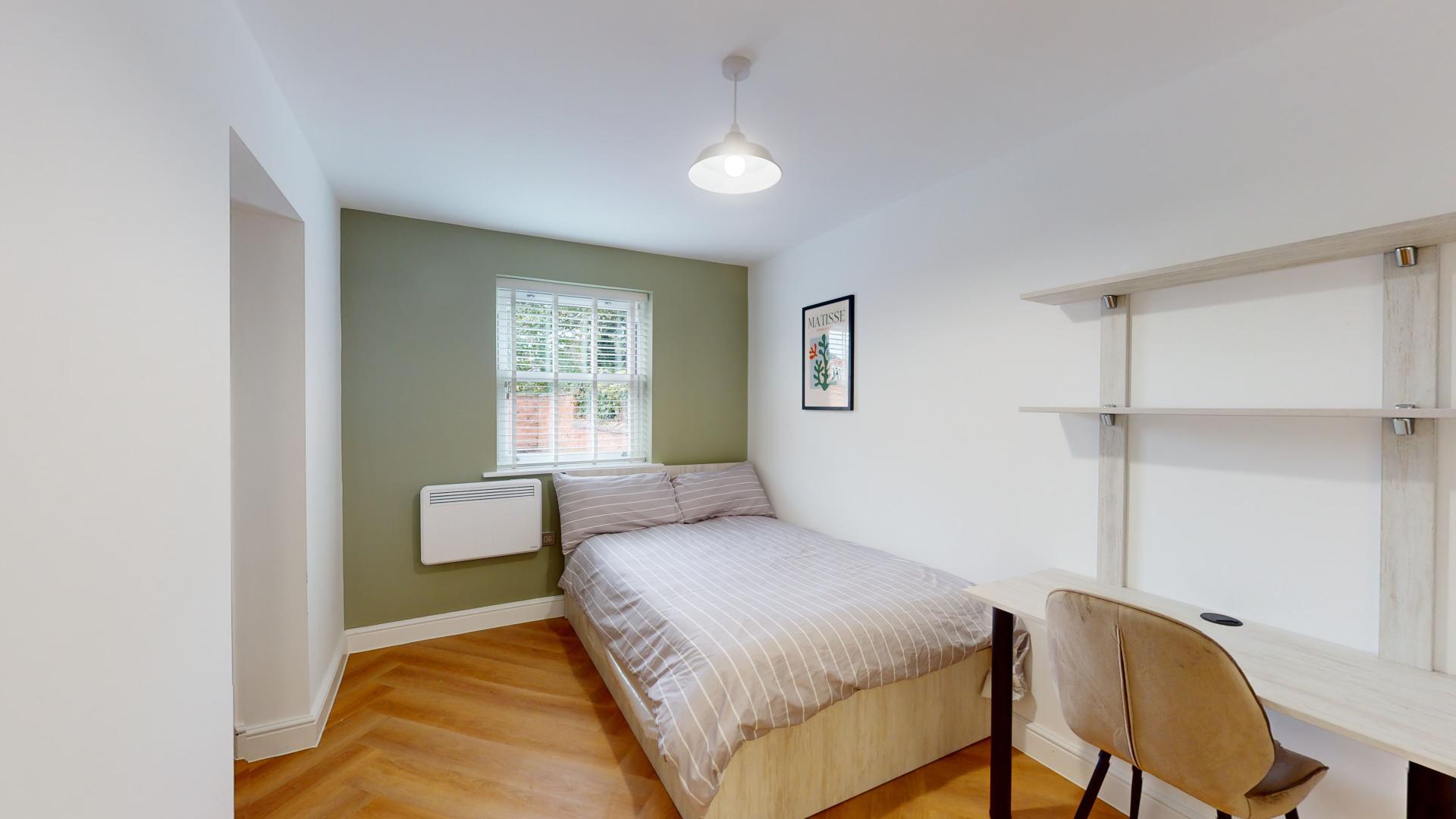- Bedroom furniture: bed, desk, desk chair, wardrobe, and drawers
