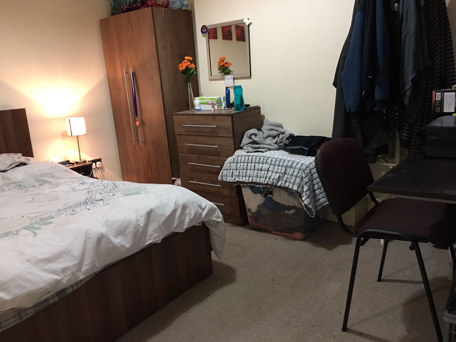 - Bedroom furniture: bed, desk, desk chair, wardrobe, and drawers