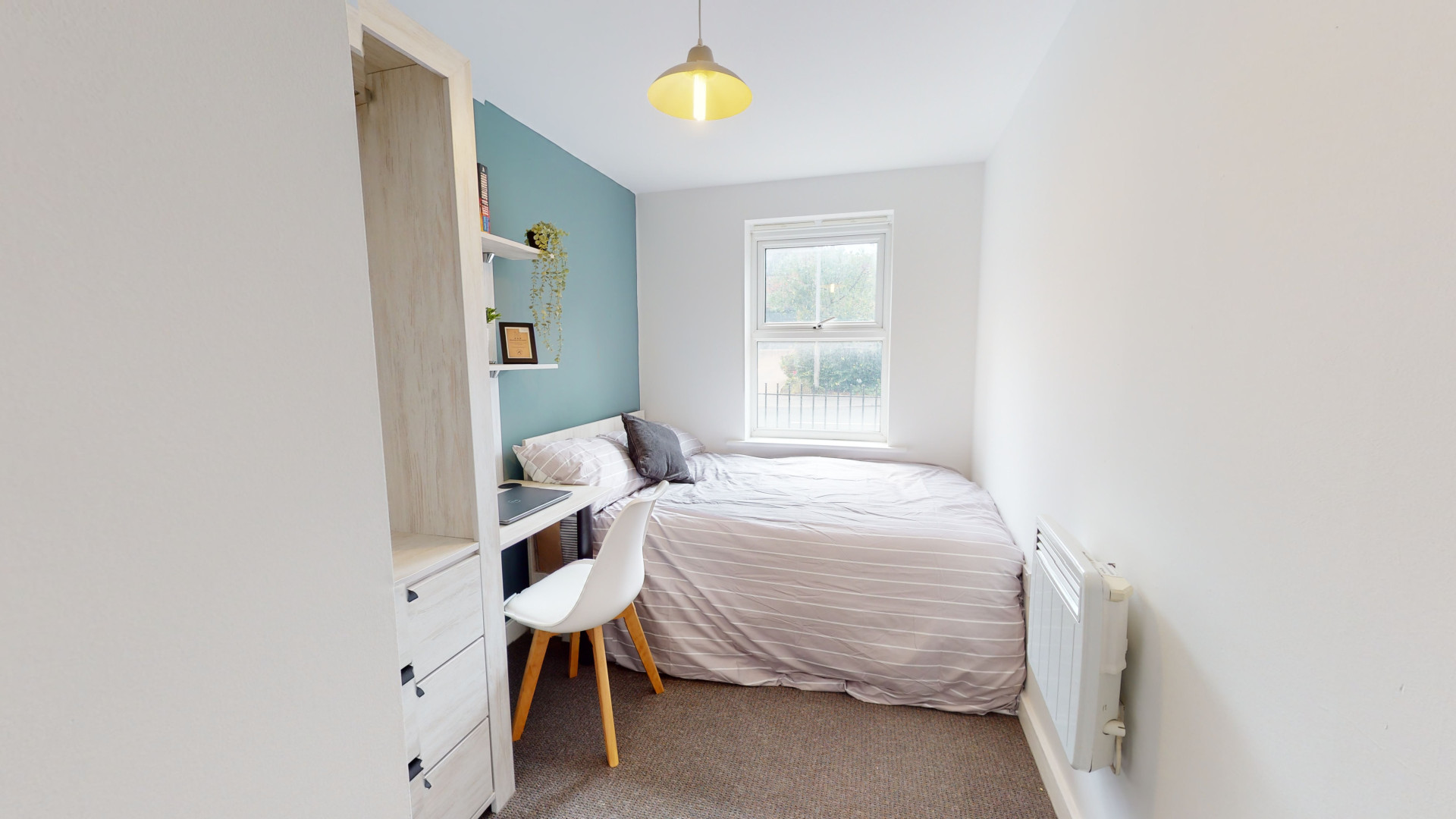 - Bedroom furniture: bed, desk, desk chair, wardrobe, and drawers