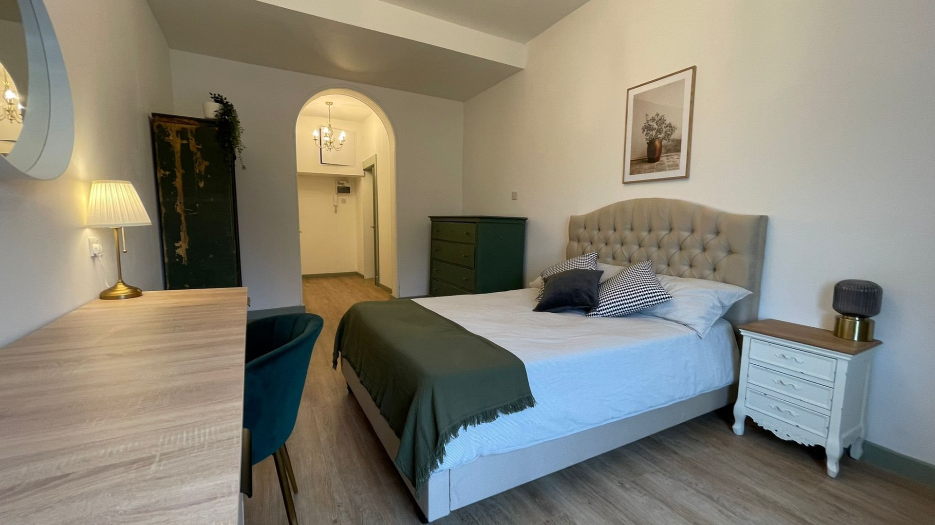 - Bedroom furniture: bed, desk, desk chair, wardrobe, and drawers