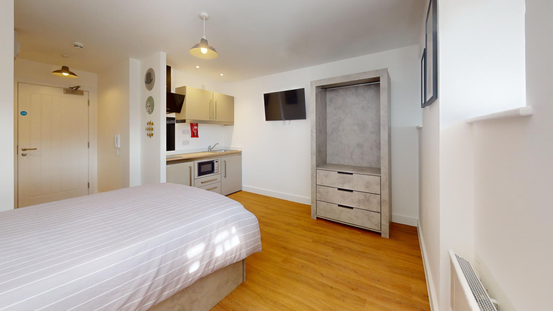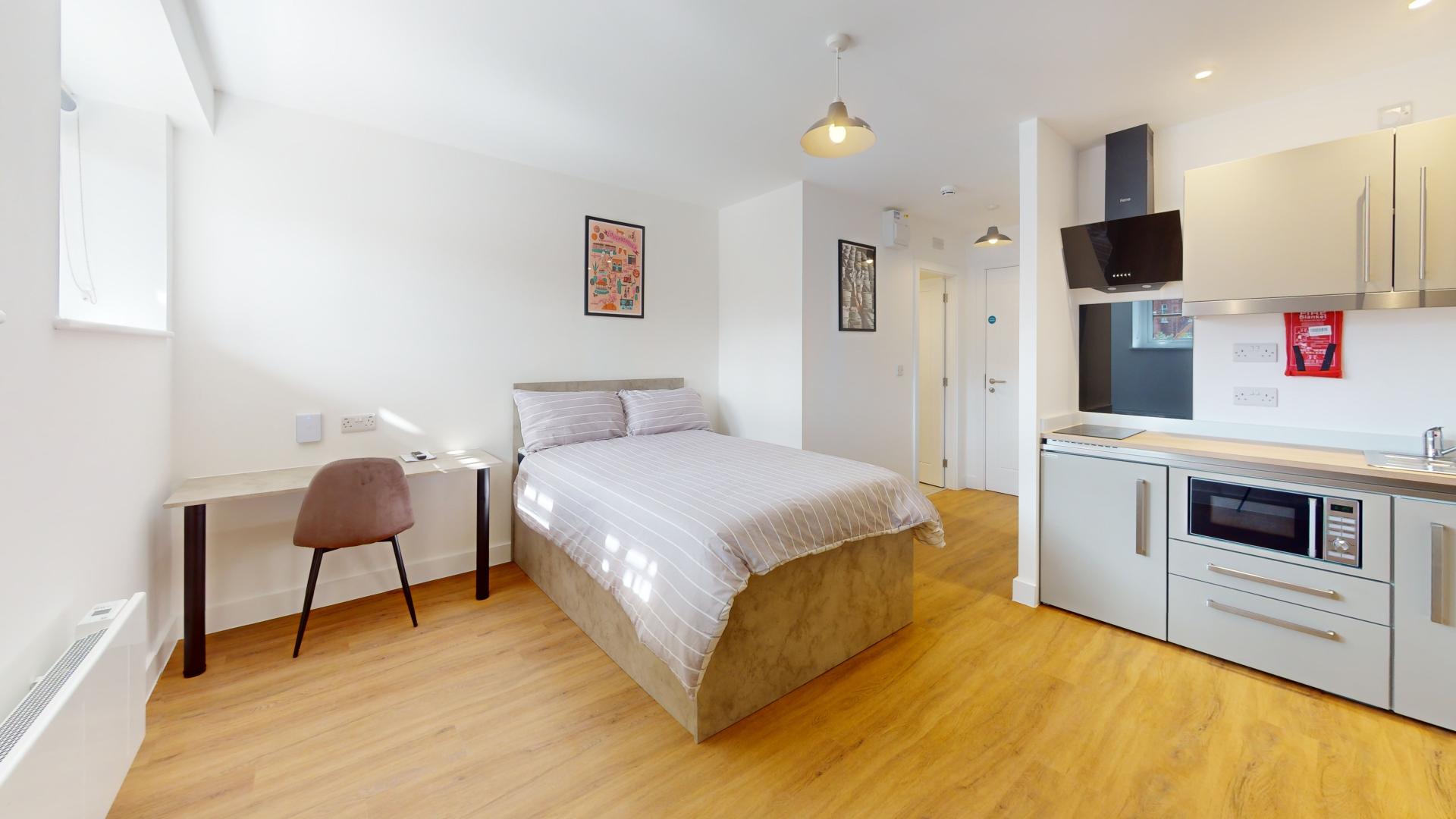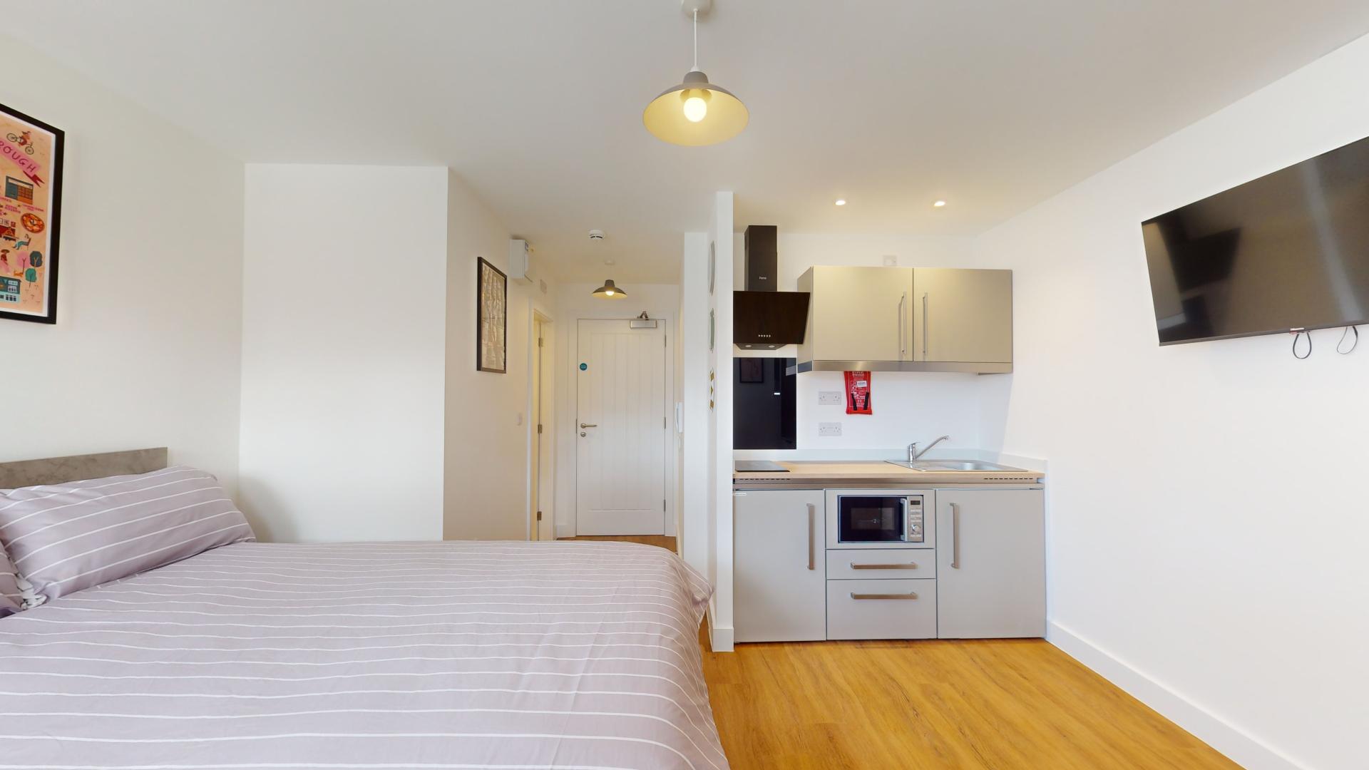 The studio offers a fully self-contained living space complete with an ensuite bathroom and a fully equipped kitchen, ensuring students have everything they need at their fingertips. Its prime location in the town centre places Tesco right next door, making grocery runs quick and hassle-free. Residents can also maintain an active lifestyle with the convenience of an onsite gym, while secure bike storage facilities provide peace of mind by protecting bicycles from potential theft or damage.