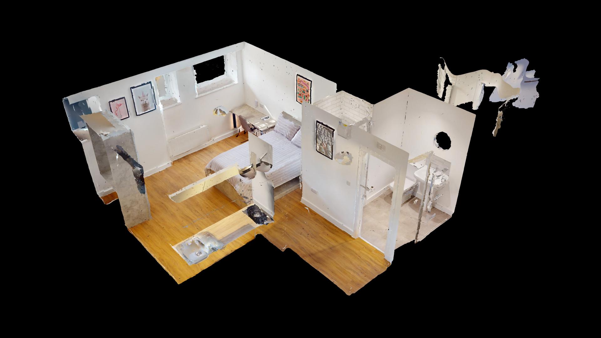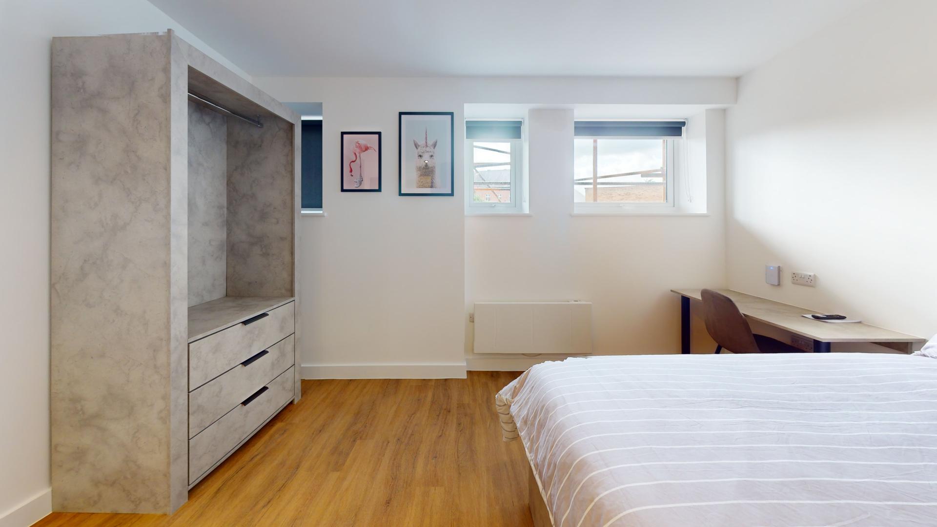 - Bedroom furniture: bed, desk, desk chair, wardrobe, and drawers