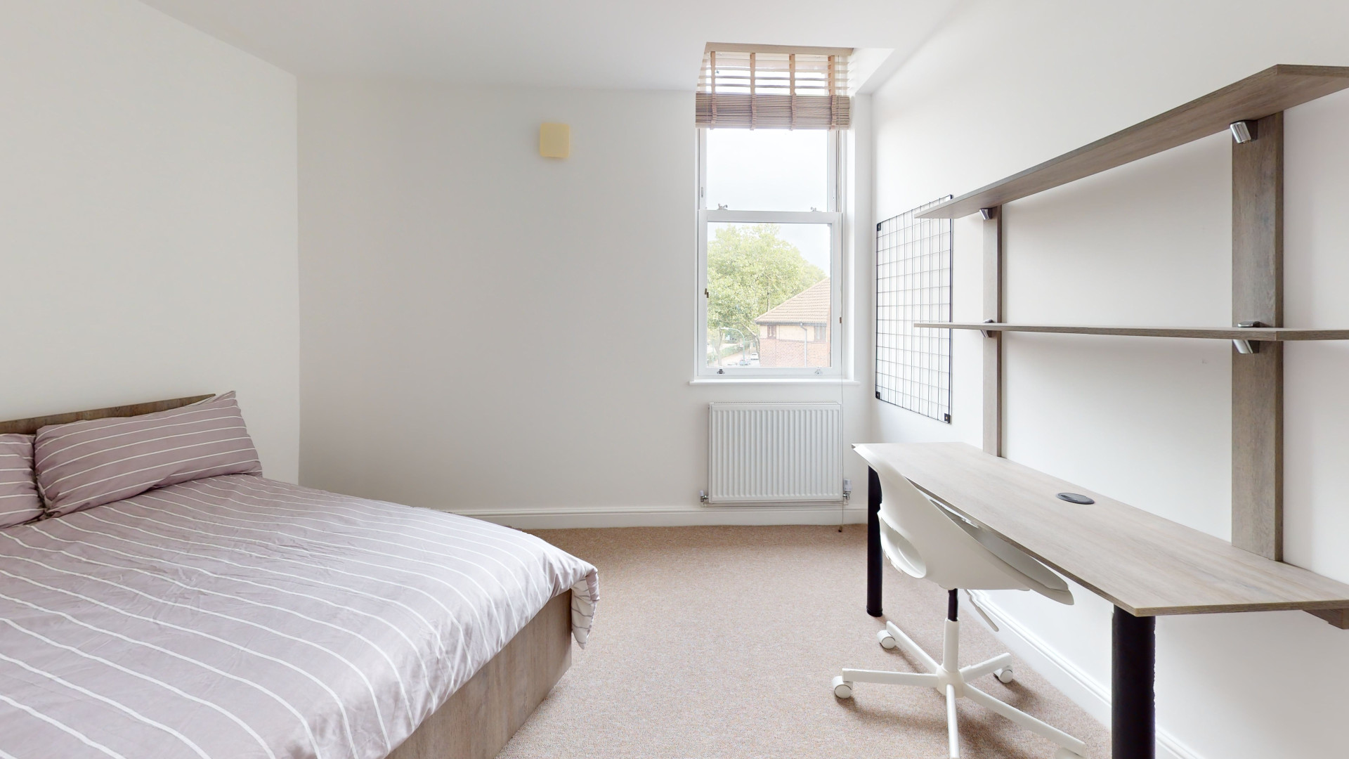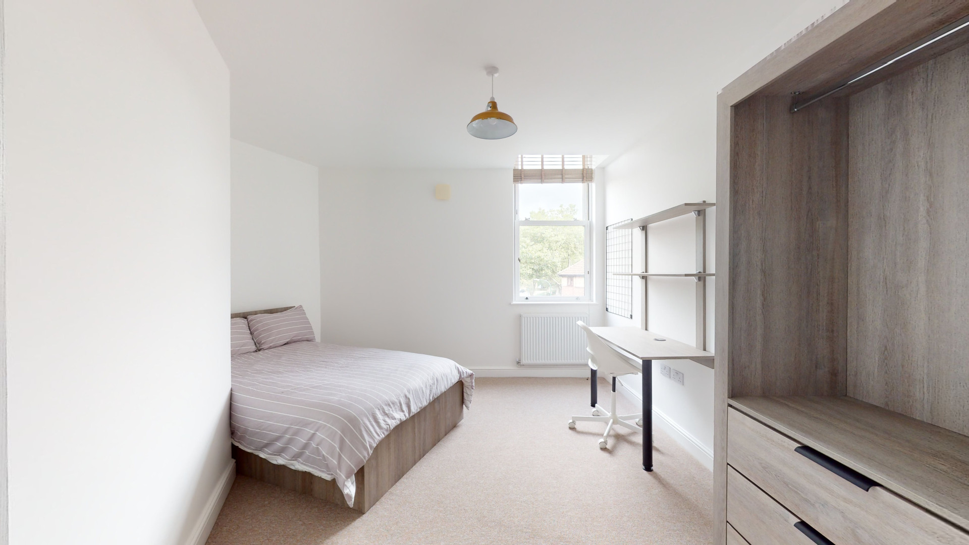 - Bedroom furniture: bed, desk, desk chair, wardrobe, and drawers