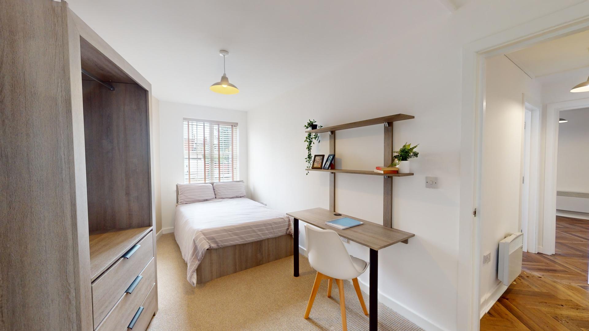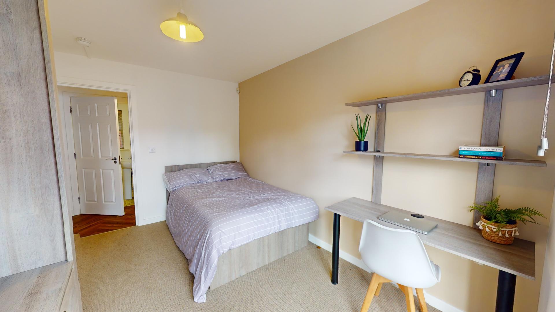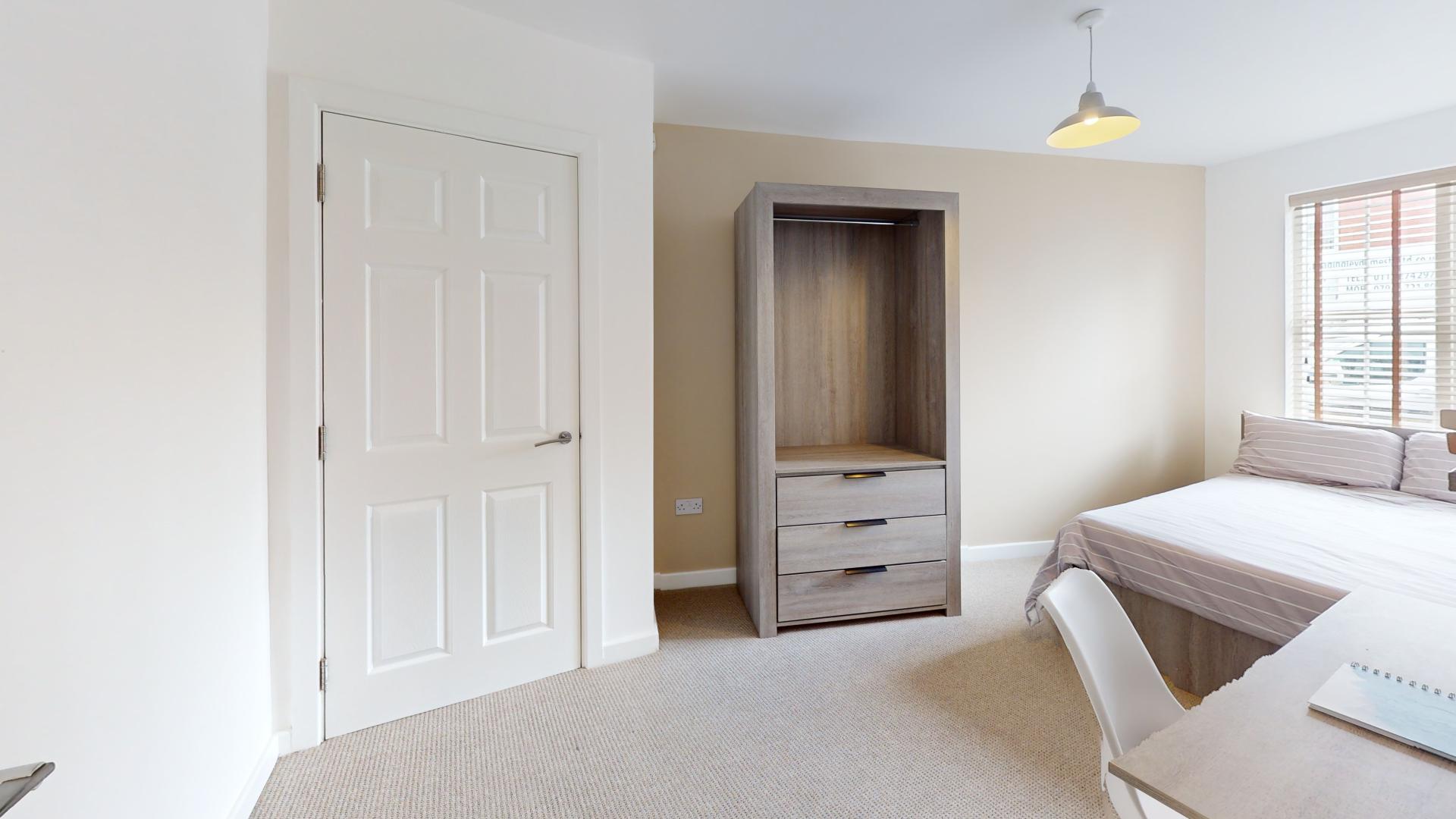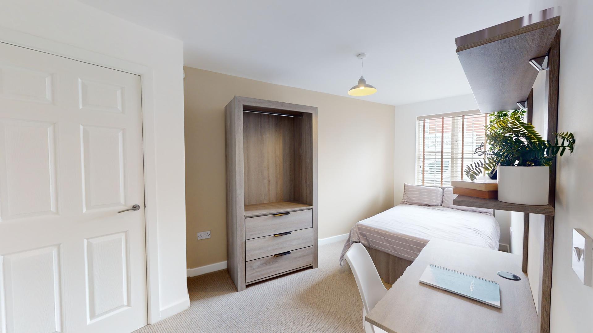 - Bedroom furniture: bed, desk, desk chair, wardrobe, and drawers