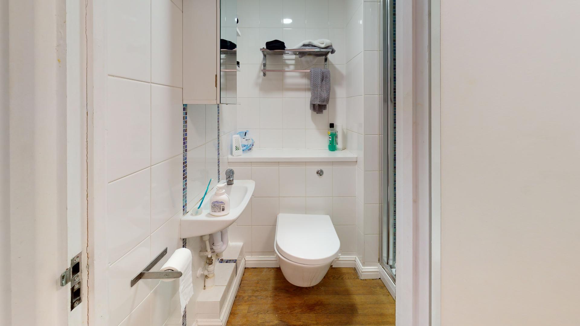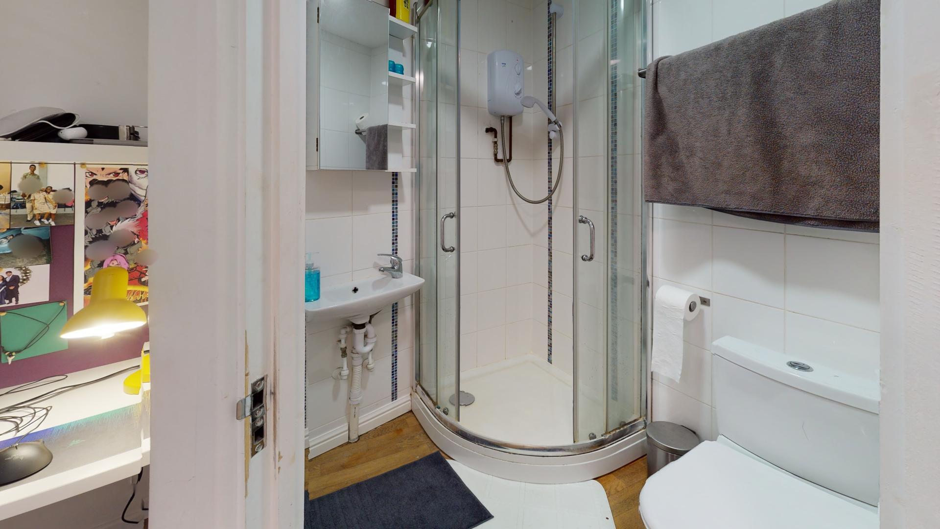 Each of the three spacious double bedrooms comes with its own en-suite bathroom and built-in storage. The apartment is fully equipped with modern fittings throughout, including a TV in the communal living room, long study desks, bookshelves, a dishwasher, and generous storage space. Additional amenities include CCTV, a secure fob entry system, and bike storage.