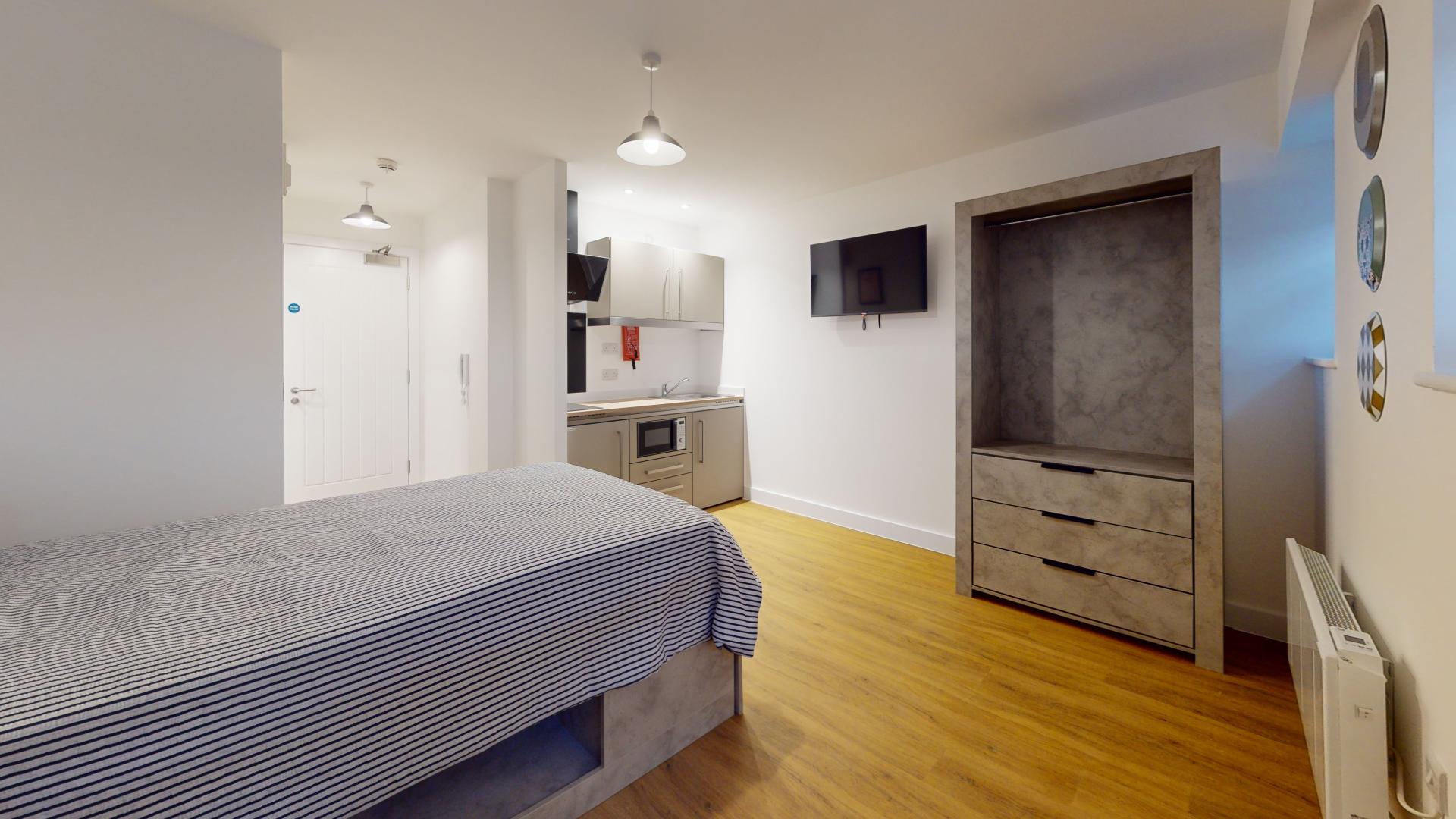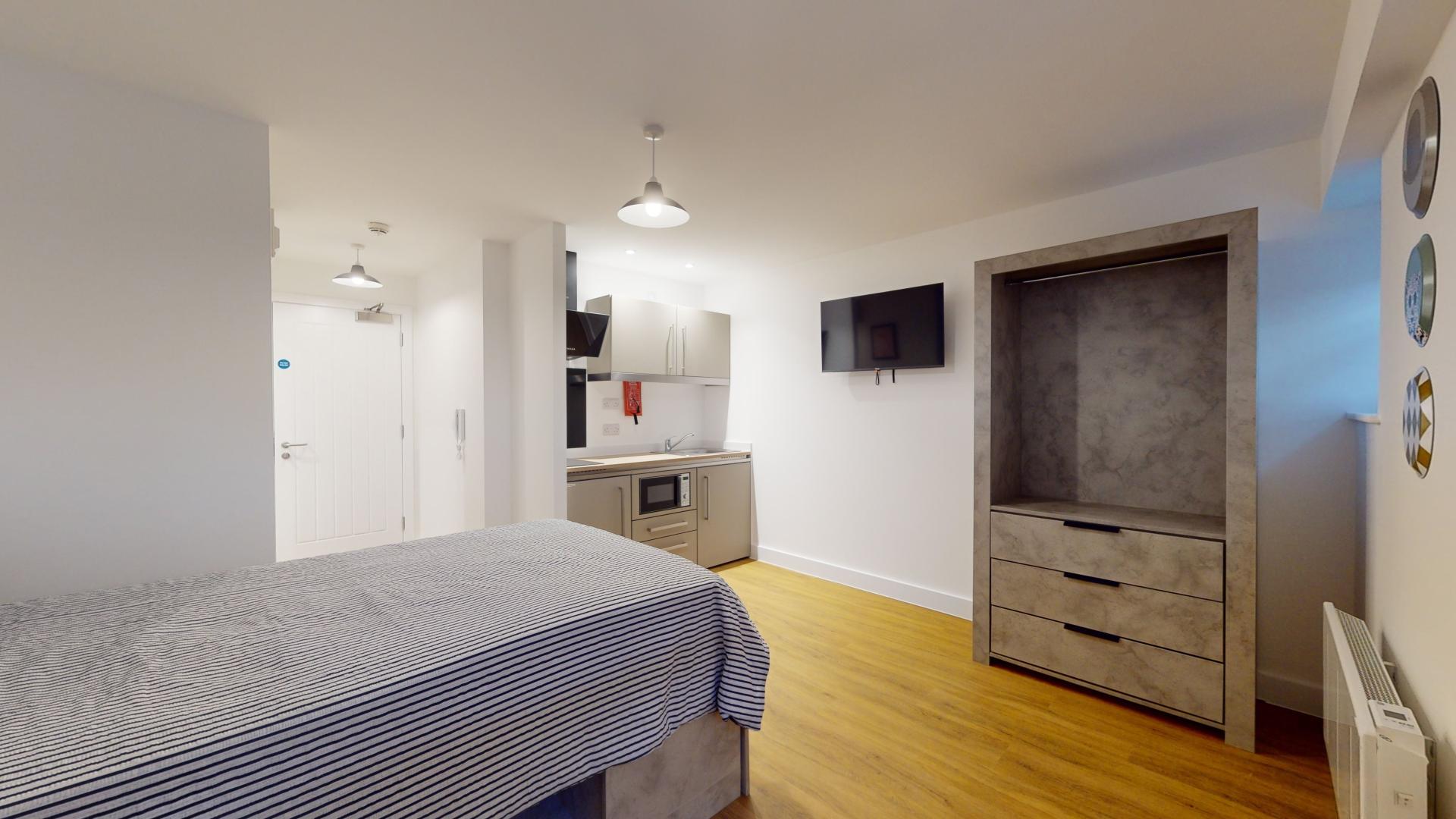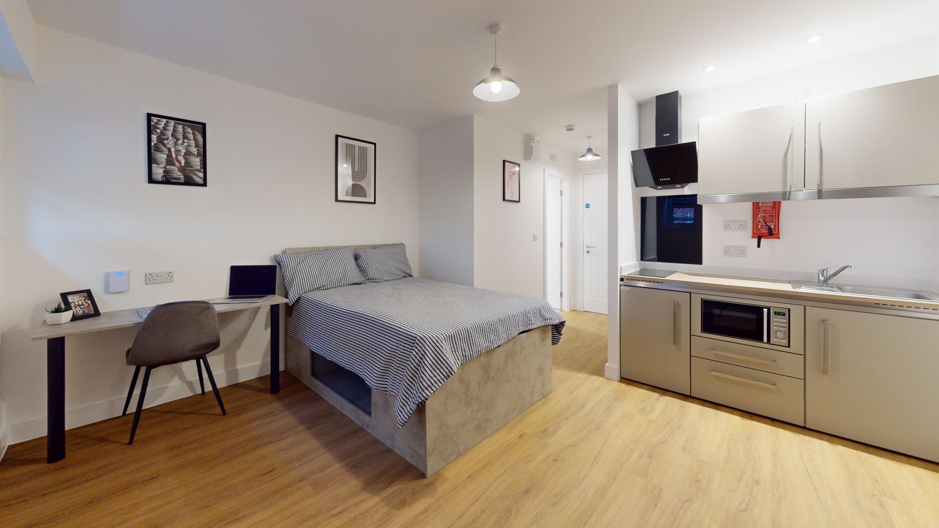 The studio offers a fully self-contained living space complete with an ensuite bathroom and a fully equipped kitchen, ensuring students have everything they need at their fingertips. Its prime location in the town centre places Tesco right next door, making grocery runs quick and hassle-free. Residents can also maintain an active lifestyle with the convenience of an onsite gym, while secure bike storage facilities provide peace of mind by protecting bicycles from potential theft or damage.