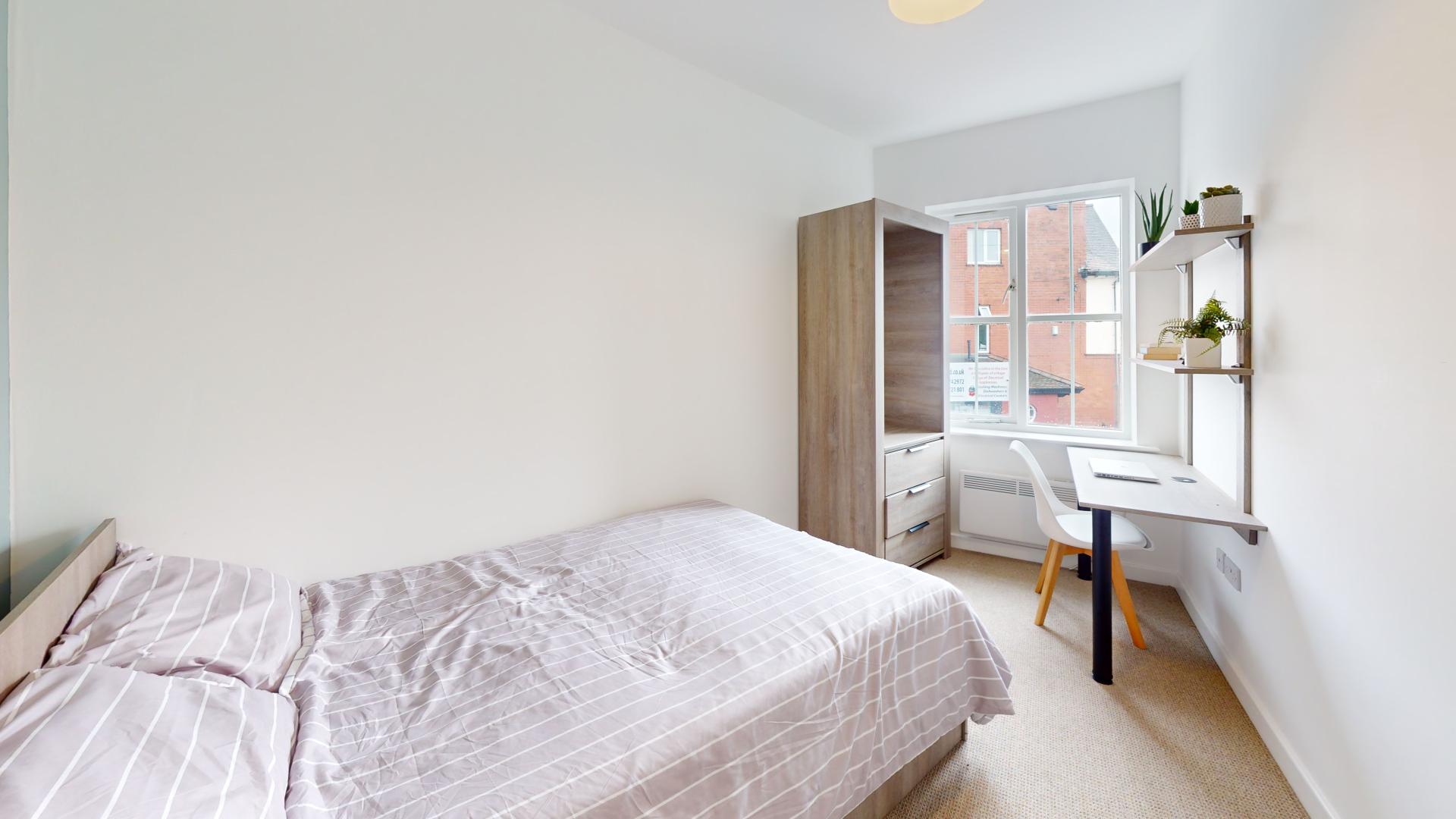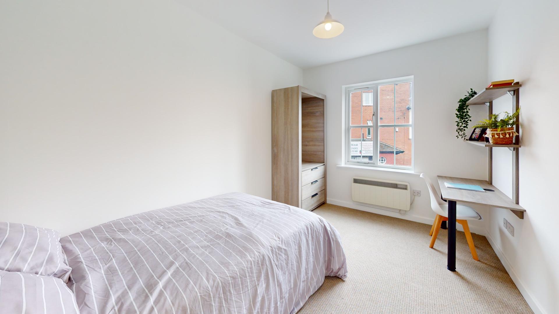 - Bedroom furniture: bed, desk, desk chair, wardrobe, and drawers