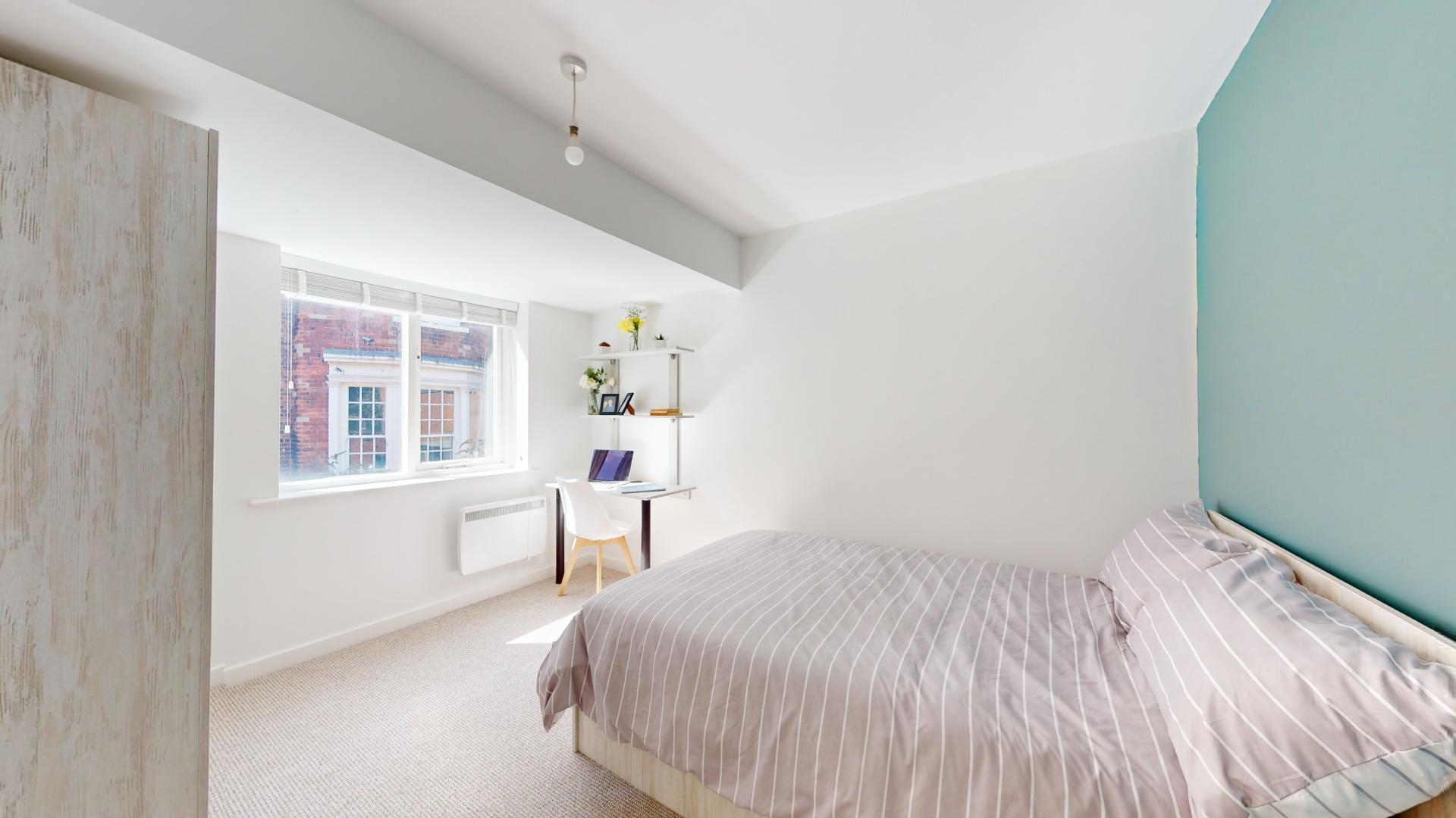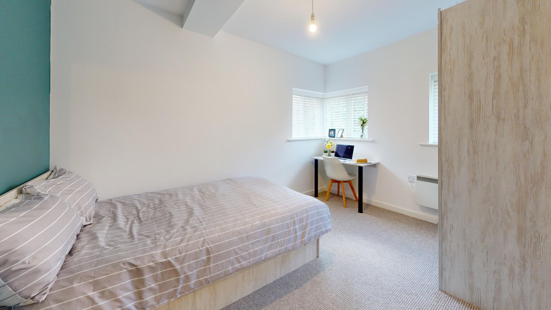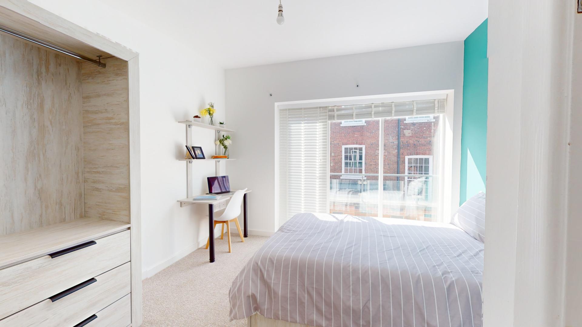 - Bedroom furniture: bed, desk, desk chair, wardrobe, and drawers